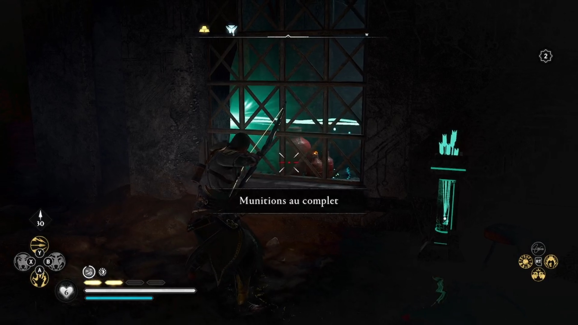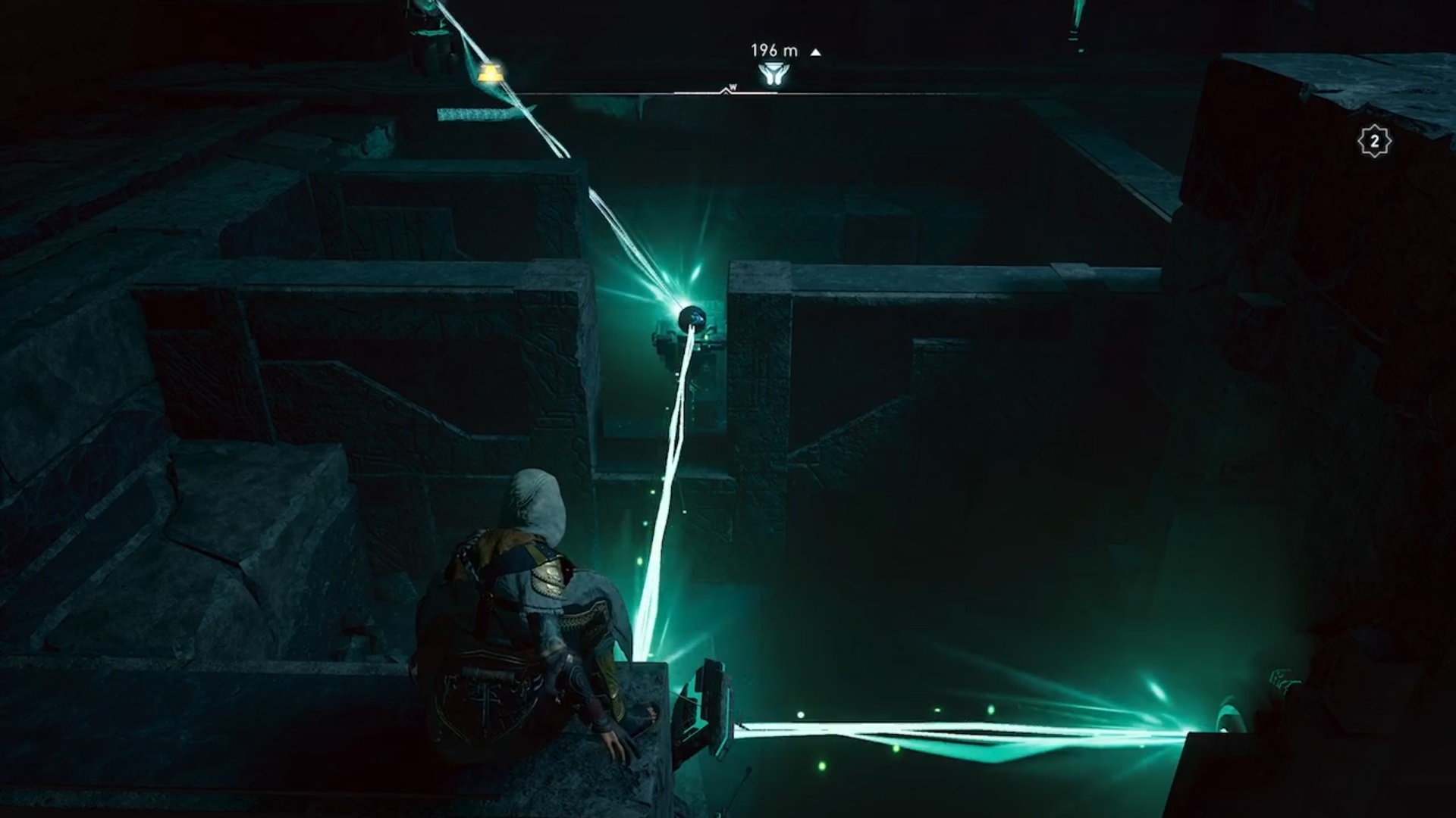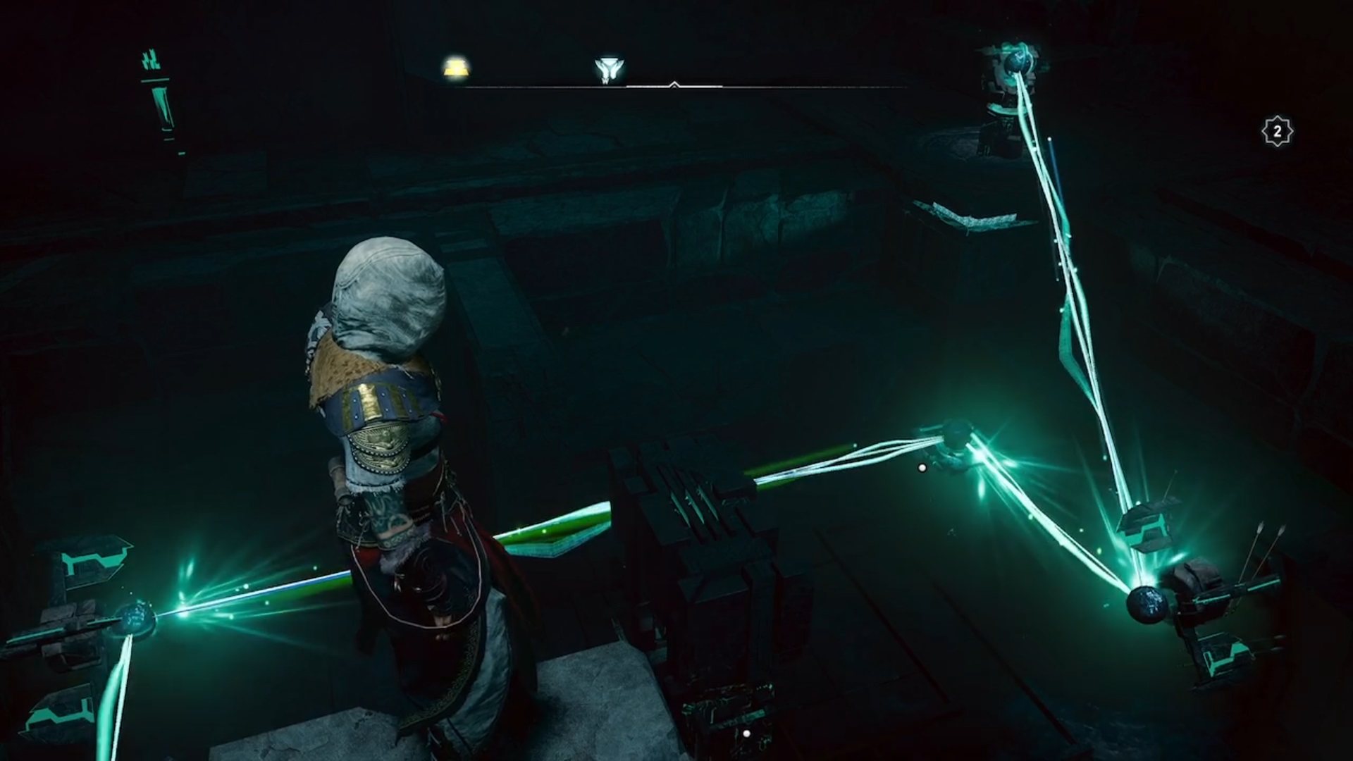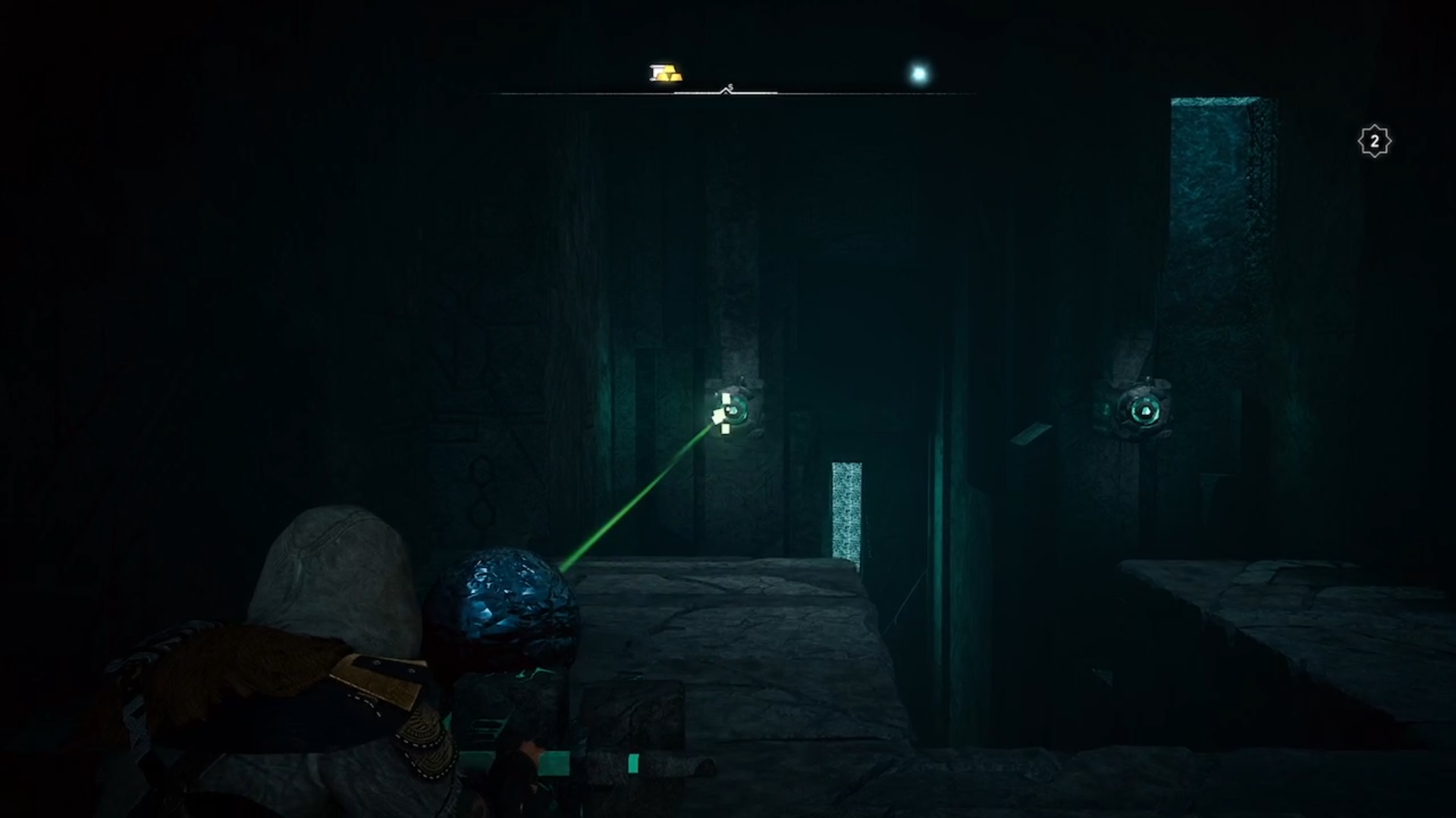 Dans la troisième salle, détruisez les planches de bois et guidez la lumière vers l’interrupteur en déplaçant les obstacles. Eivor tombe à l’étage inférieur où vous devez guider deux faisceaux de lumières vers deux interrupteurs pour déverrouiller une orbe. Le premier faisceau de lumière est caché derrière un mur. Tirez sur les jarres pour faire jaillir la lumière. Suivez-la et déplacez les obstacles l’empêchant d’avancer. Le deuxième faisceau est caché au-dessus d’un échafaudage. Conduisez les lumières vers les interrupteurs pour déverrouiller l’orbe. Avec l’orbe en main, déverrouiller la troisième et dernière porte.