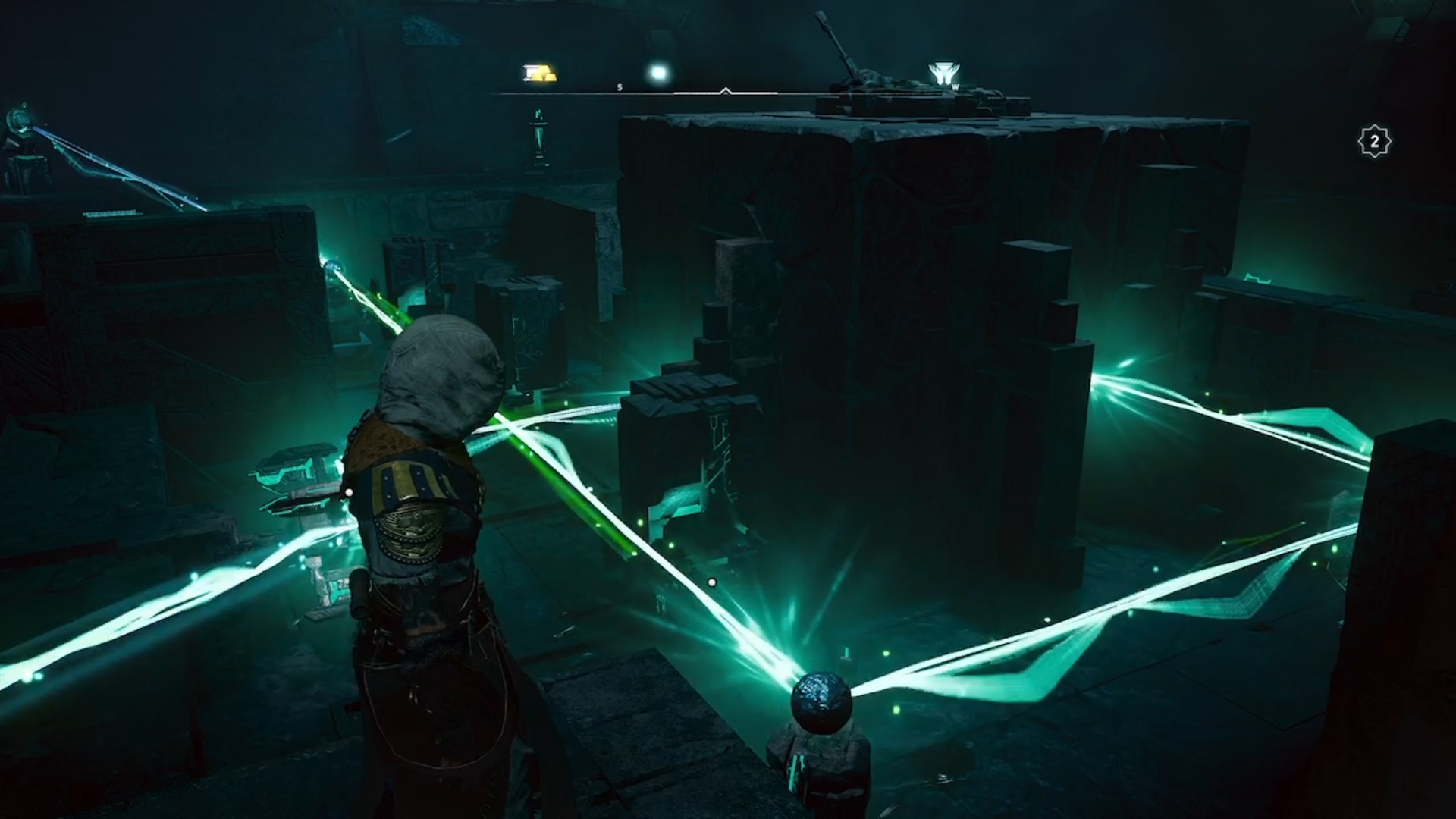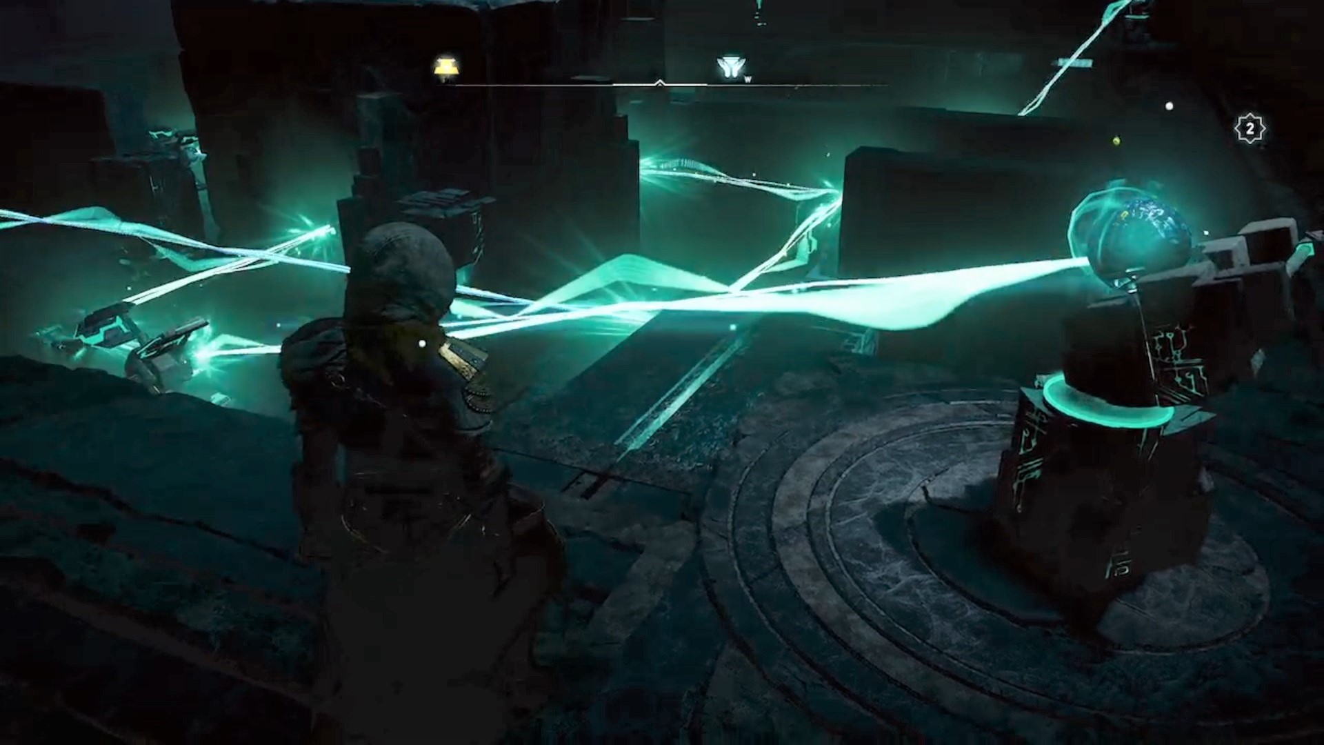 Dans la salle suivante. Déplacez les faisceaux d’énergies tels que nos screenshots ci-dessus pour alimenter la plateforme centrale. Récupérer l’orbe au centre et retournez à l’anneau. Placez l’orbe dans l’un des faisceaux de l’anneau pour ouvrir la porte à deux verrous.