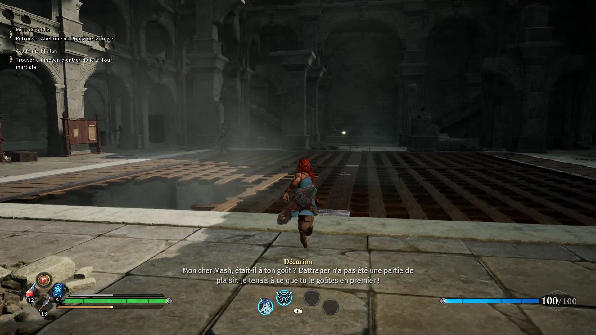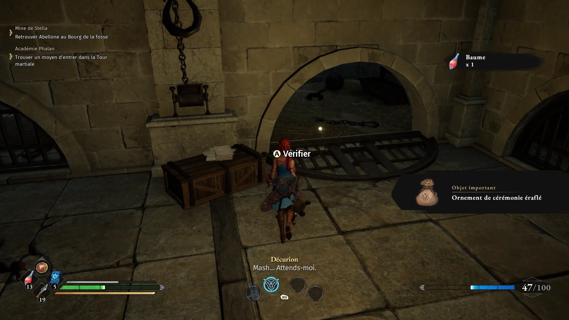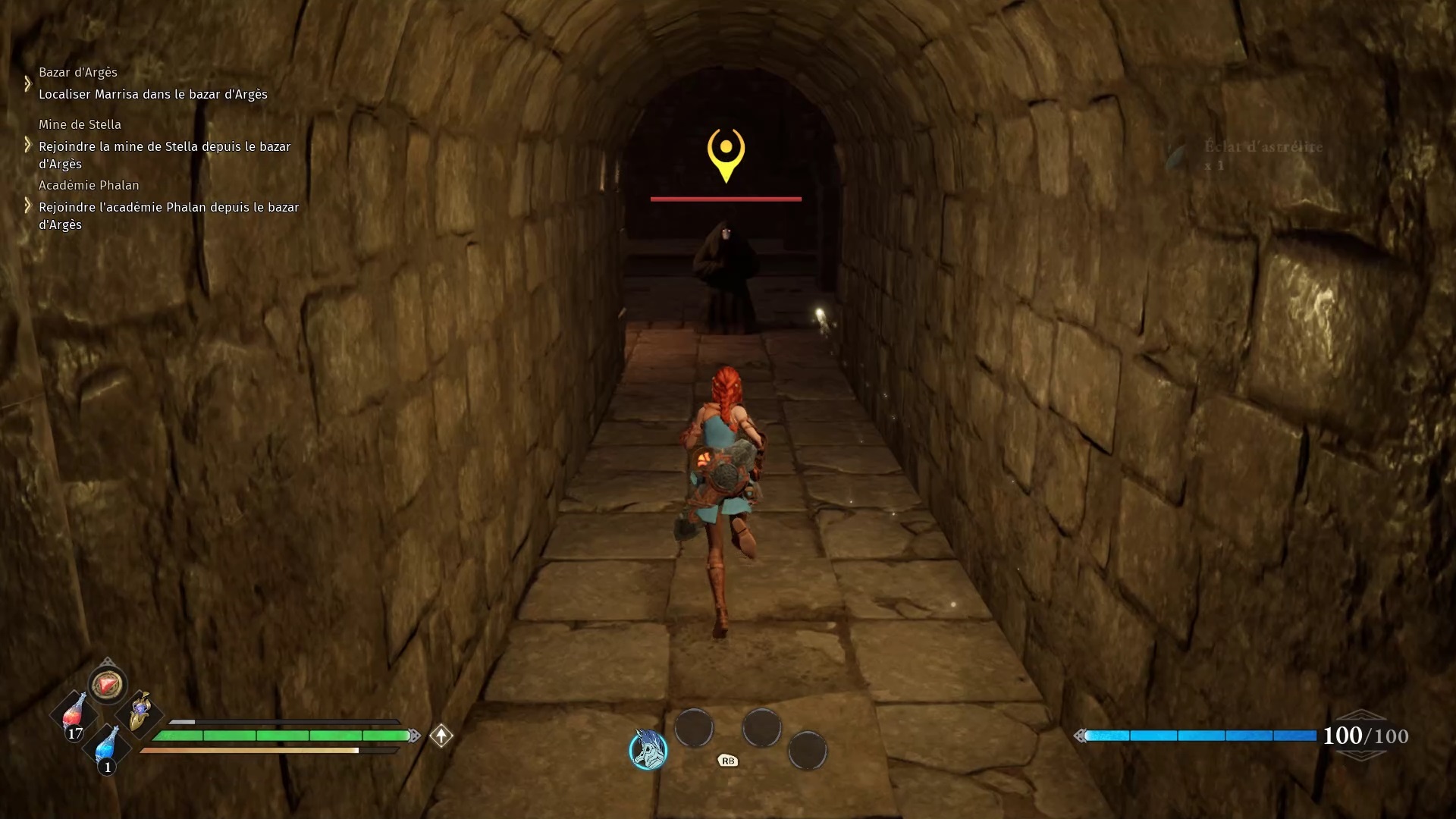 Indicate your intentions to Abellone and descend with the elevator to his right. Clear the square to take a second elevator straight ahead. At the foot of the mine, go under a structure to meet a mysterious character. Take care, it attacks you, defend yourself. The main threats will come from his ranged weapons. Dodge his attacks then attack him to knock him out. After the fight, talk to him to reveal his identity.