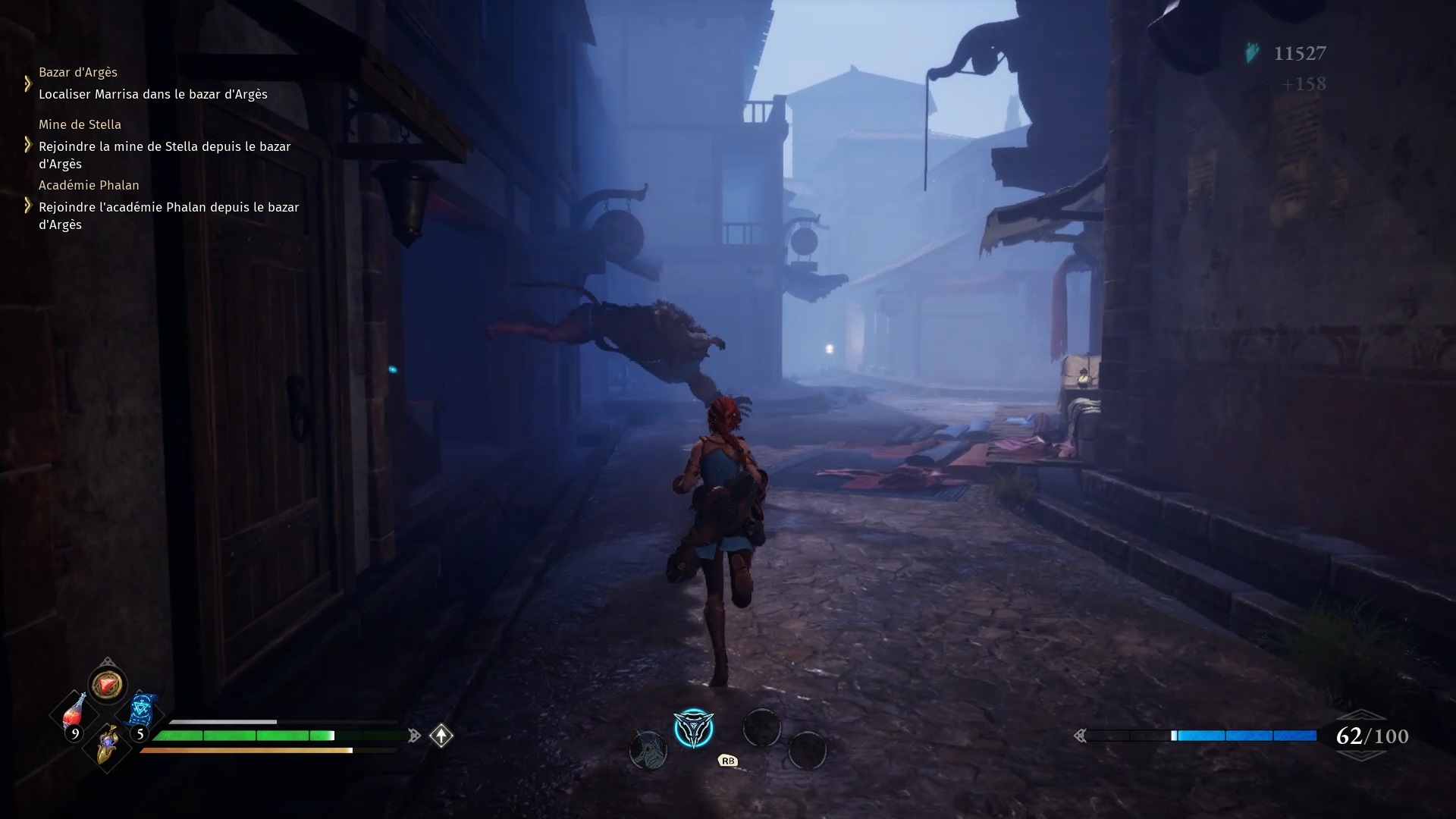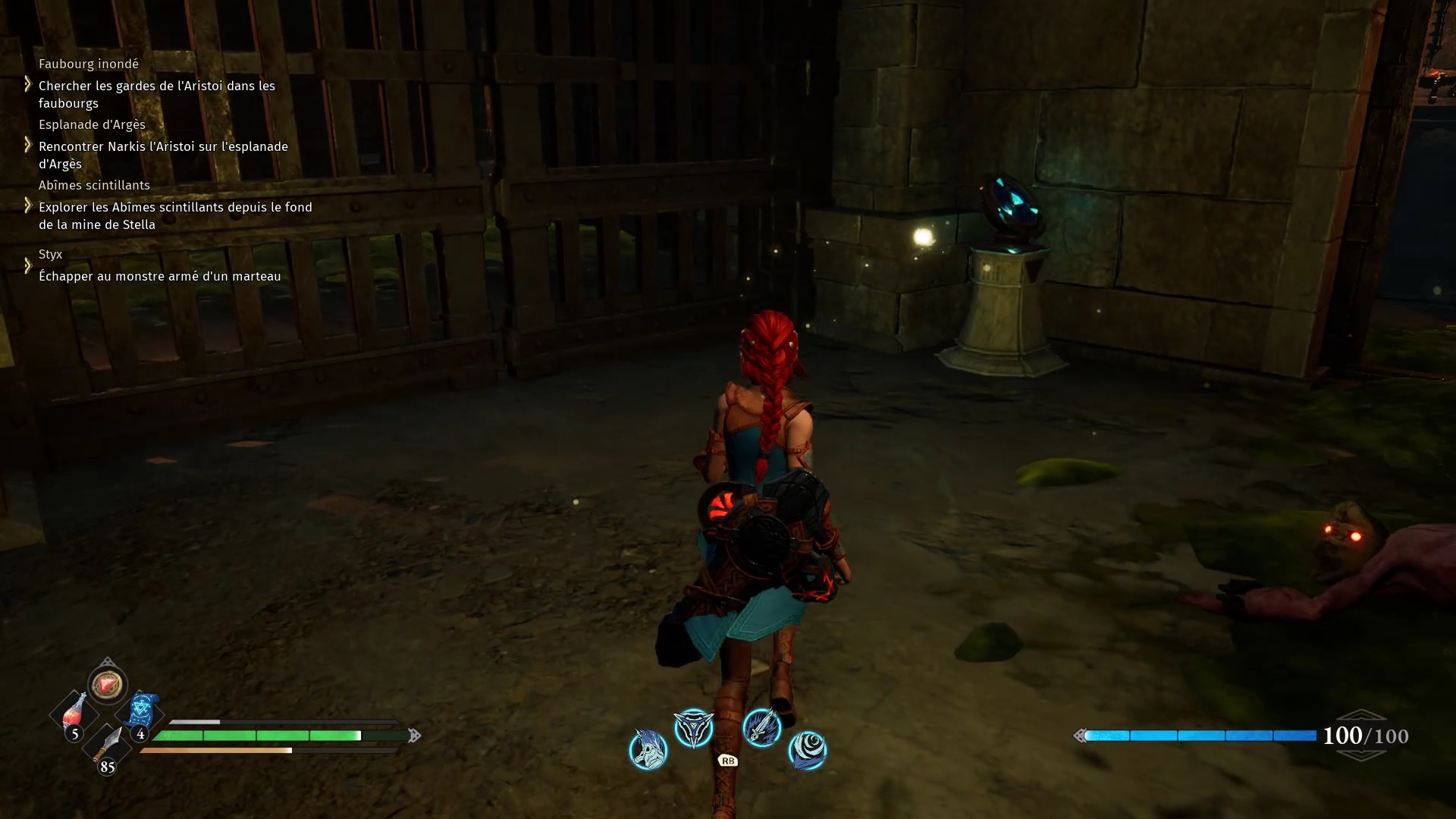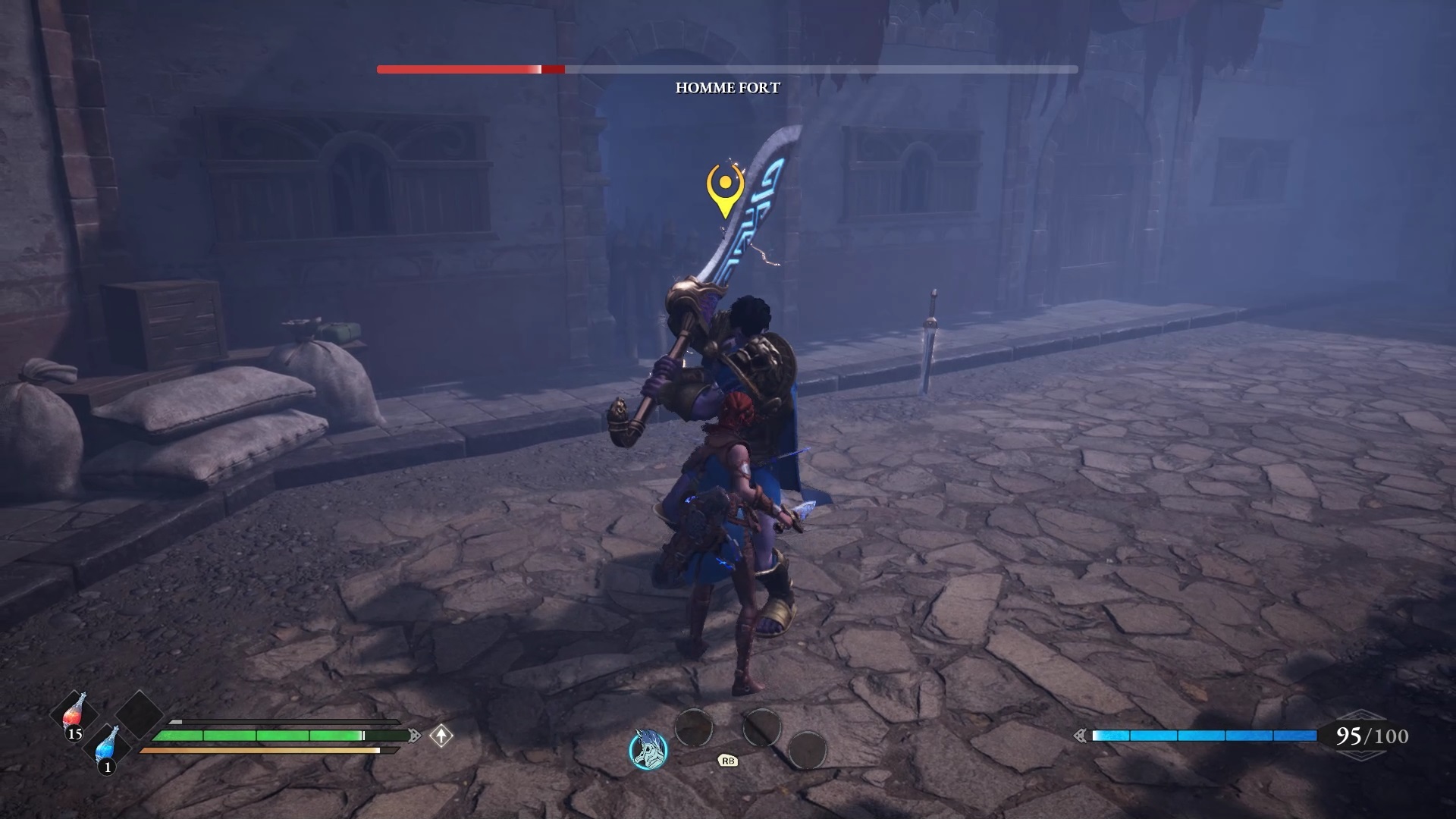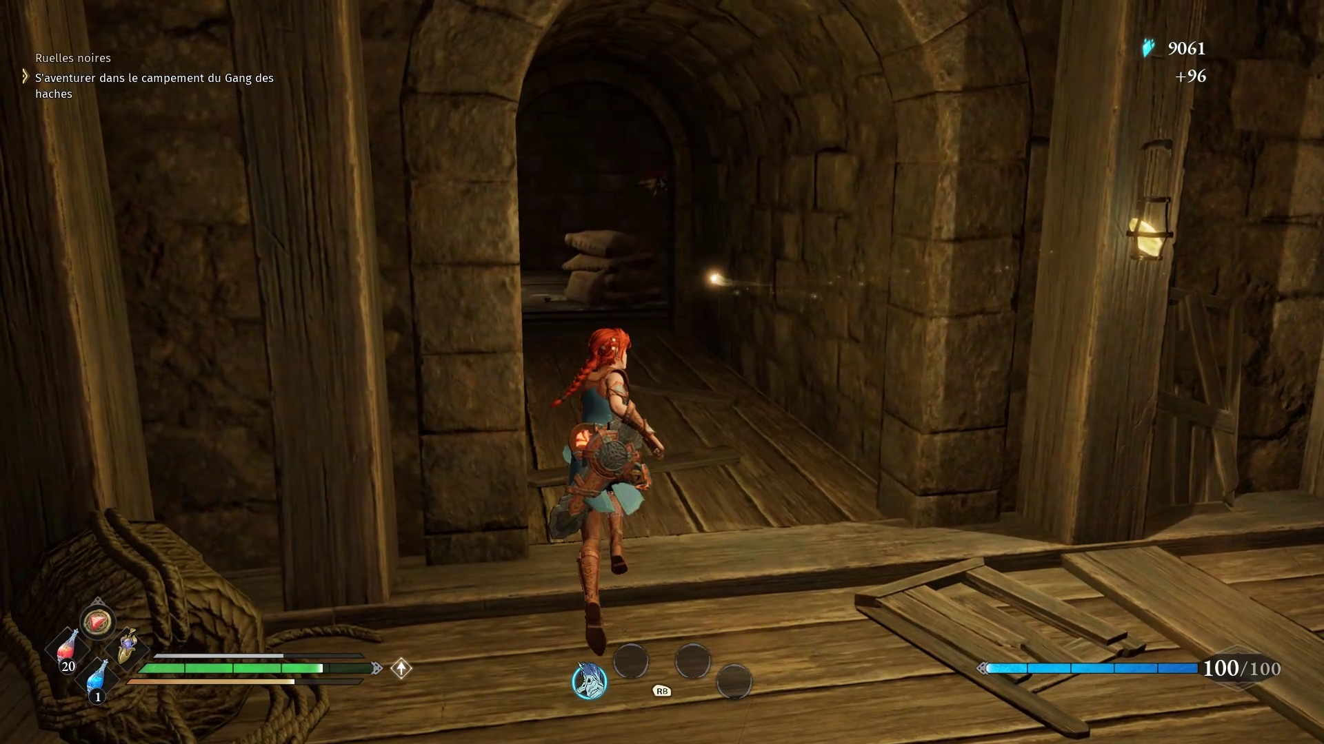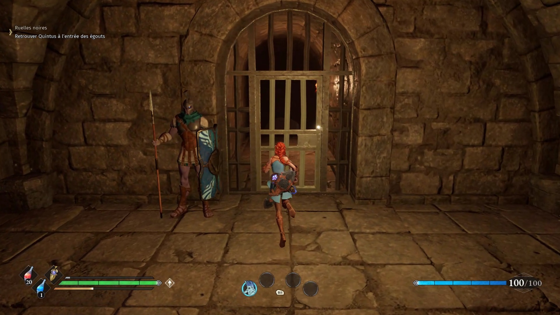 Minerva gives you a glow. Activate the item in your inventory to light your way (like in Dark Souls). Head behind Strong Man aka Bion to find a guard in front of a gate. Go through the gate to find the path from the sewers to the Black streets. Go deeper into the tunnels following the tutorial to find your way outside. Move towards the wooden structures to find a beggar. This one is cowardly shot by a bandit, eliminate it.