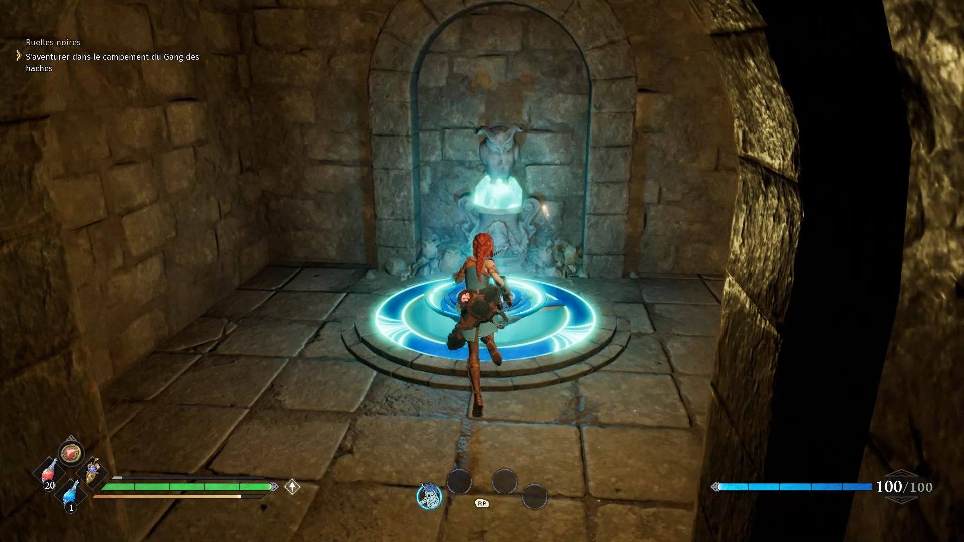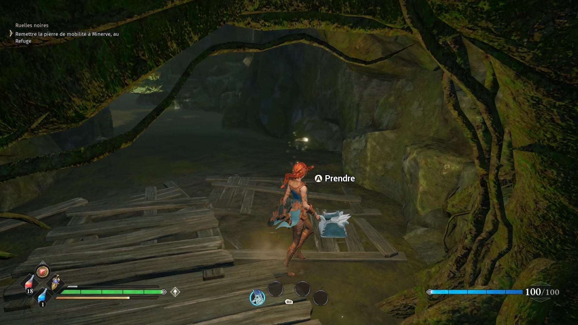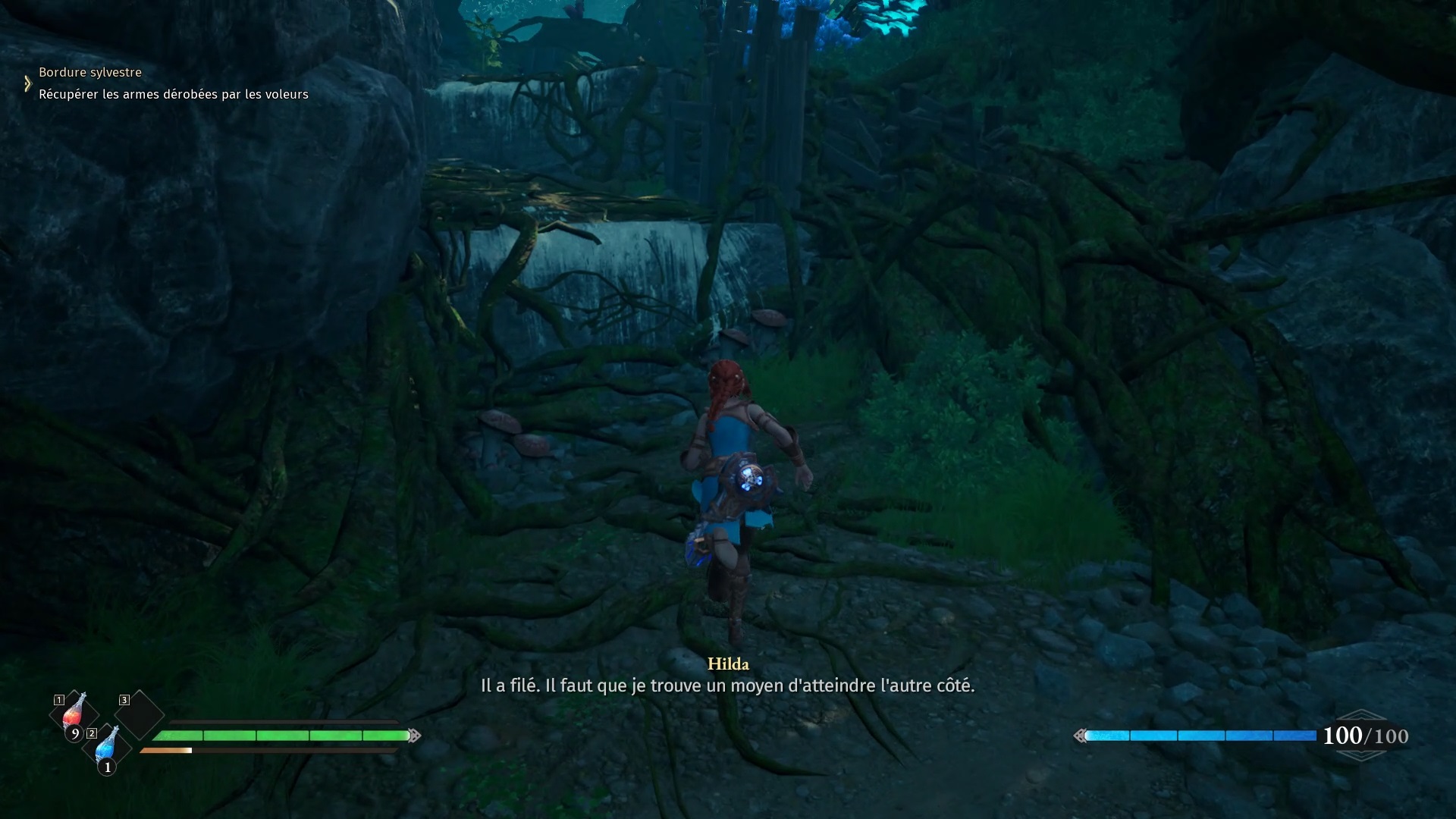 When he manages to sow you, continue your way by climbing on the stone platforms. Climb to find a descent. Activate the armillary sphere to create a checkpoint. Move forward to find the equipment thief. Fight his allies and break his magic shield to destroy him. Collect your gear from the stone altar to unlock the area. With your equipment, move forward and pass a tree trunk to reach a pond.