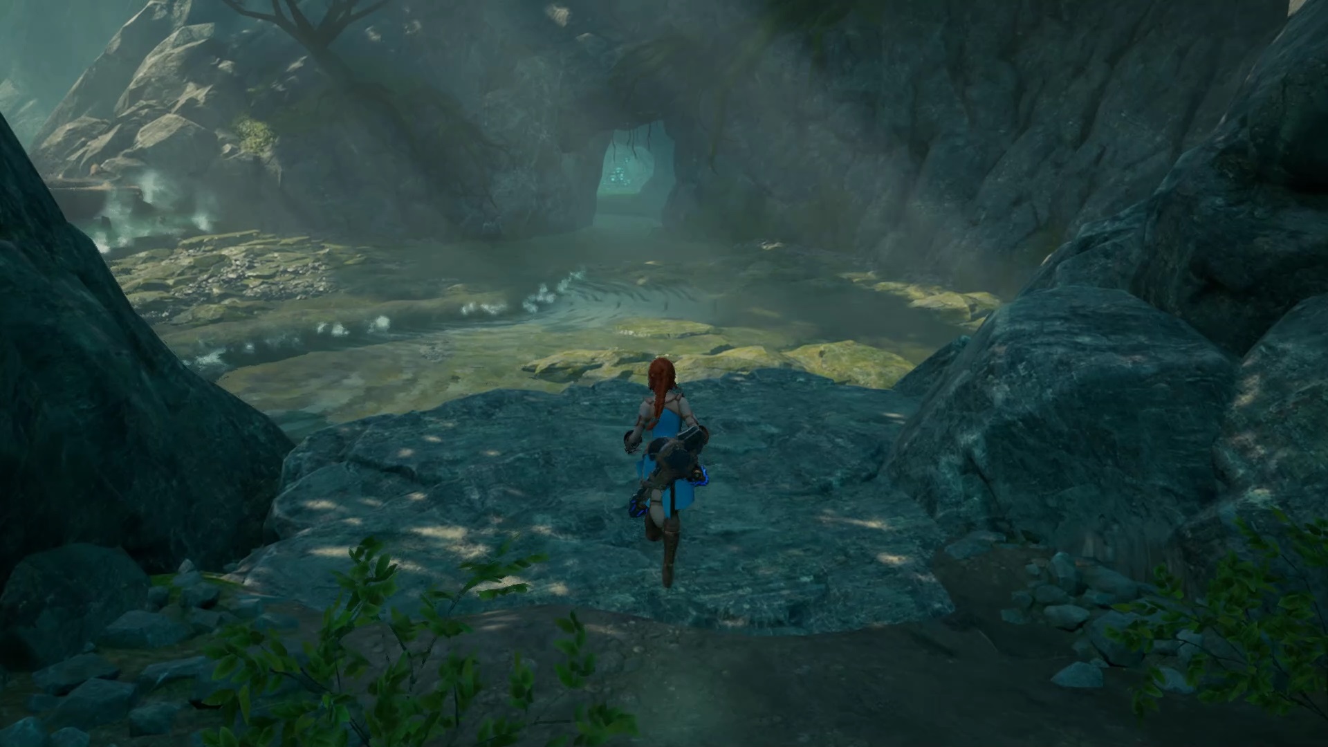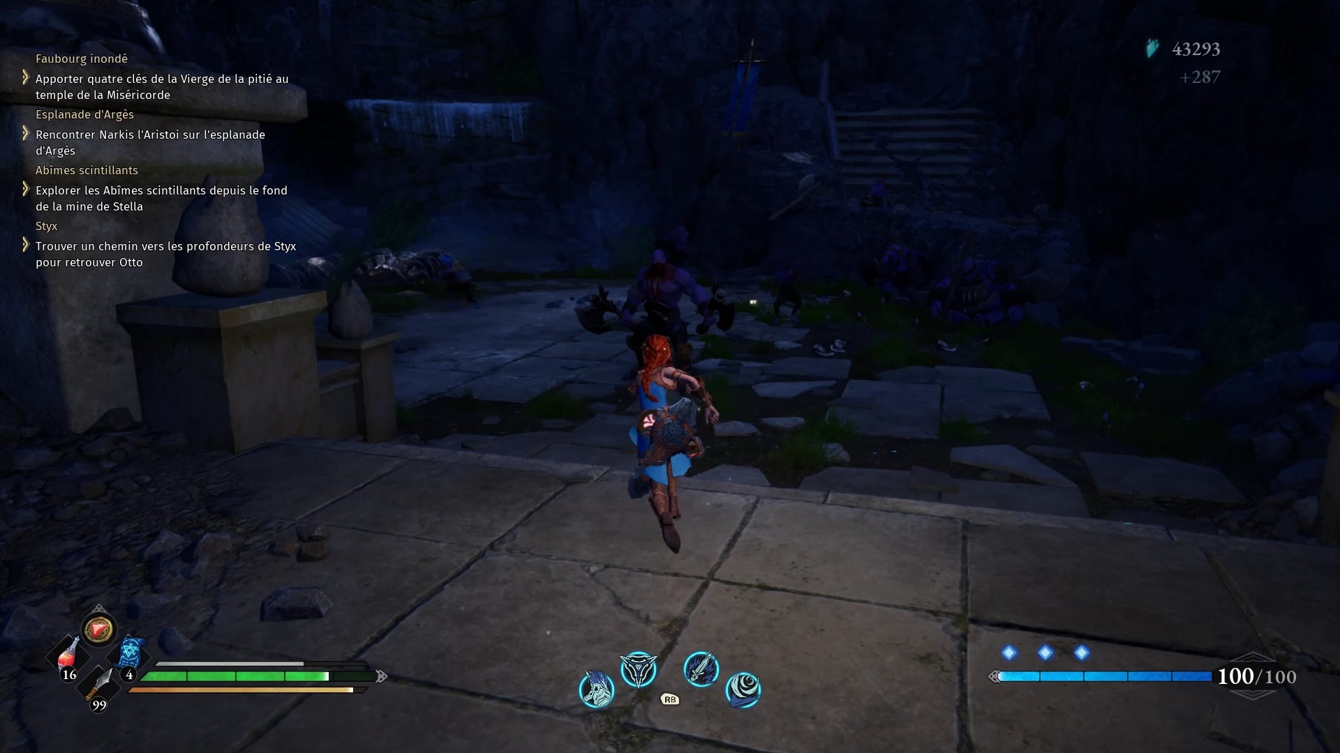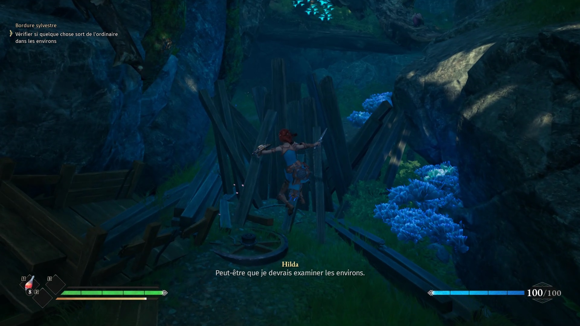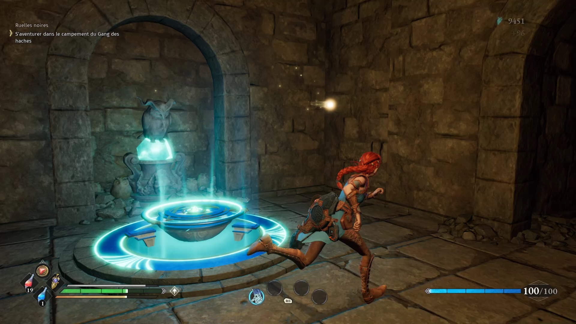 When he manages to sow you, continue your way by climbing on the stone platforms. Climb to find a descent. Activate the armillary sphere to create a checkpoint. Move forward to find the equipment thief. Fight his allies and break his magic shield to destroy him. Collect your gear from the stone altar to unlock the area. With your equipment, move forward and pass a tree trunk to reach a pond.