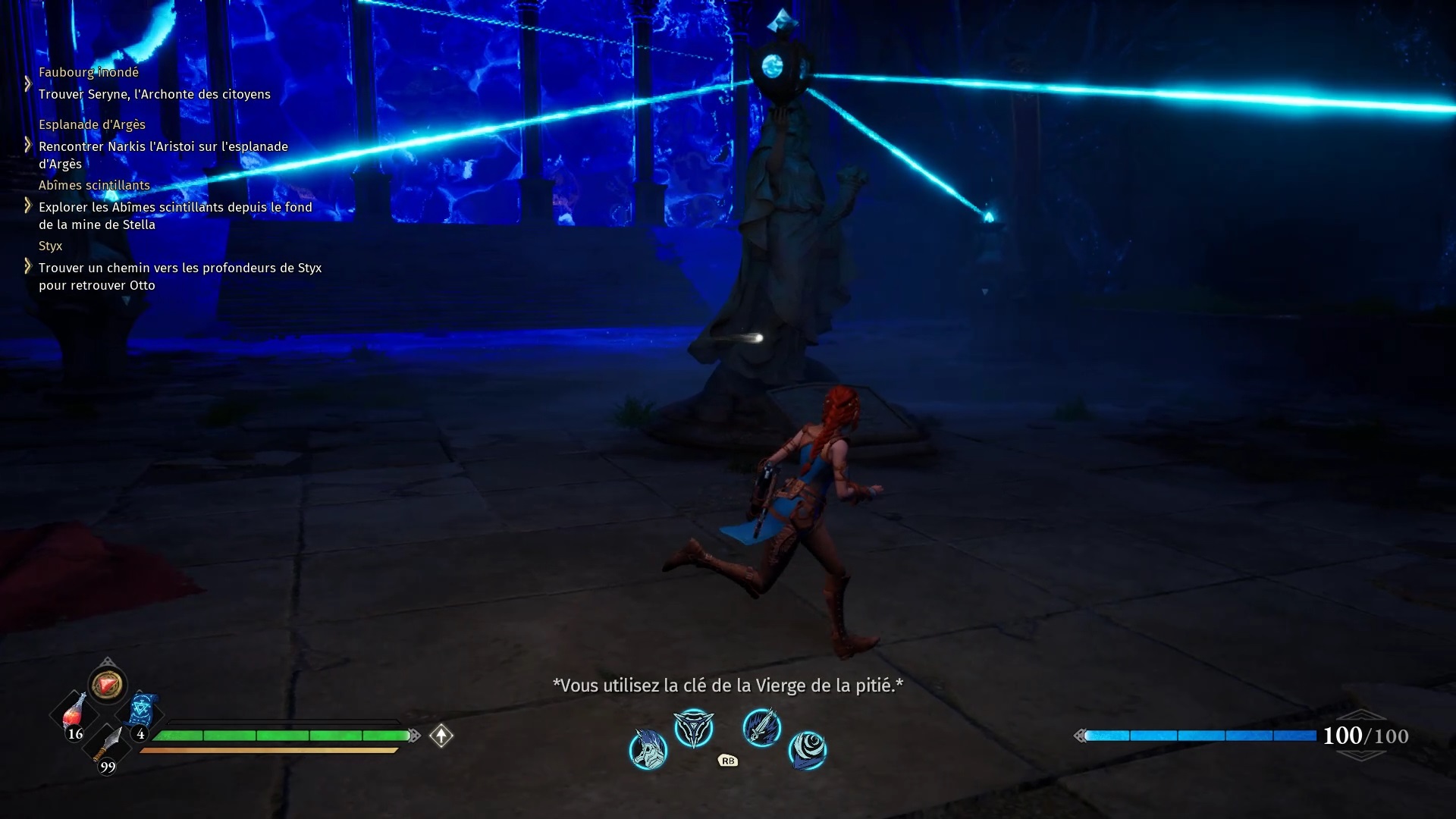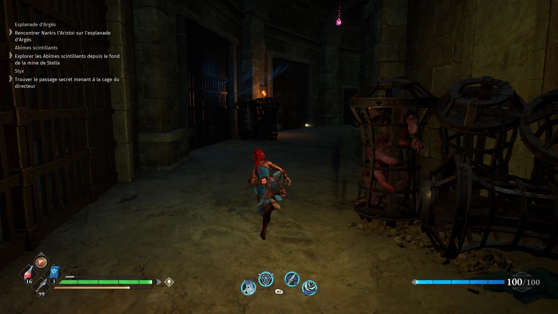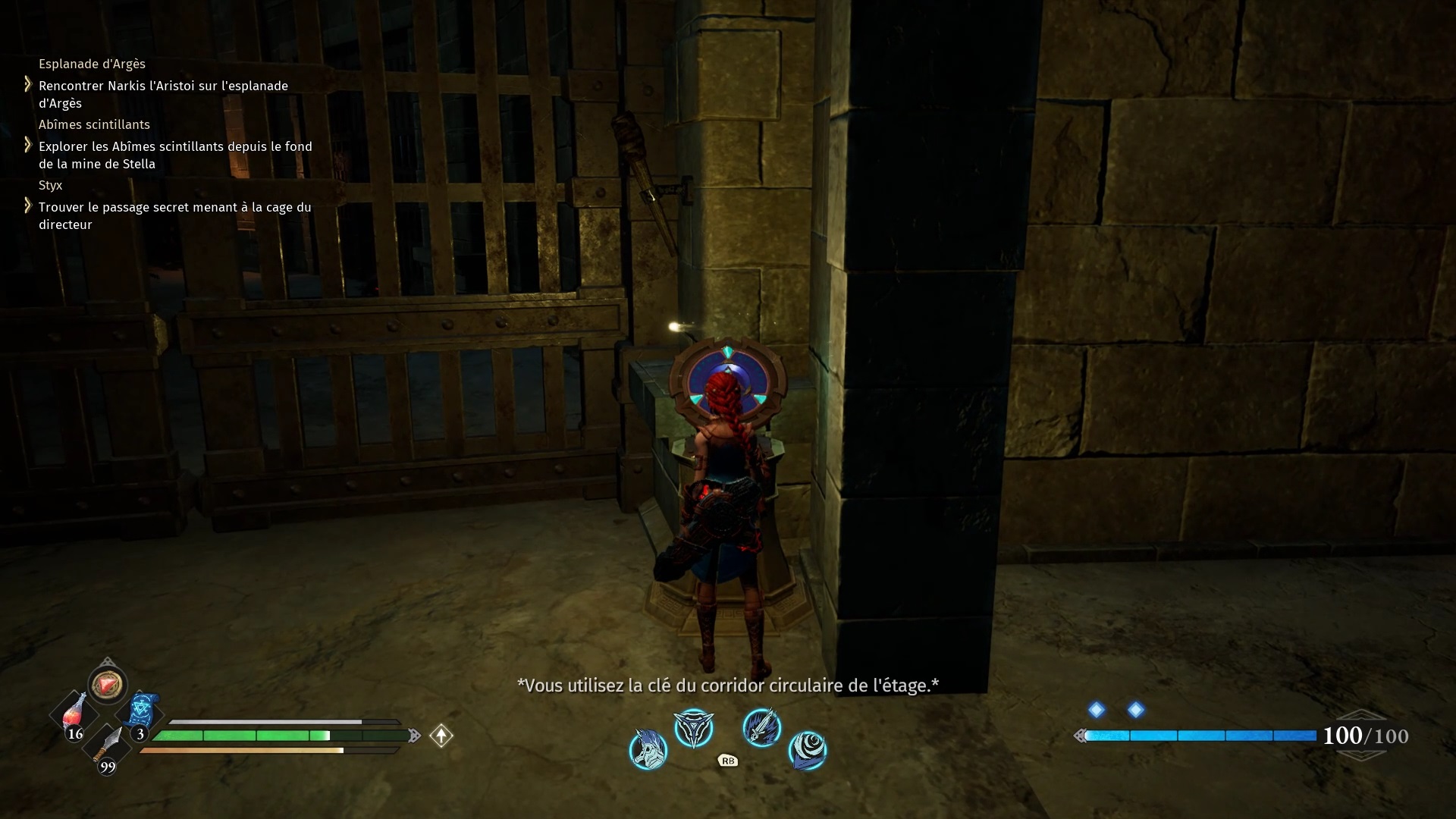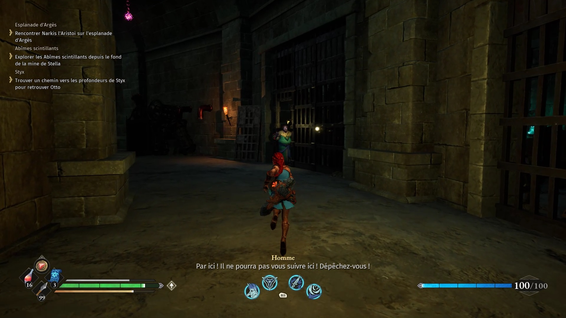 Let’s go back to the Styx where we left Otto. The door is now open. If you don’t have a checkpoint, you can find the passage of the Styx at the Academy. Once at the Styx, climb the stairs to reach the cells. Hilda examines the gun on the ground and a bully falls on top of her. Don’t waste your time fighting him flee to the opposite side. Be careful of the lasers in the hallway and open the first gate. A second grid awaits you at the bottom.