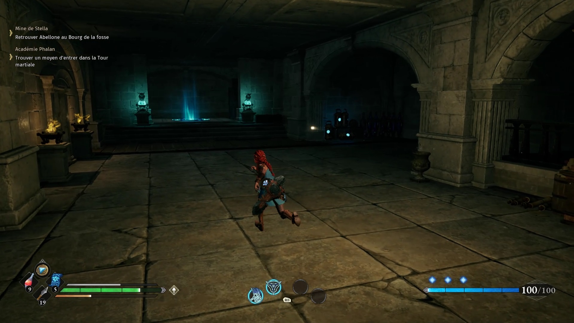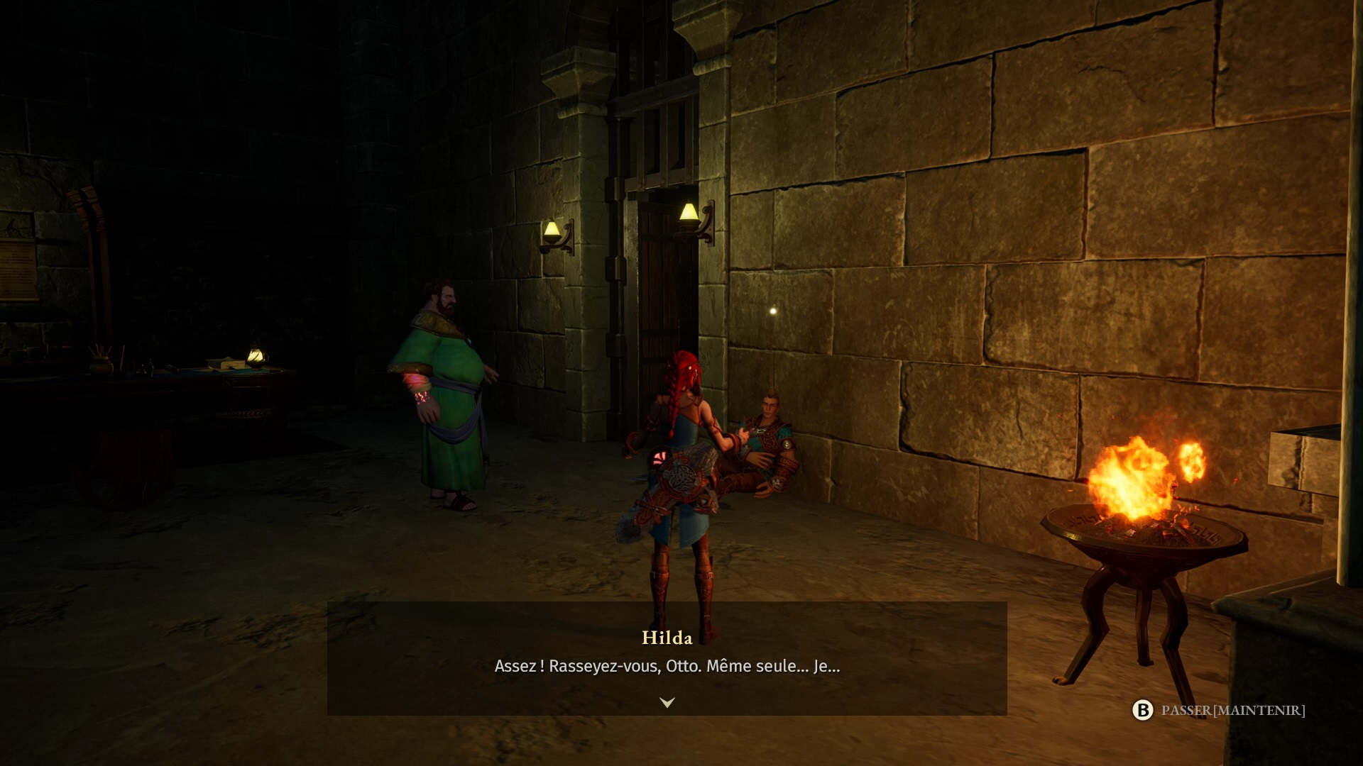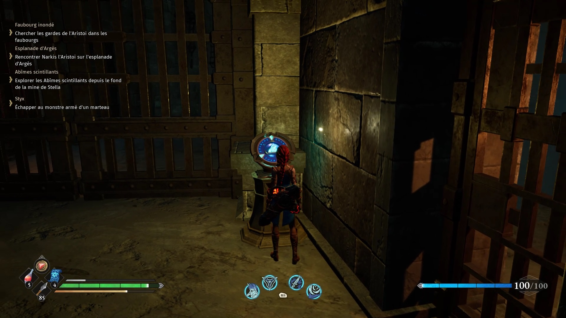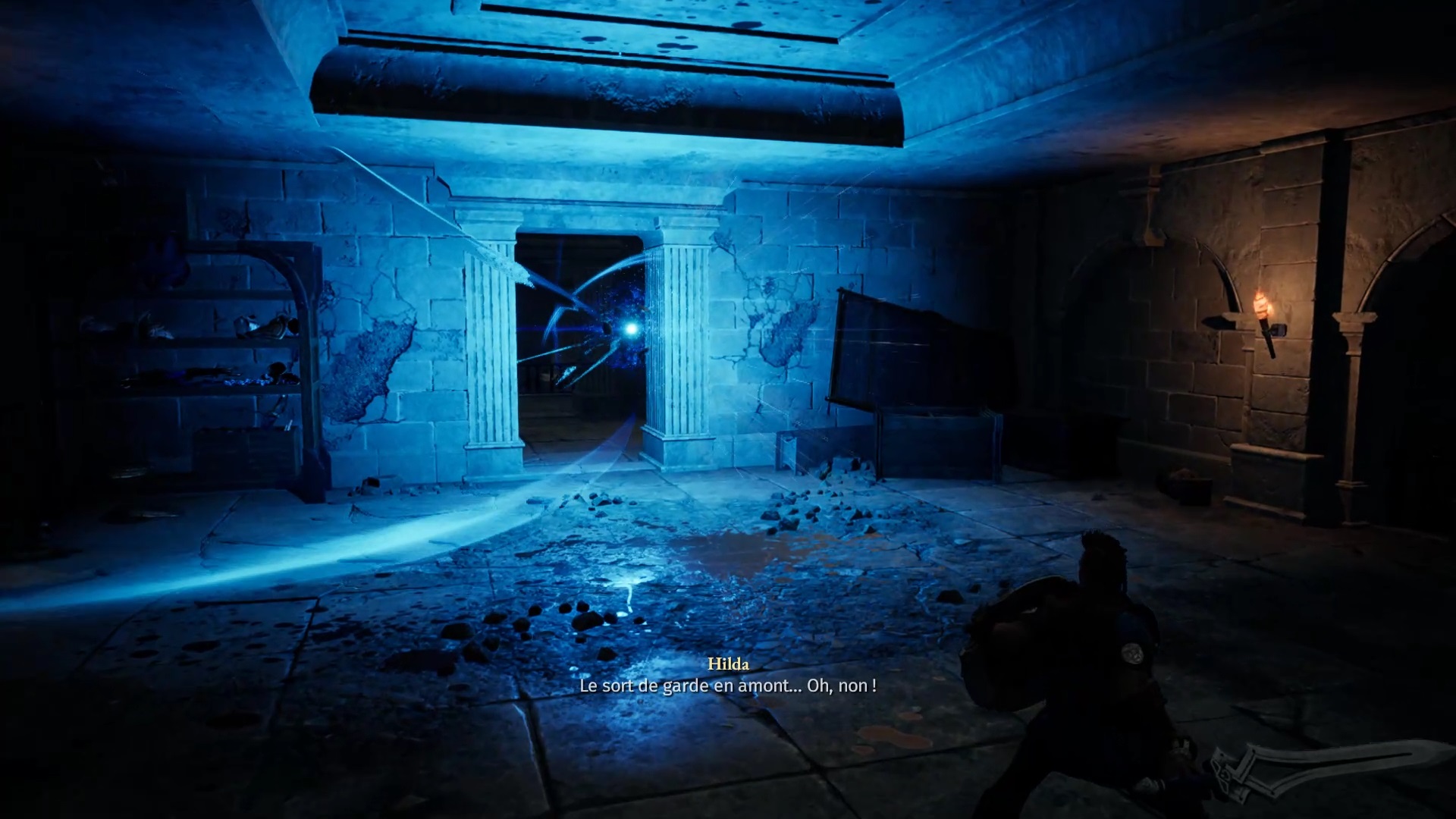 Go upstairs and go to the bottom of this new corridor to find Otto. After the dialogue, take the red tank in the room. Then move towards the door lit by a torch to find an elevator. Activate the elevator and go down the stairs. A checkpoint awaits you, get ready before placing the phylactite tank on the red mark in the arena.
