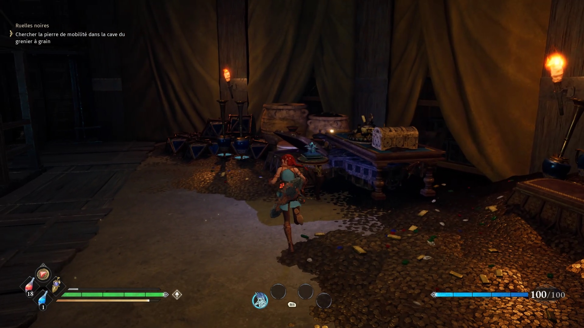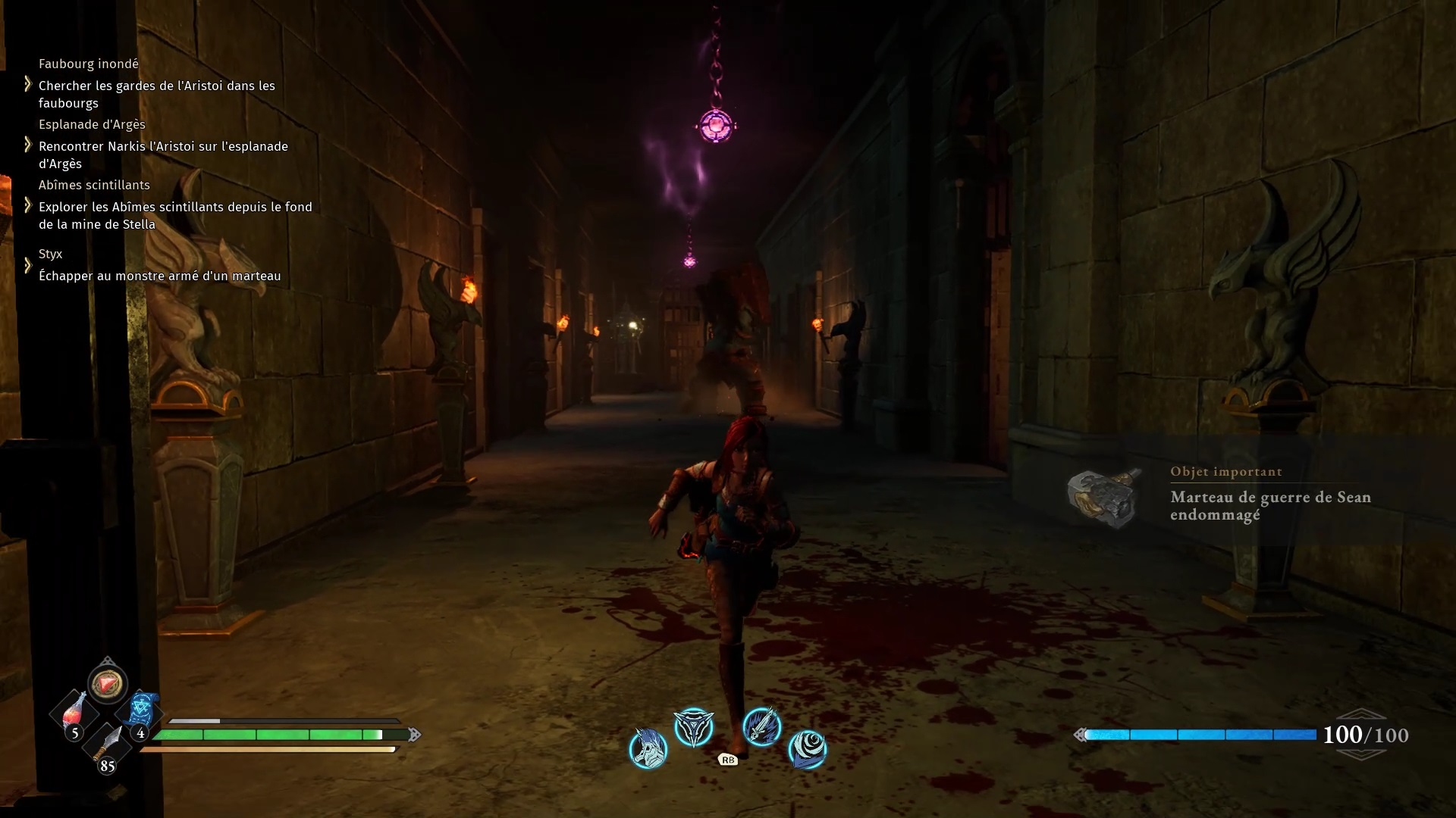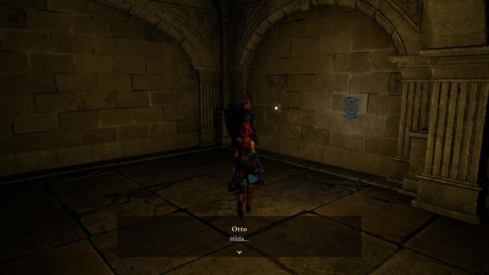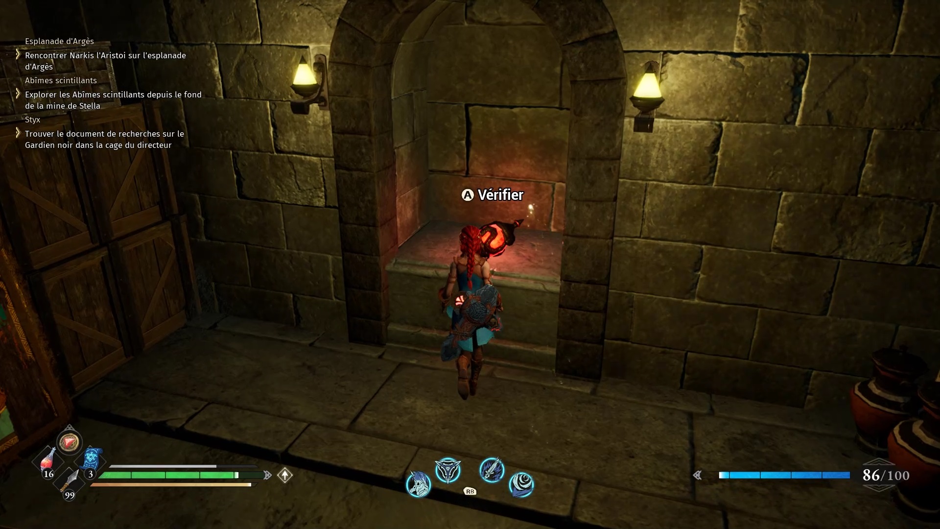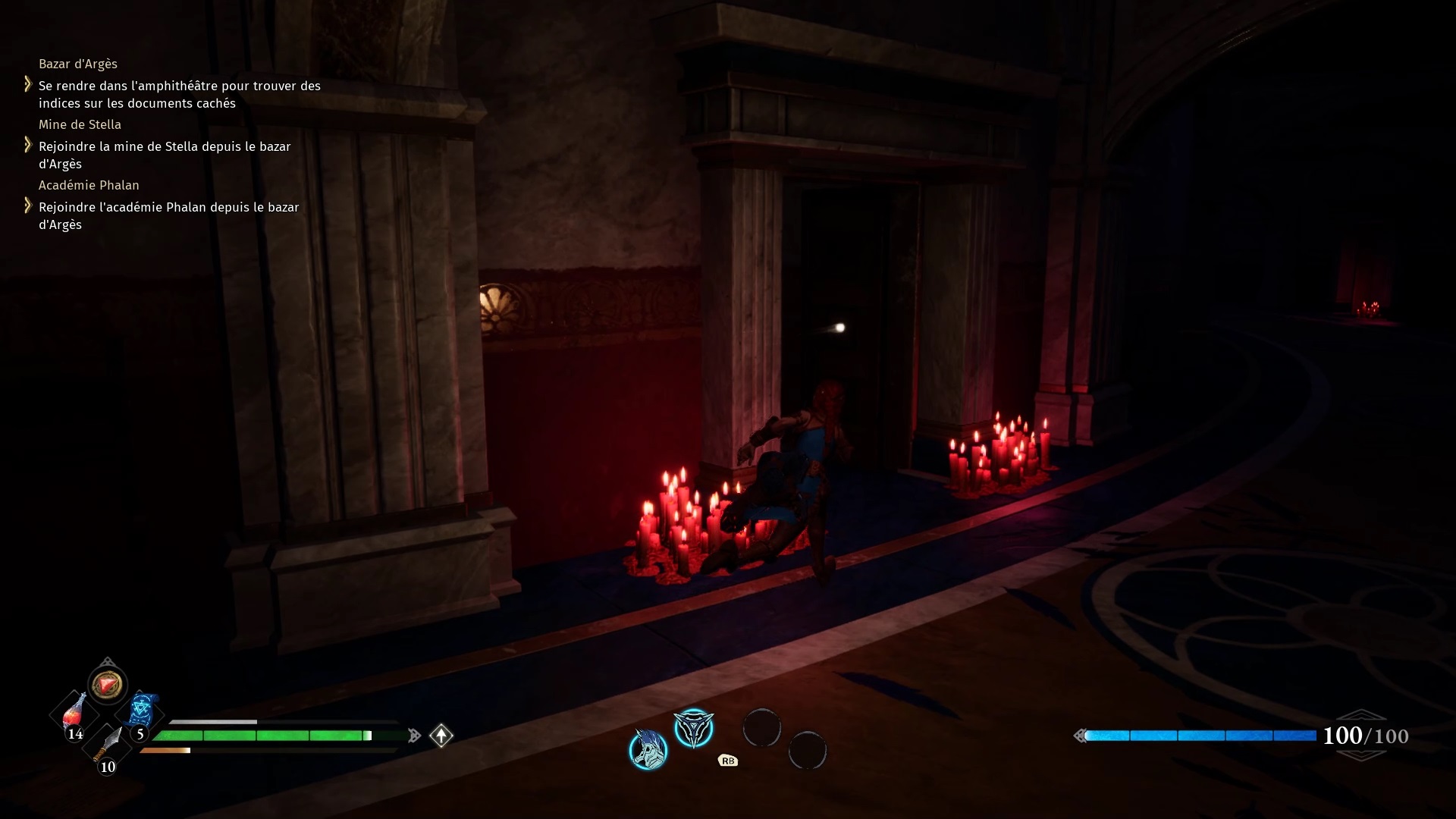 Go upstairs and go to the bottom of this new corridor to find Otto. After the dialogue, take the red tank in the room. Then move towards the door lit by a torch to find an elevator. Activate the elevator and go down the stairs. A checkpoint awaits you, get ready before placing the phylactite tank on the red mark in the arena.