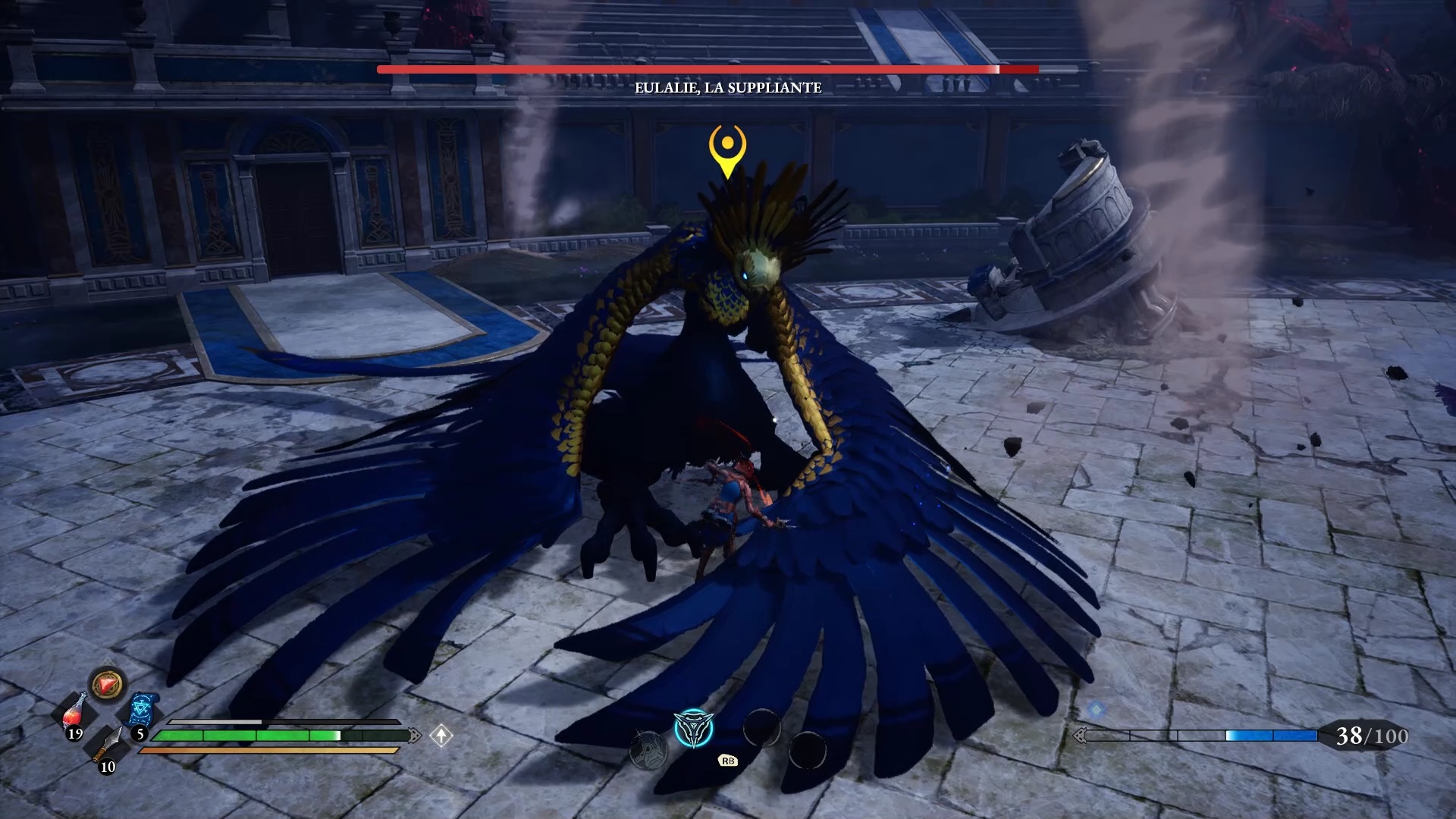 Eulalia spends the start of the fight in the sky. Dodge his attacks by taking cover or running. Beware of the shock waves that you will absolutely have to avoid by dodging. When she comes down to earth, Eulalia is vulnerable. Approach her to beat her. His blows, carried on the ground, are relatively slow and can be easily anticipated. Juggle between combos and dodges to get to phase two. In this phase, the boss calls his minions. Deal with them first while keeping an eye out for Eulalia’s attacks. Back on the ground, start alternating blows and dodges again to overcome them.