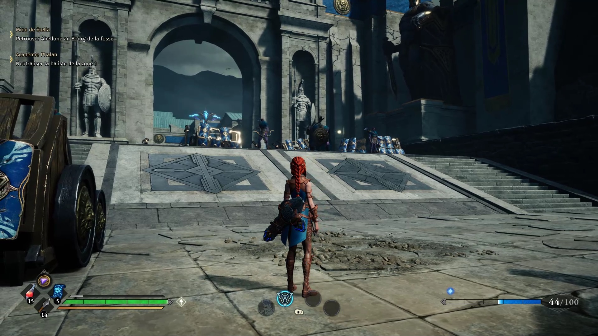 After completing the quests, Minerva sends you to the Refuge armillary sphere. Interact with it to teleport. Once on the other side, you must question Minerva. Next, head up the stairs against the right wall. Climb onto the crates above to reach a balcony. Go to the other side of the wall and fight the Colossus. Luckily for us, he’s not on the same level as the twins. Once defeated, open the gate.