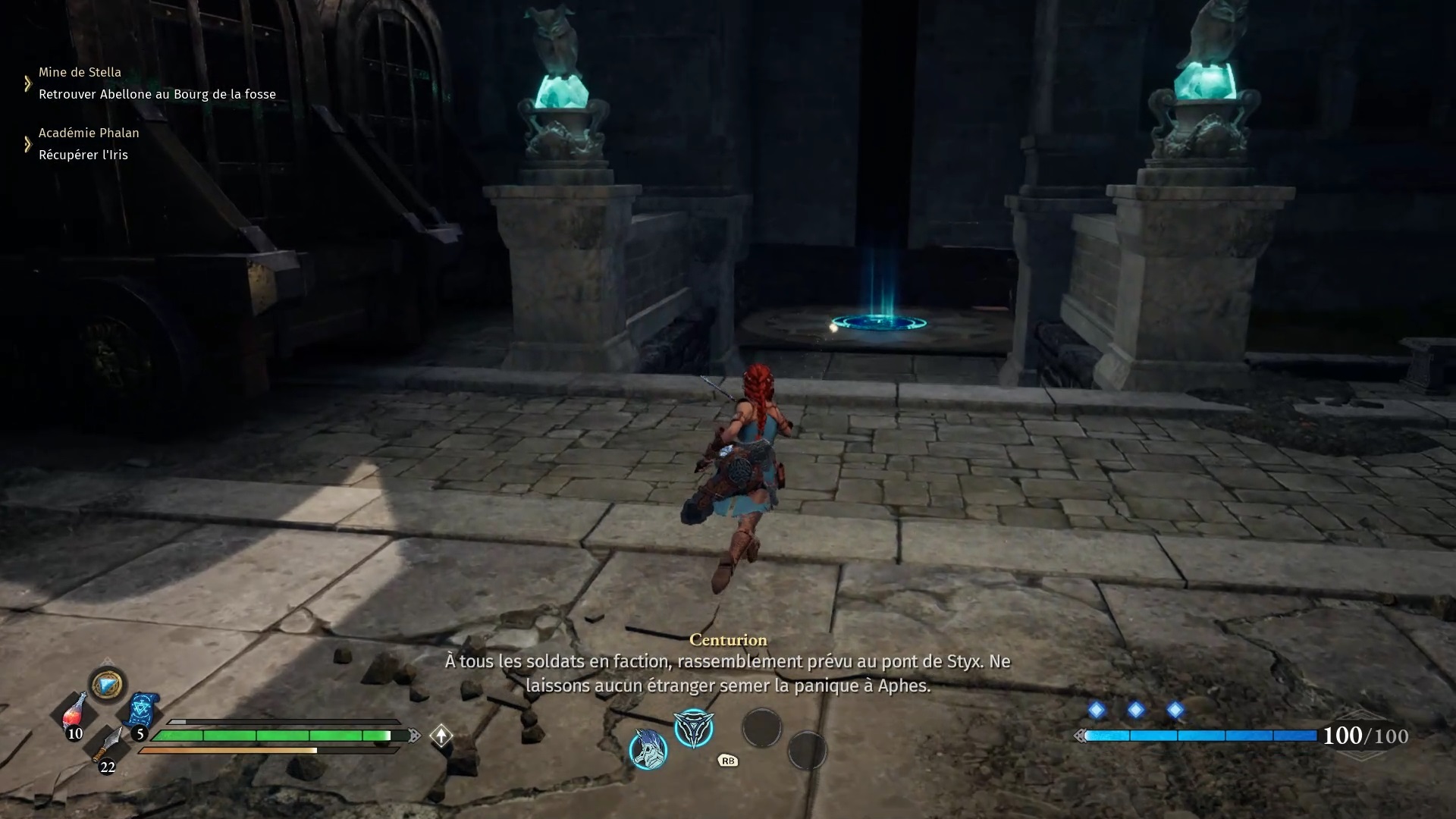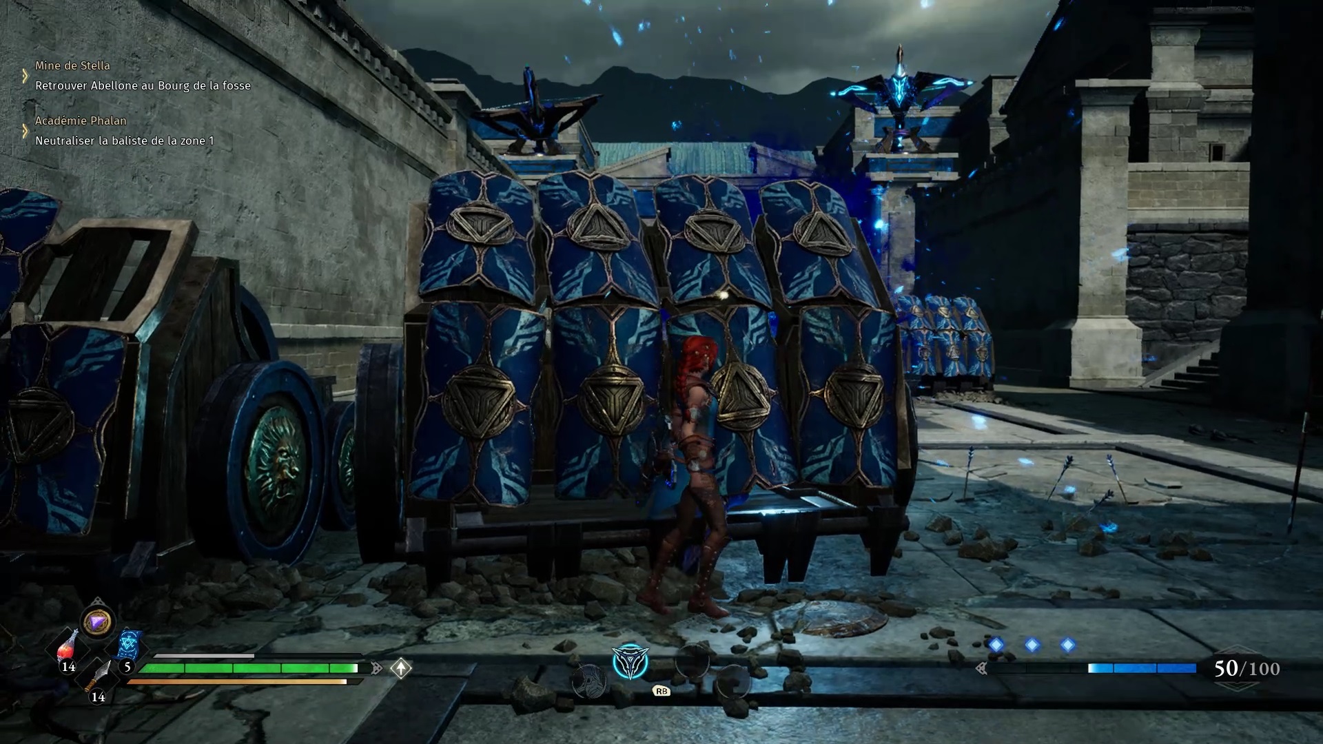 At the end of the fight, move forward to descend from the tower. You will find a checkpoint in the inner courtyard. Use the tanks to reach the Styx bridge located behind an arch.