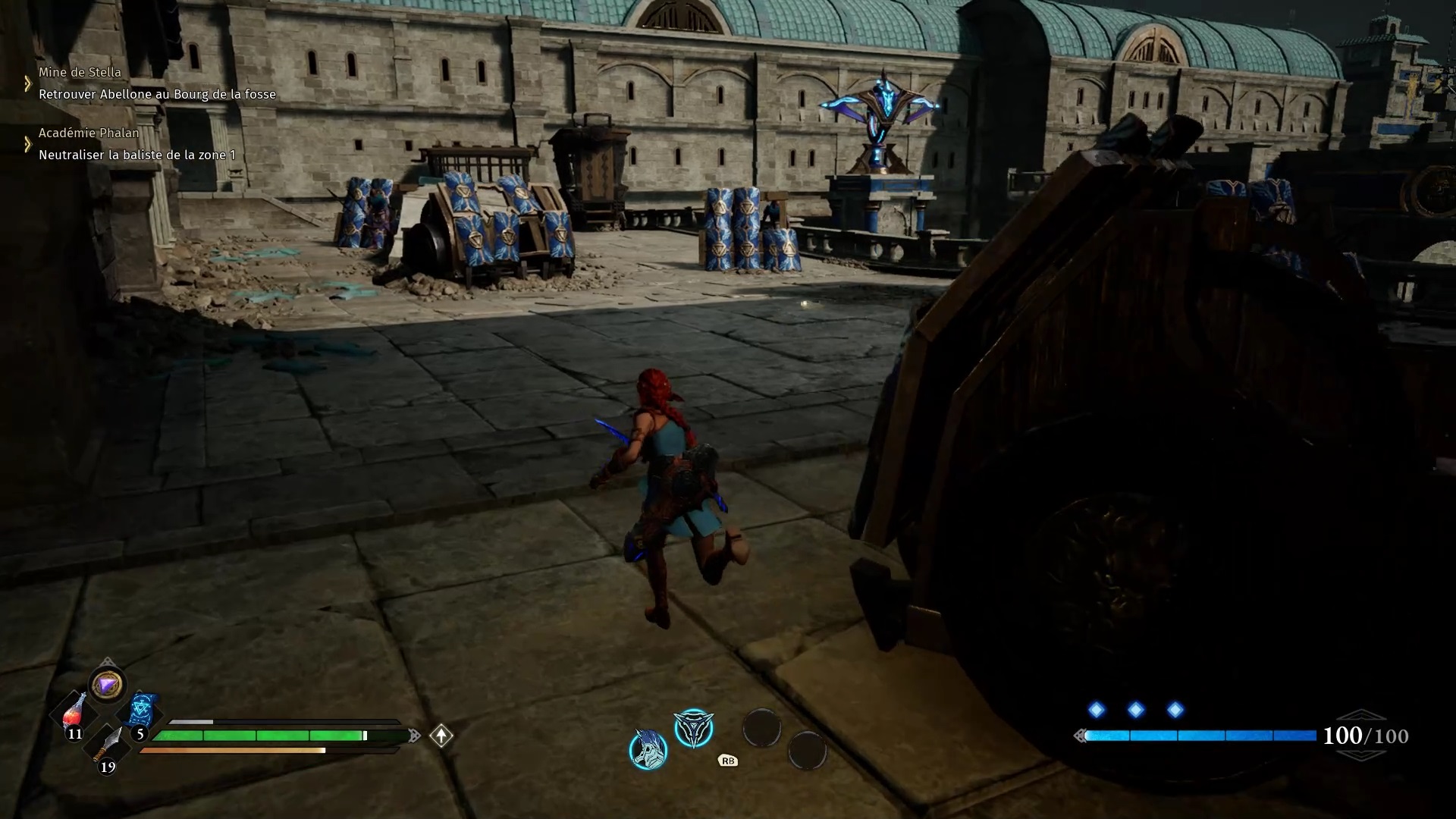 Climb the stairs to reach a new checkpoint at the amphitheater. Go up in the amphitheater to find Eulalia. Fight your way between the barricades while dodging his attacks. On the other side, go down to join a corridor leading you to the elevator of the boss.