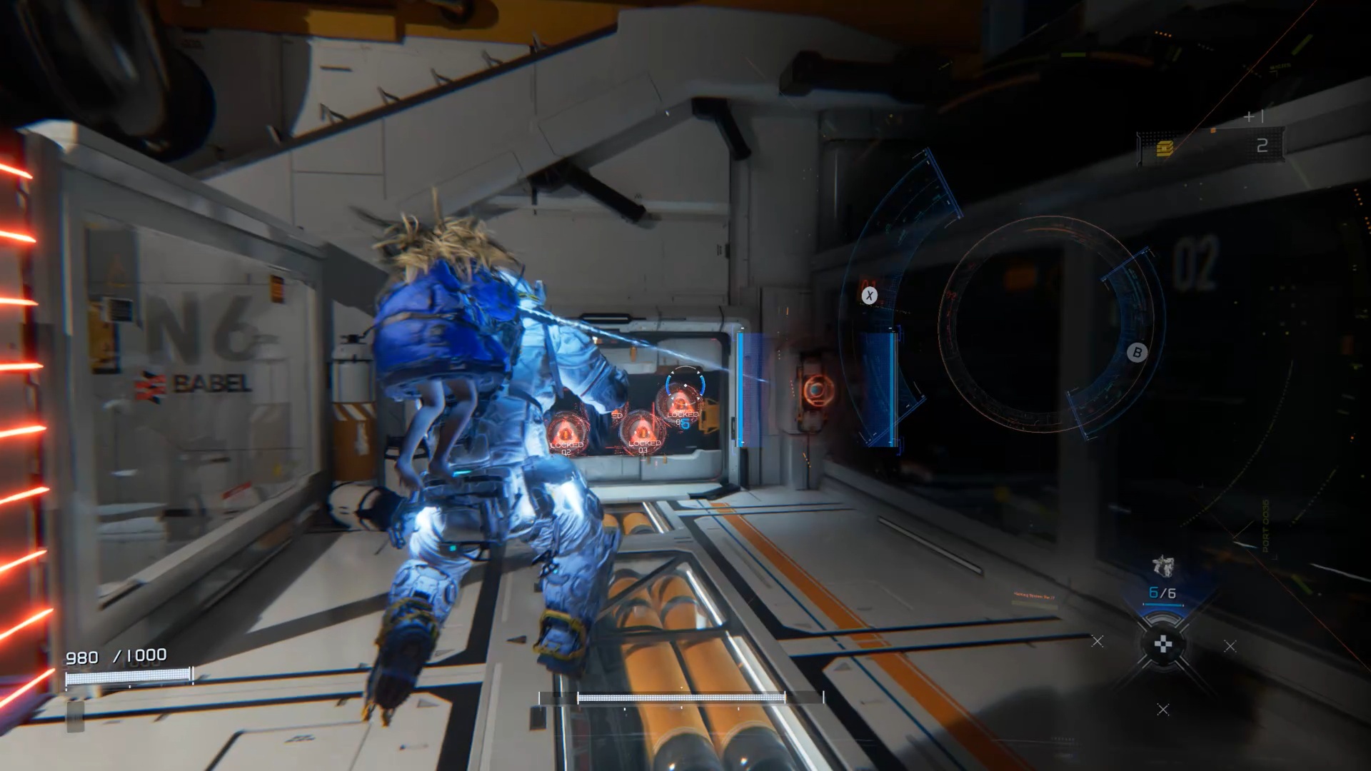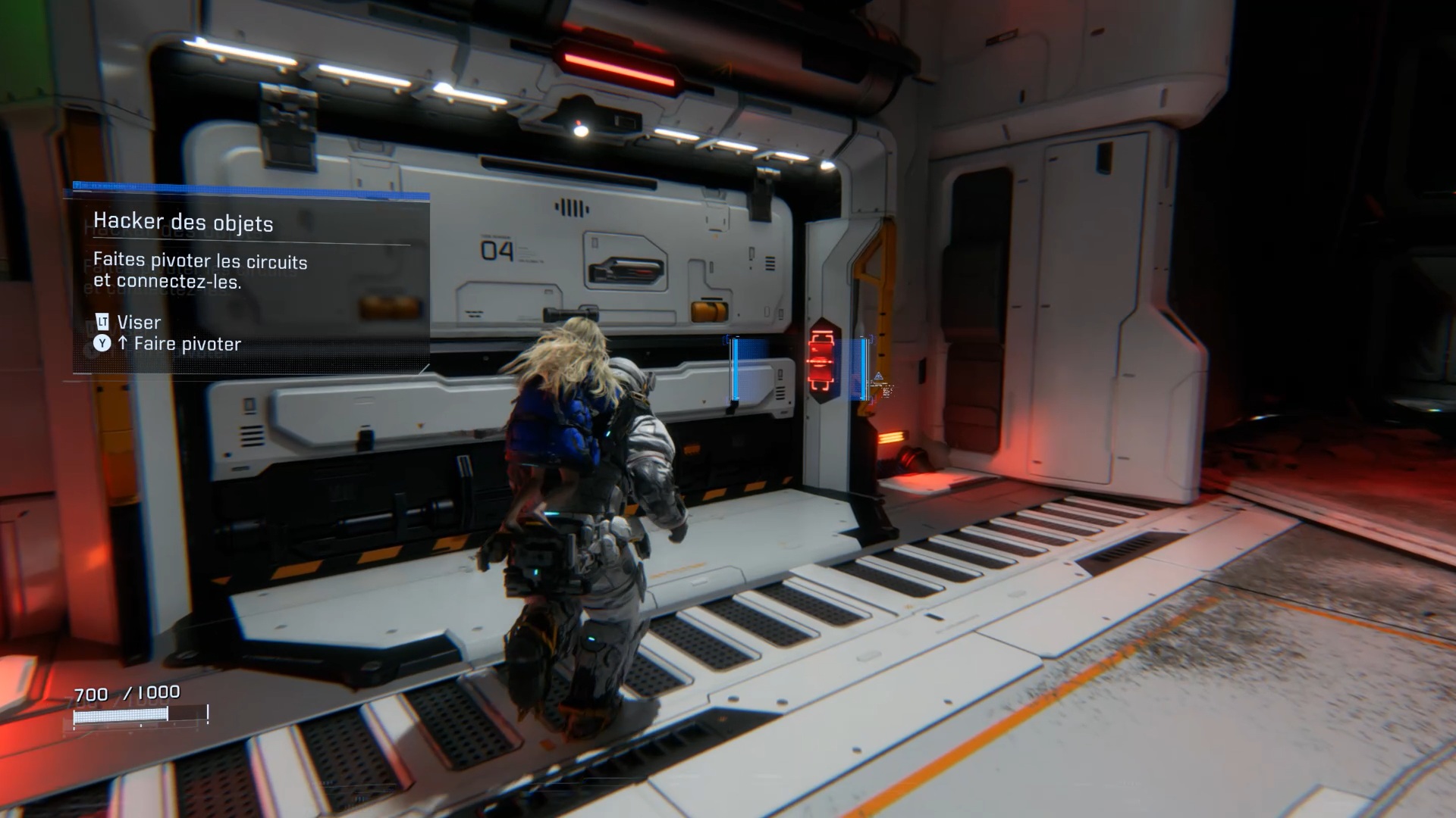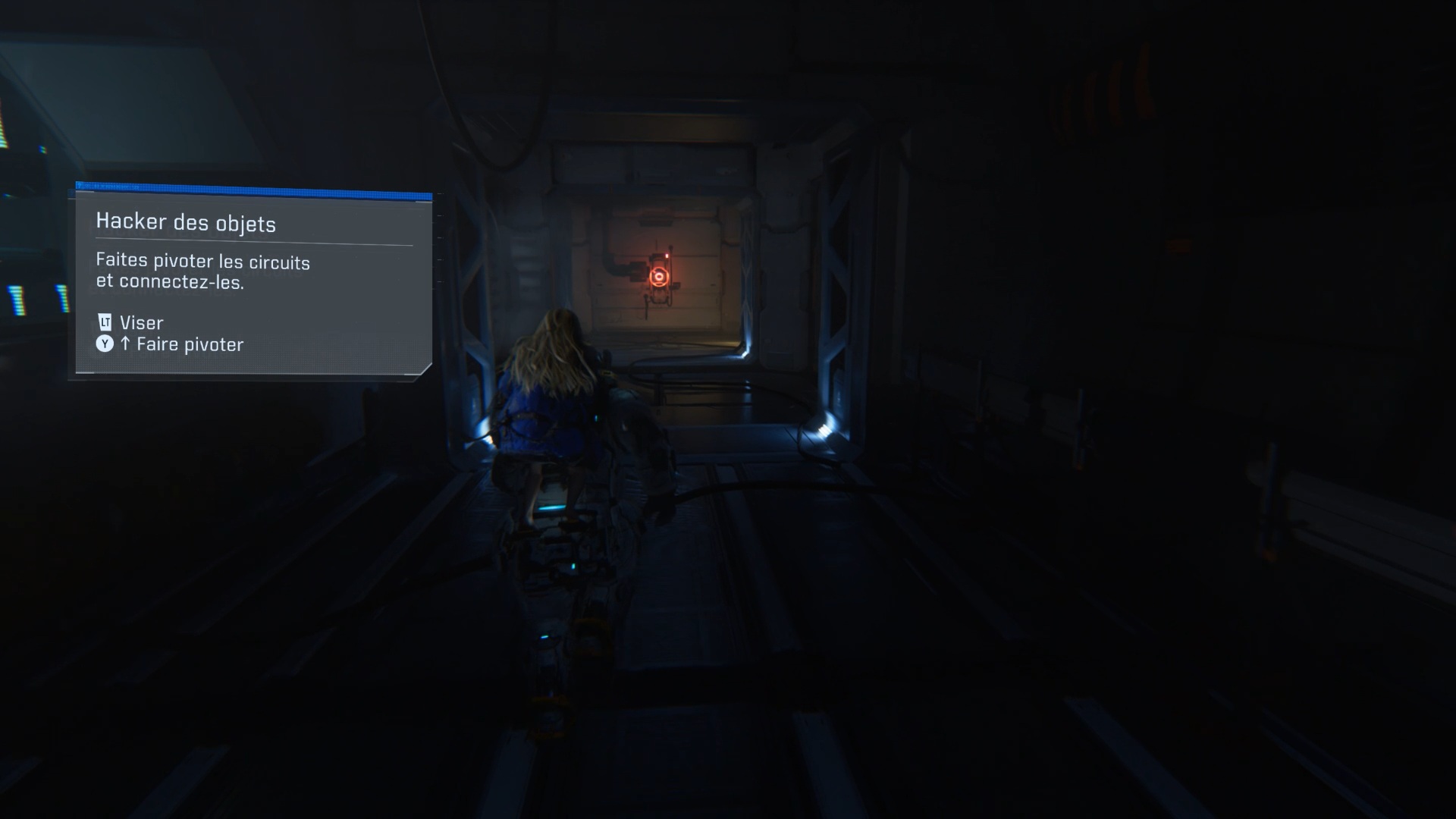 Arrivé au quai, enfoncez-vous dans les couloirs pour trouver un interrupteur rouge contre le mur. Utilisez votre capacité de hacking pour le hacker et alimenter la zone. Une fois la zone alimentée, revenez sur vos pas et utilisez la capacité de scan pour identifier votre prochain objectif. Passez la porte pour trouver une porte fermée avec deux verrous : examinez les côtés de part et d’autre de la porte pour repérer deux interrupteurs, l’un dans la pièce adjacente et l’autre juste à droite de la porte, afin de la déverrouiller.