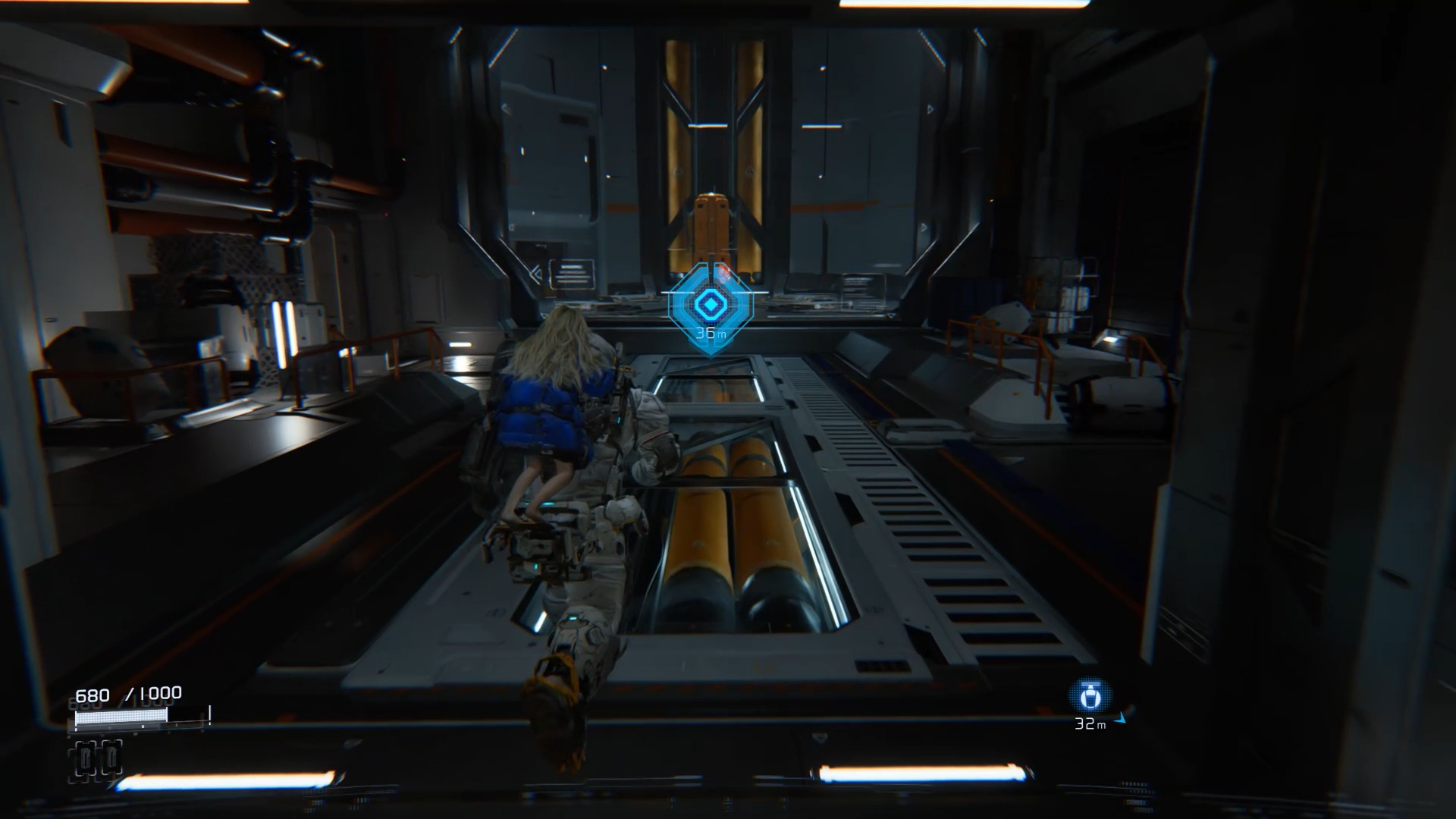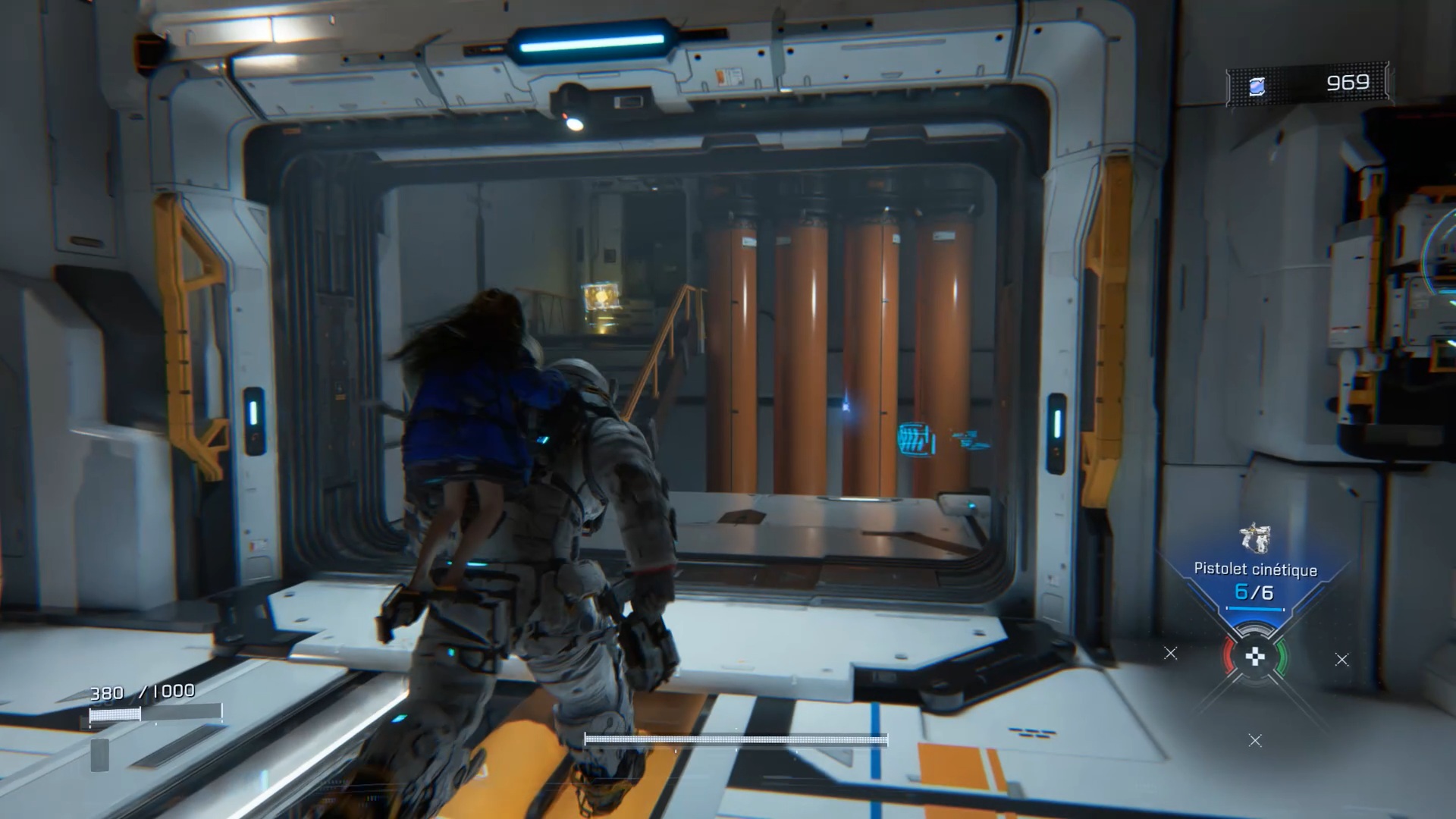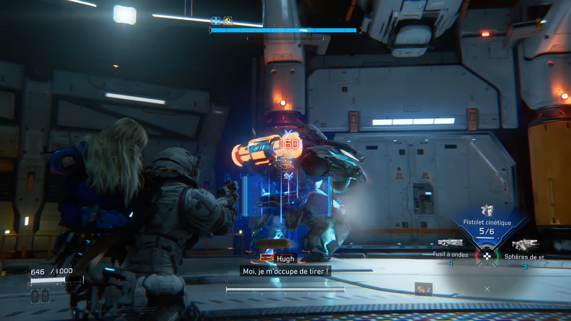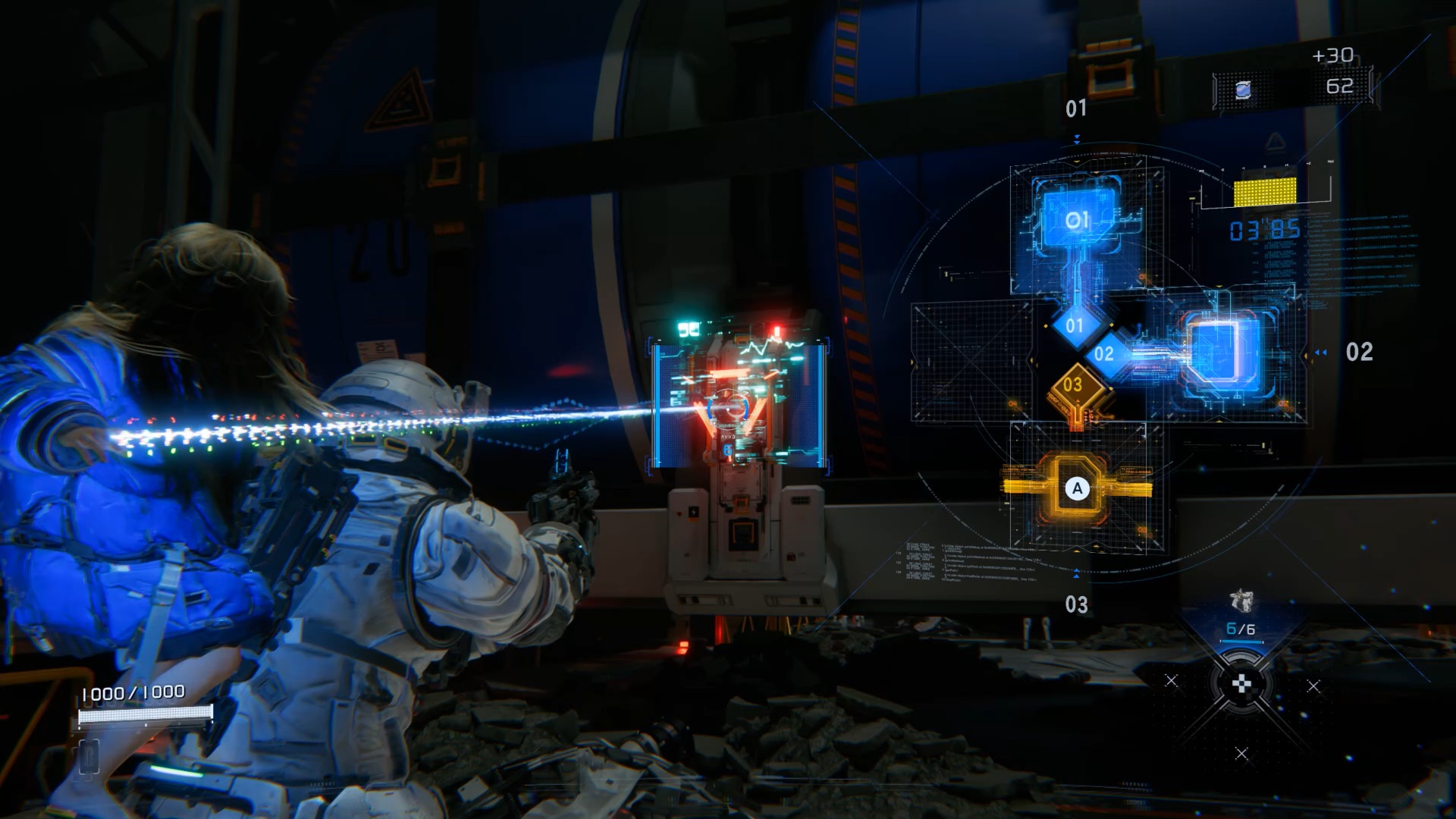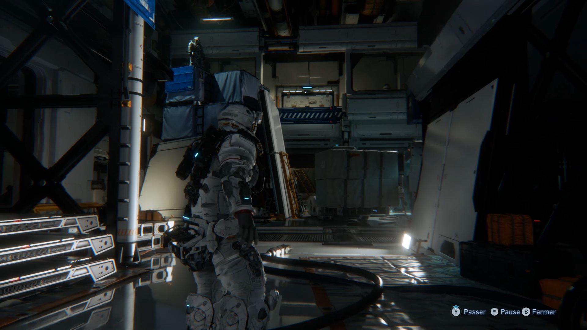 Au début de l’aventure Pragmata, suivez votre équipe afin de vous familiariser avec les commandes de saut Utilisez ensuite les caisses pour atteindre un couloir en hauteur. Après la cinématique, Diana vous rejoint. Utilisez ses capacités de hack pour rendre vulnérable le marcheur, puis le neutraliser. Ensuite, interagissez avec la porte à proximité afin que Diana l’ouvre et vous permette de continuer votre progression.