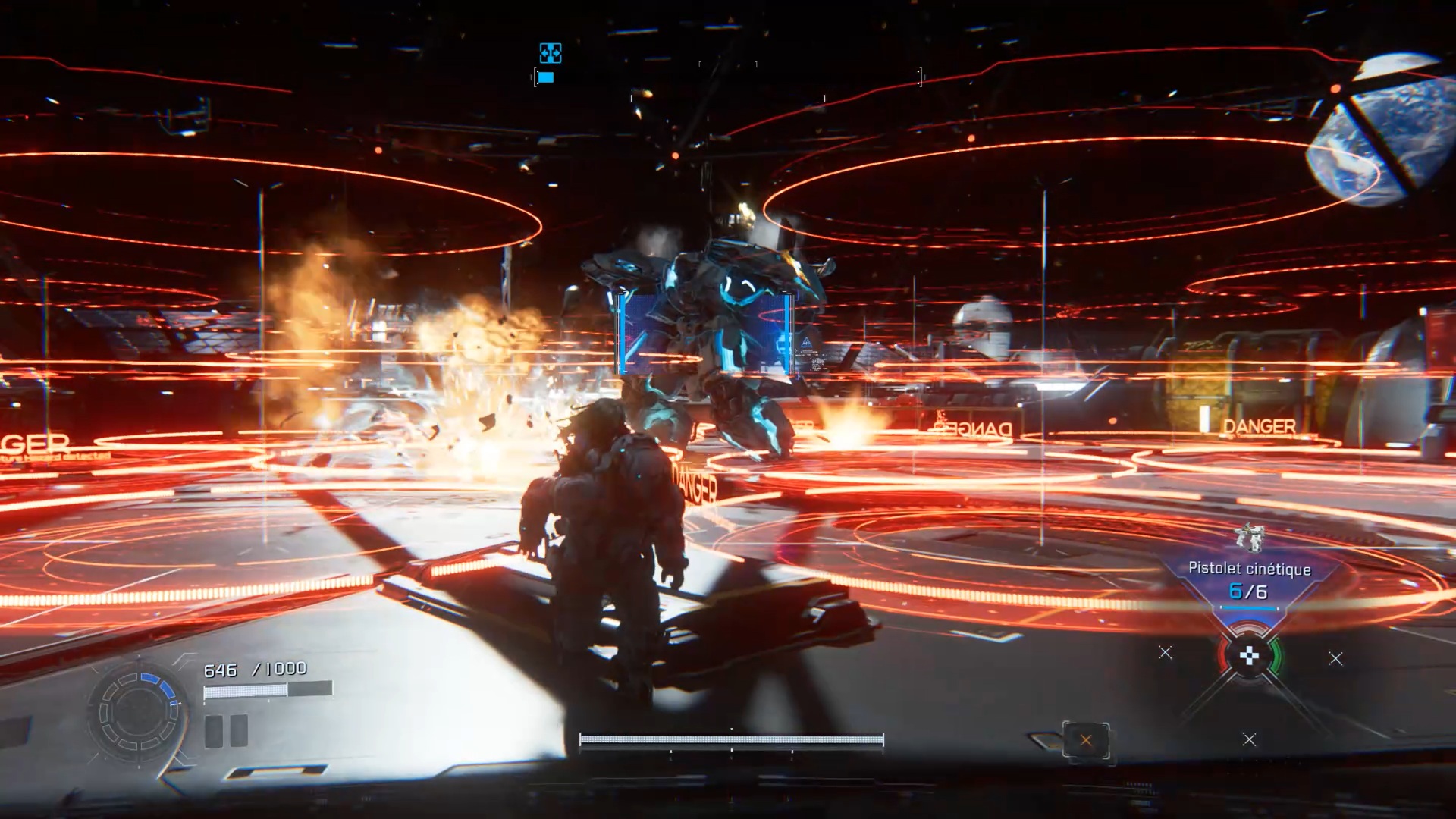 Passez les portes pour descendre et rejoindre un nouvel ascenseur. Survivez aux vagues ennemies et hackez le pylône au centre afin d’atteindre le dernier étage.