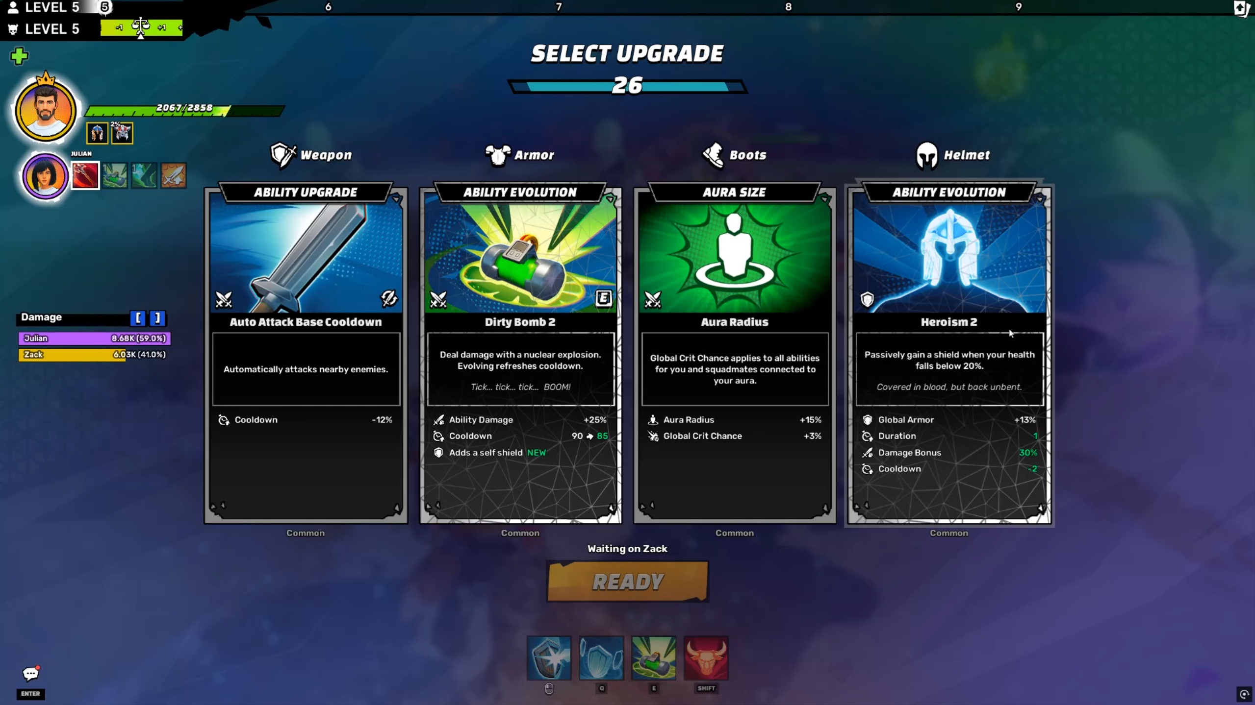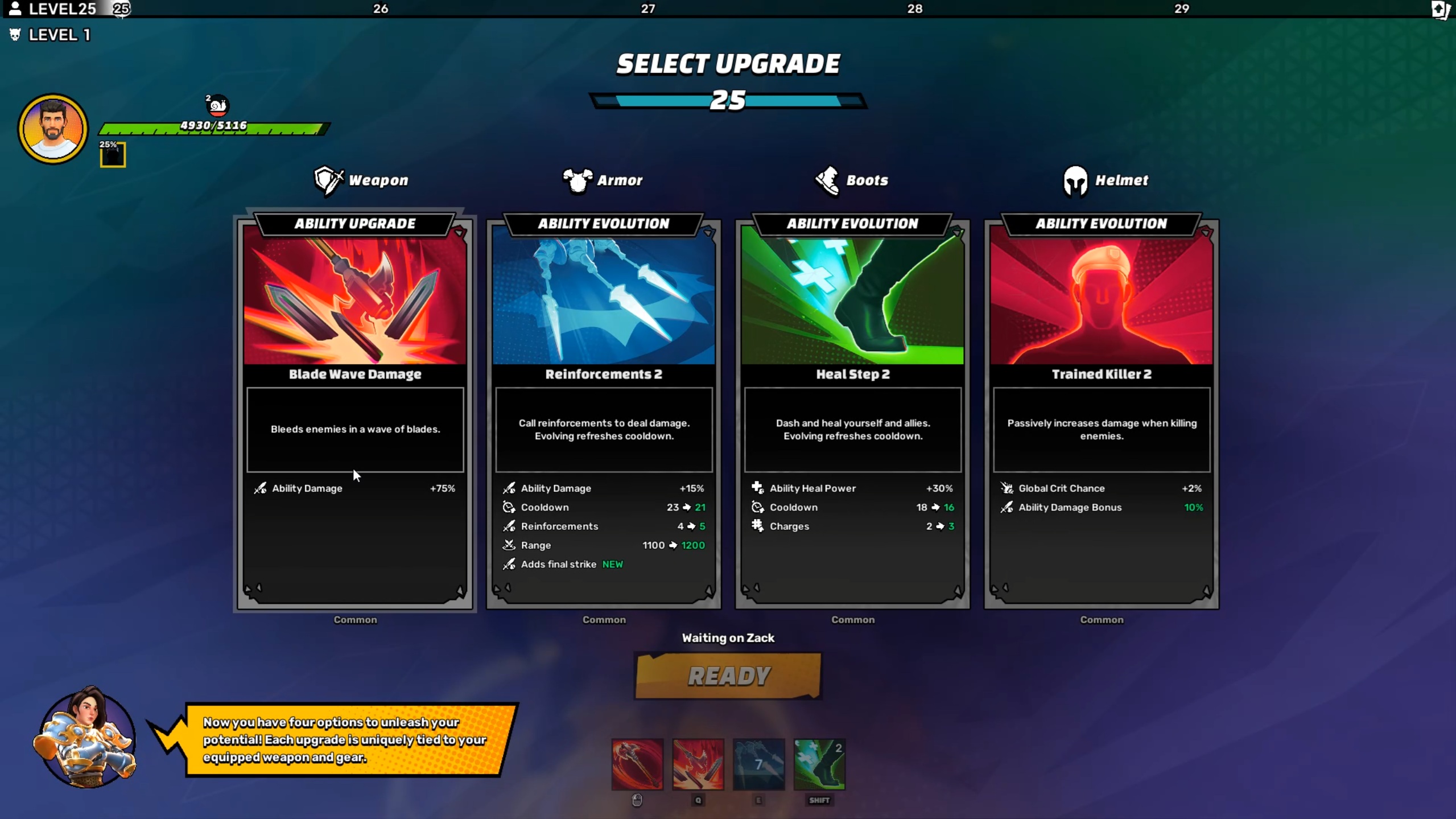 Puis, l’écran s’assombrit. Quatre cartes s’affichent, chacune proposant une amélioration différente. Je comprends alors que chaque partie est découpée en plusieurs phases, chacune me permettant de sélectionner un bonus aléatoire. En fonction de la situation, mes choix peuvent varier : renforcer mes dégâts pour une offensive rapide, ou plutôt accroître ma barre de santé si je manque de soins. Une véritable plus-value qui rend chaque partie unique, à la manière d’un Back 4 Blood, tout en apportant une touche stratégique bienvenue.