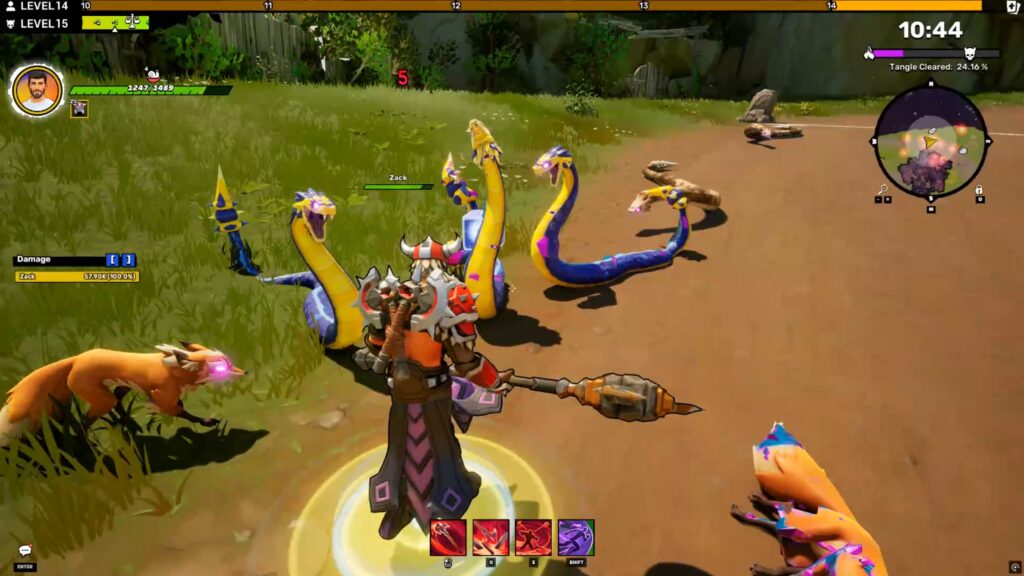 Un halo d’énergie nous relie, un bonus de proximité qui renforce nos capacités. À peine le temps de comprendre qu’un joueur enfourche déjà sa monture pour engager le combat. Des vagues d’ennemis nous tombent dessus… et quand je dis vagues, c’est vraiment des hordes entières ! Le timer en haut à droite m’indique qu’il ne reste que 15 minutes pour explorer la zone.