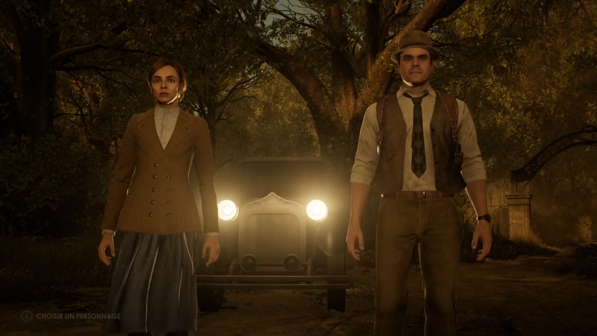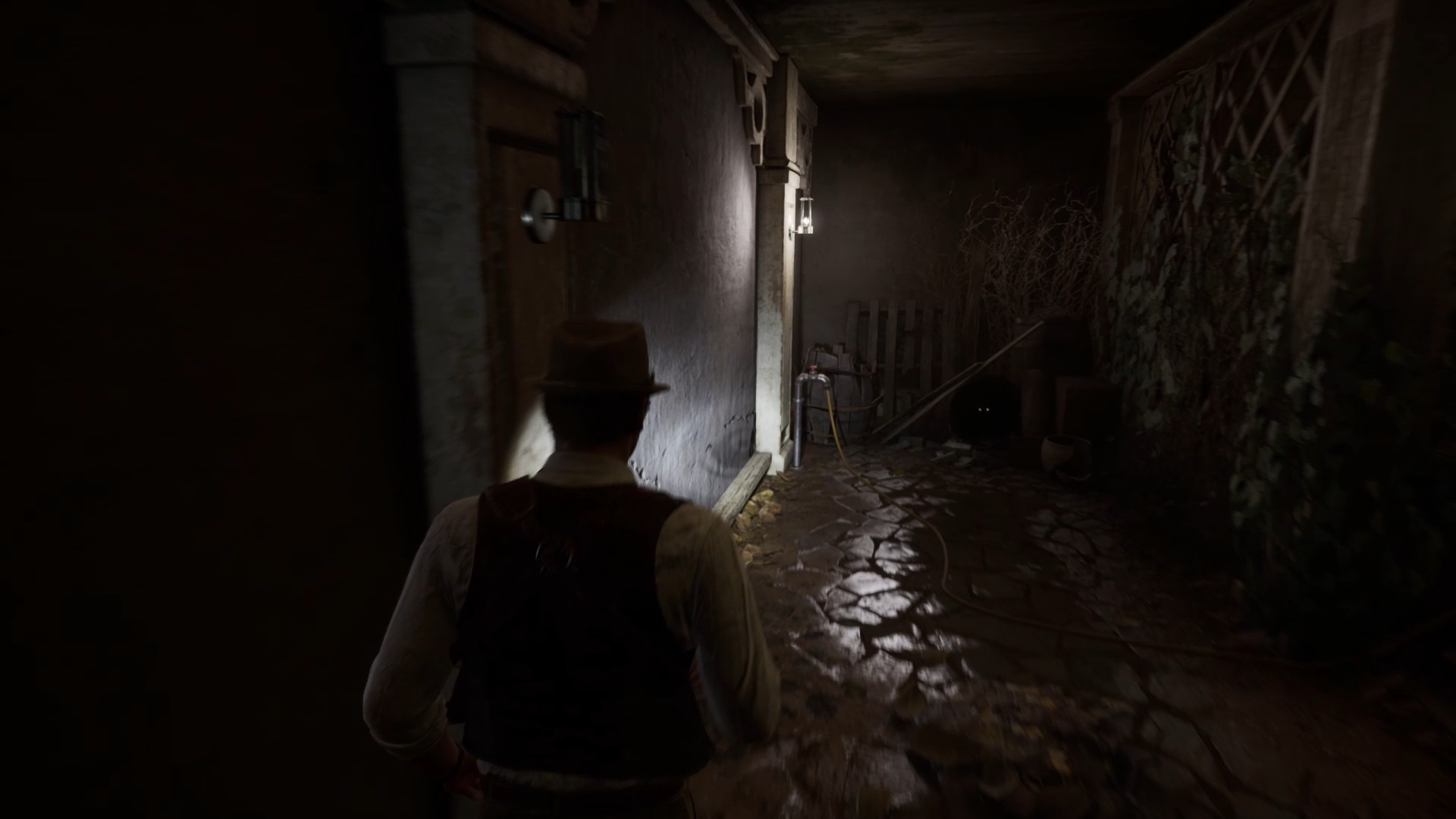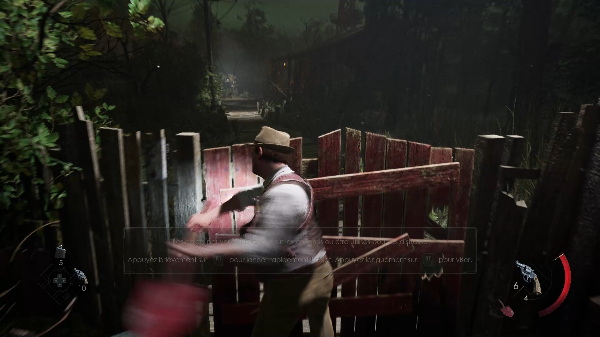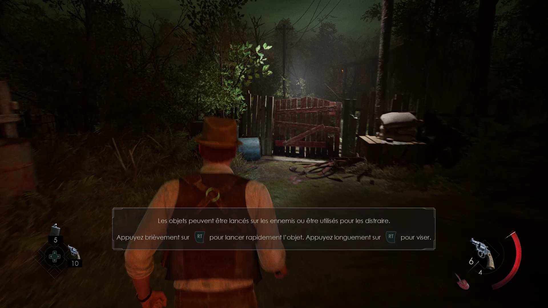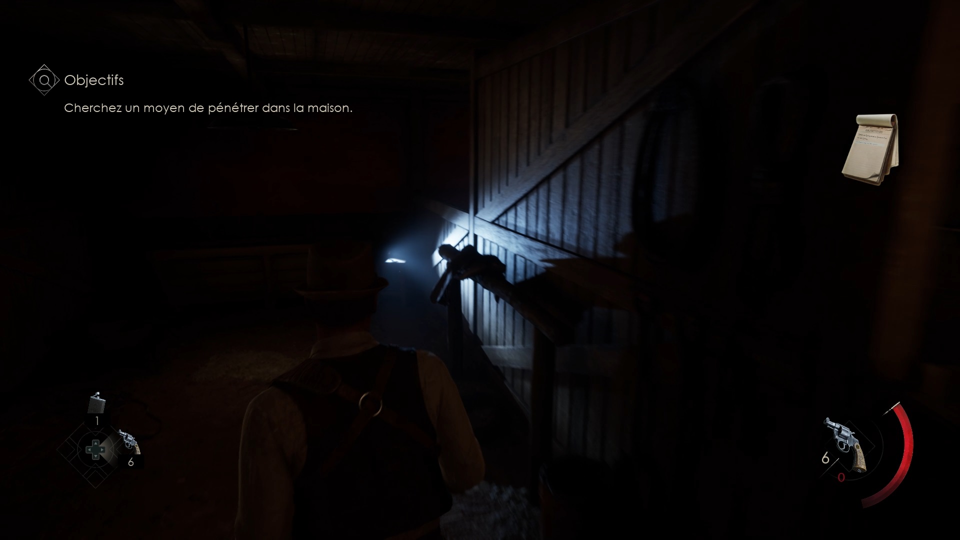 Au début de votre aventure, vous avez le choix de votre personnage, et nous avons opté pour Edward Carnby. En progressant dans la grange, vous remarquerez une lumière dans une étable. Interagissez avec elle pour récupérer une lampe de poche et une clé. Avancez ensuite dans l’obscurité et éclairez le chemin avec votre nouvelle lampe. Utilisez la clé pour ouvrir le portail, puis continuez à travers la cour pour accéder à une porte menant au jardin.