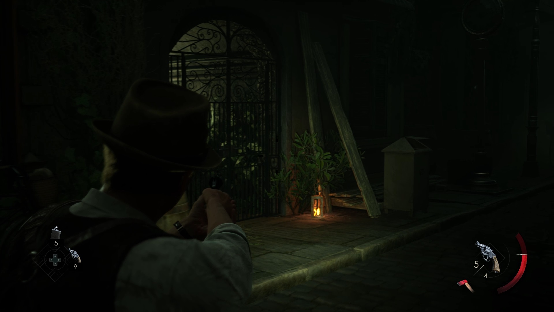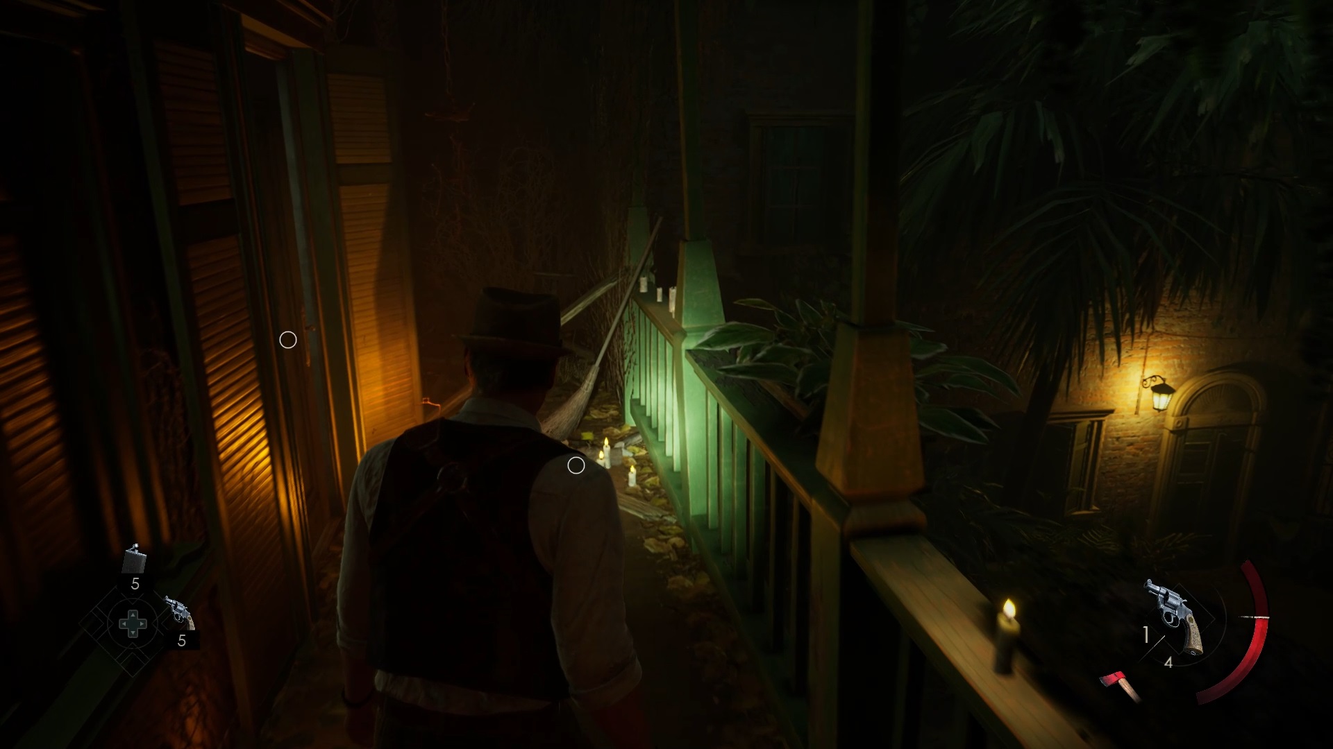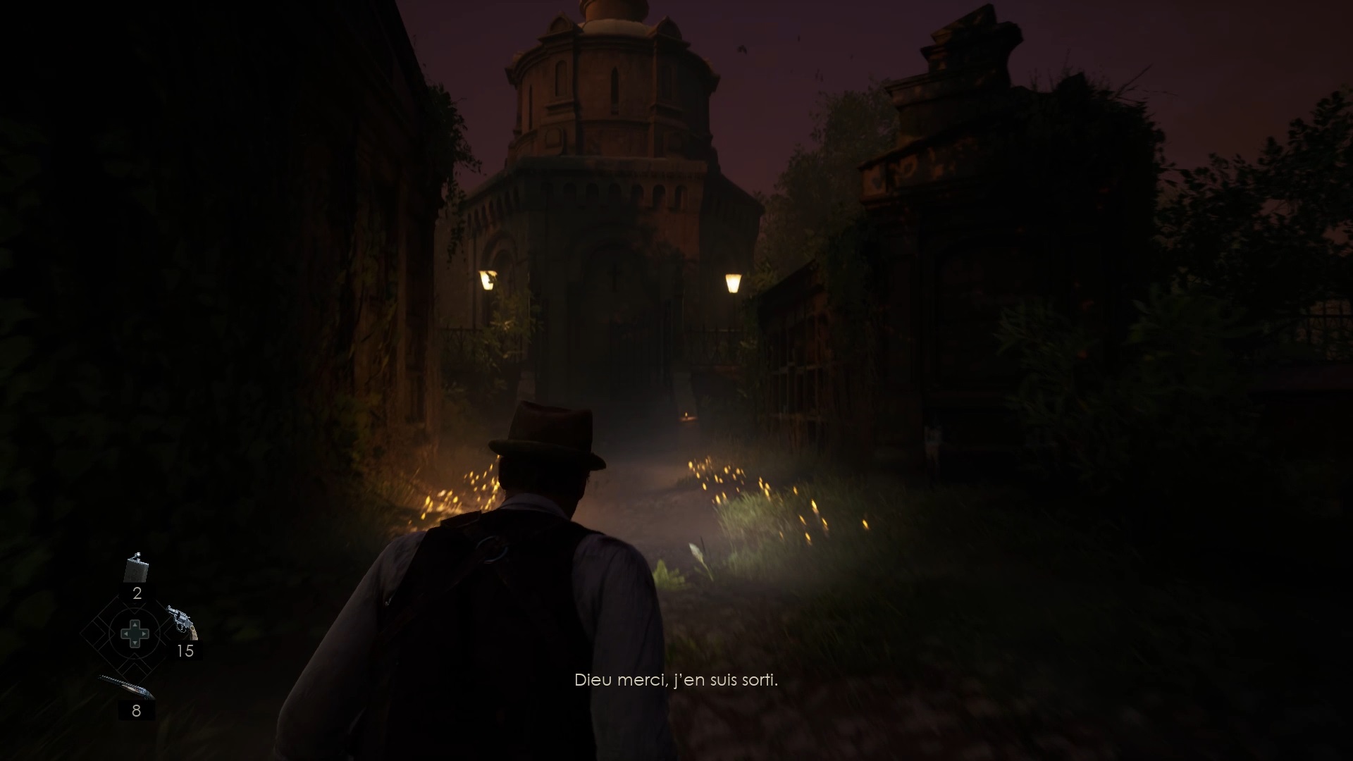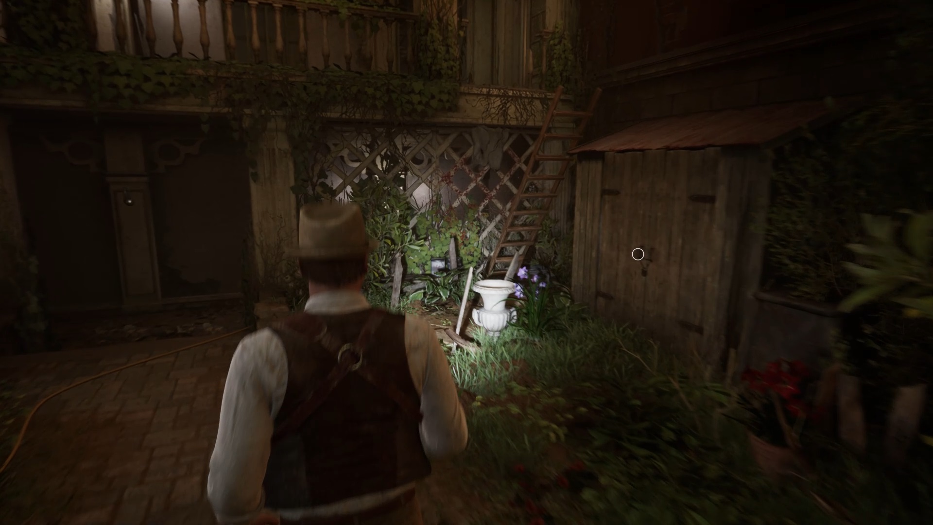Au début de votre aventure, vous avez le choix de votre personnage, et nous avons opté pour Edward Carnby. En progressant dans la grange, vous remarquerez une lumière dans une étable. Interagissez avec elle pour récupérer une lampe de poche et une clé. Avancez ensuite dans l’obscurité et éclairez le chemin avec votre nouvelle lampe. Utilisez la clé pour ouvrir le portail, puis continuez à travers la cour pour accéder à une porte menant au jardin.