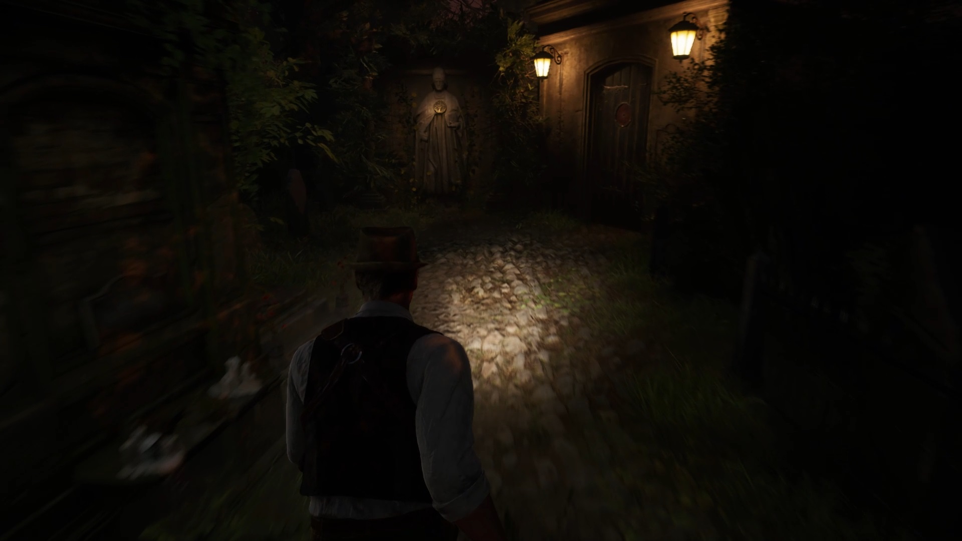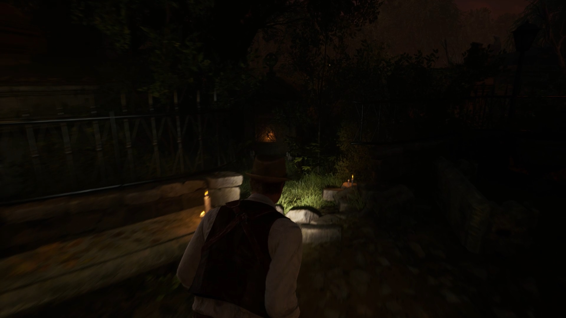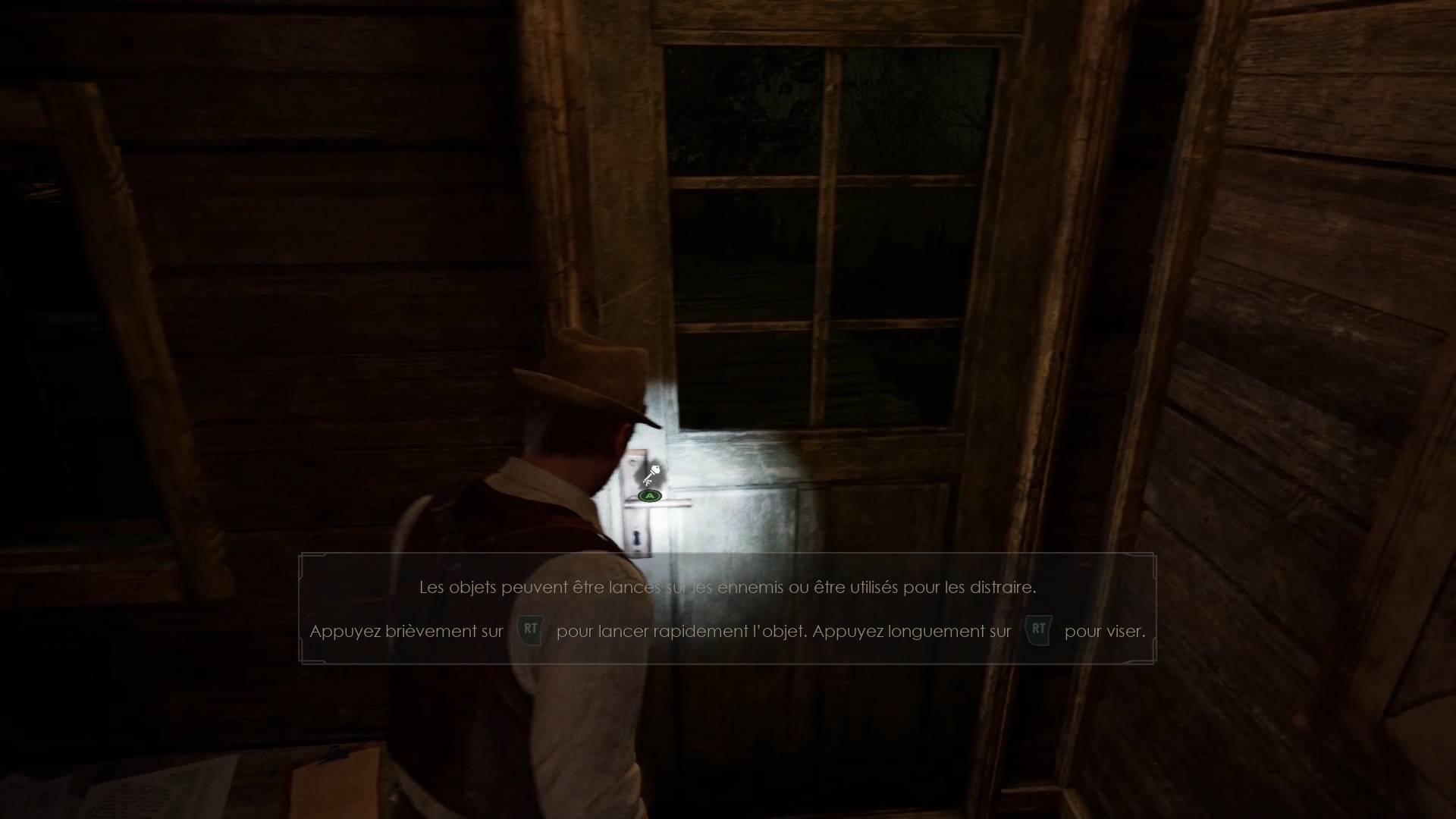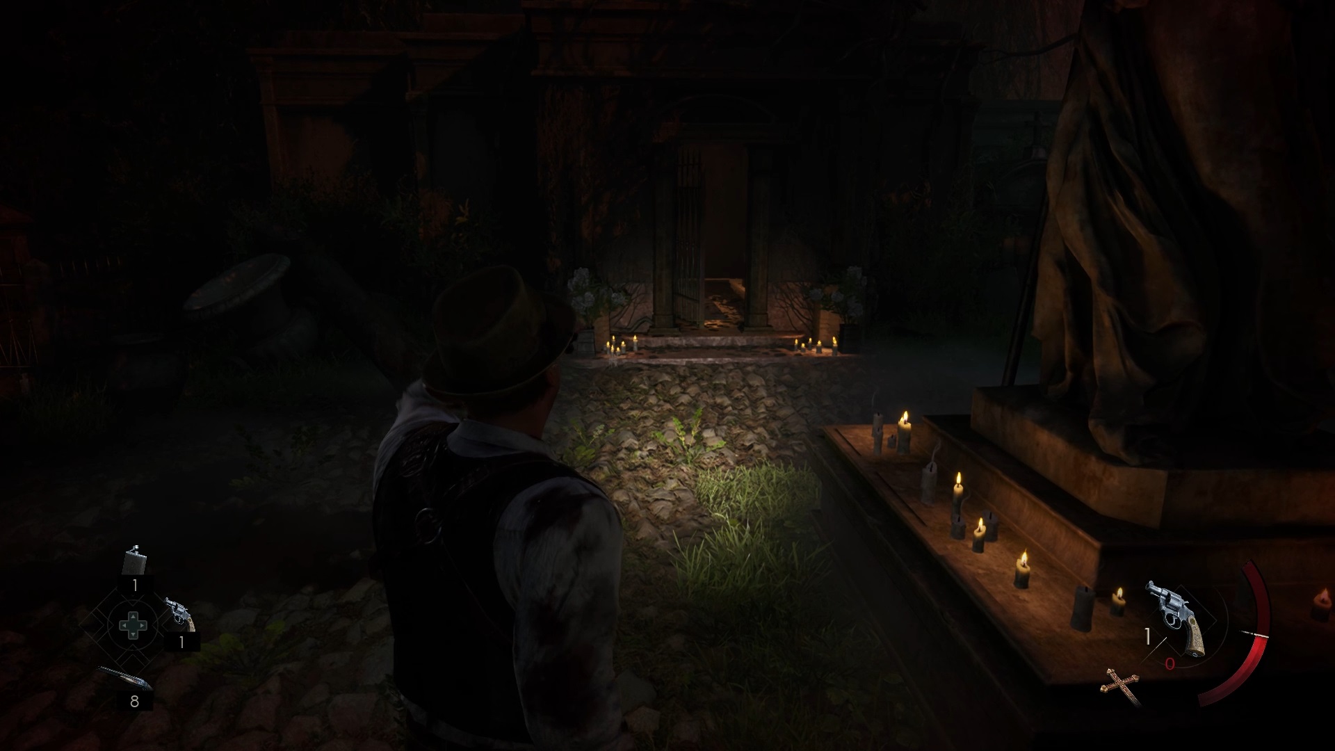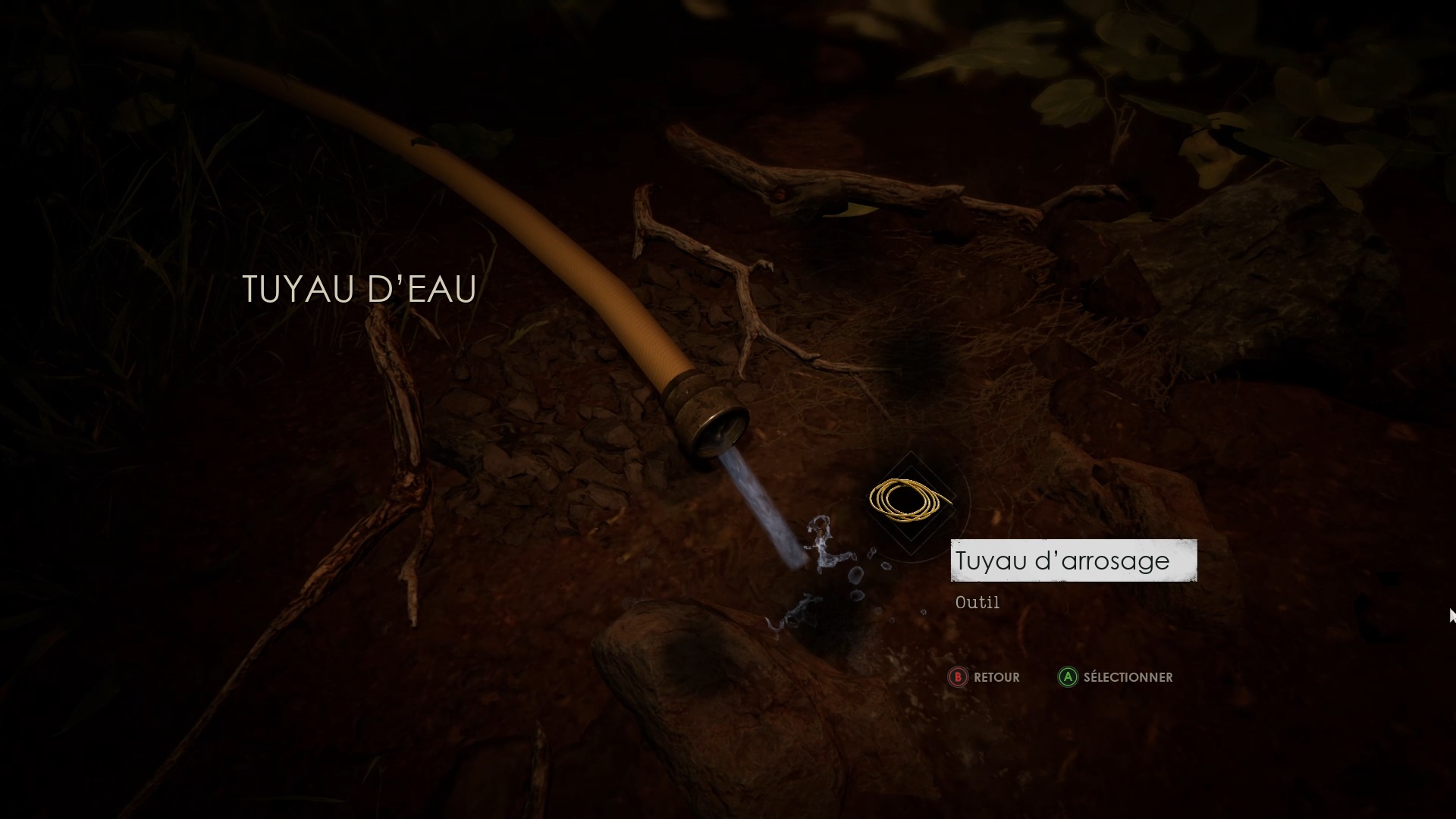 Au début de votre aventure, vous avez le choix de votre personnage, et nous avons opté pour Edward Carnby. En progressant dans la grange, vous remarquerez une lumière dans une étable. Interagissez avec elle pour récupérer une lampe de poche et une clé. Avancez ensuite dans l’obscurité et éclairez le chemin avec votre nouvelle lampe. Utilisez la clé pour ouvrir le portail, puis continuez à travers la cour pour accéder à une porte menant au jardin.