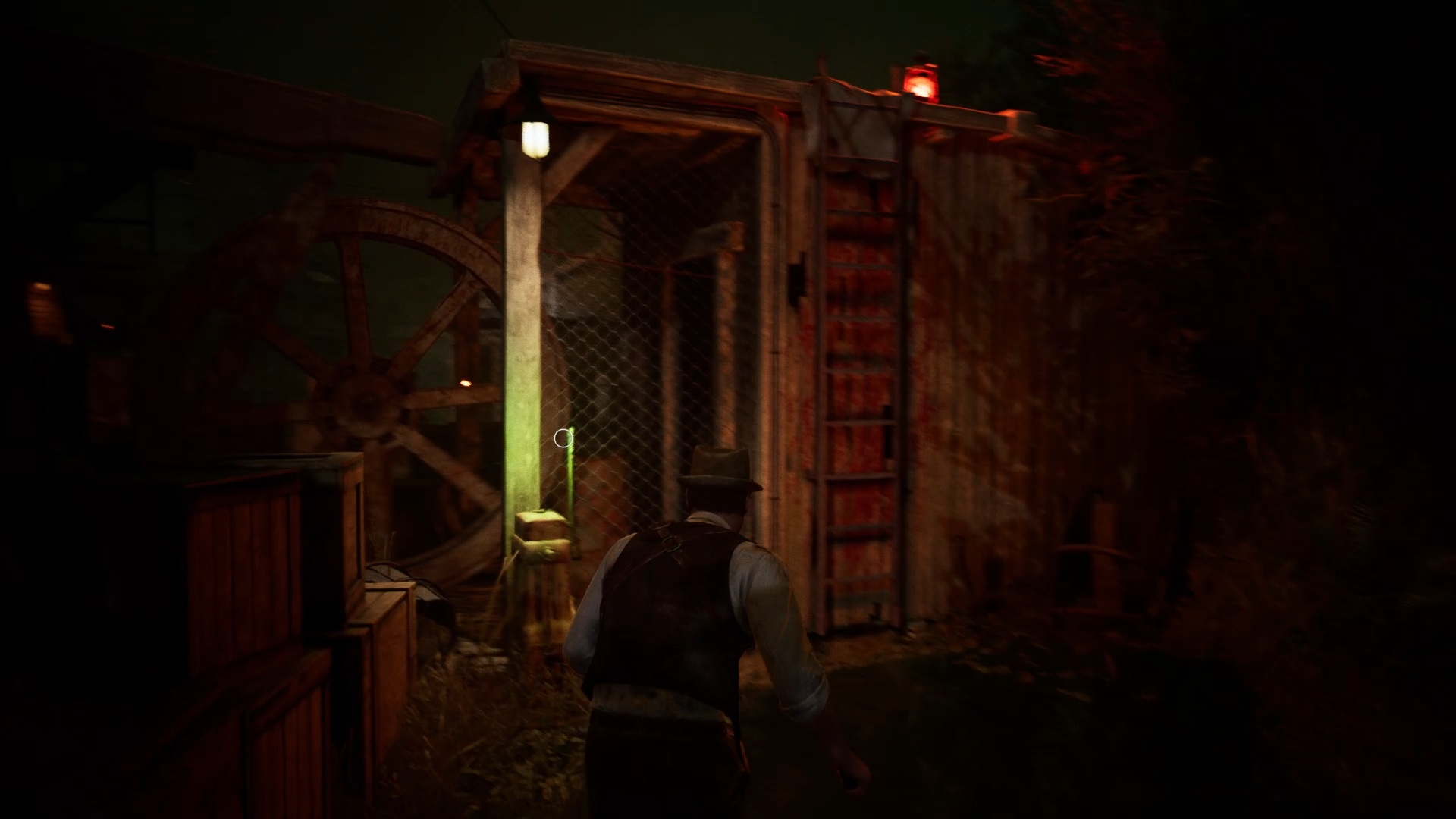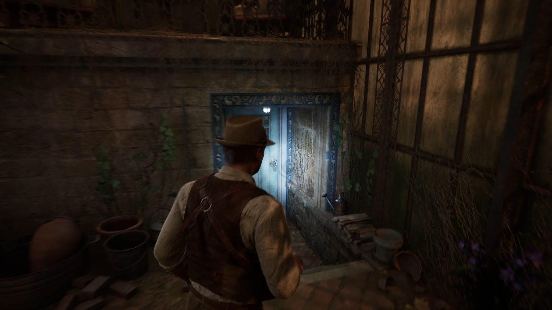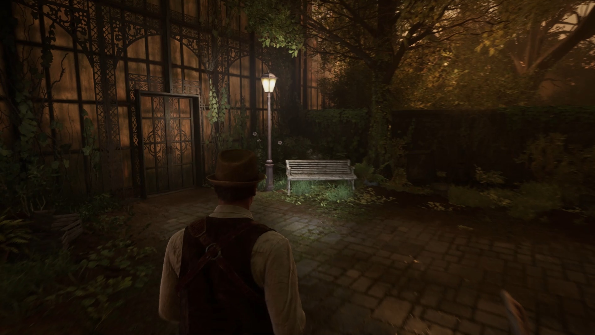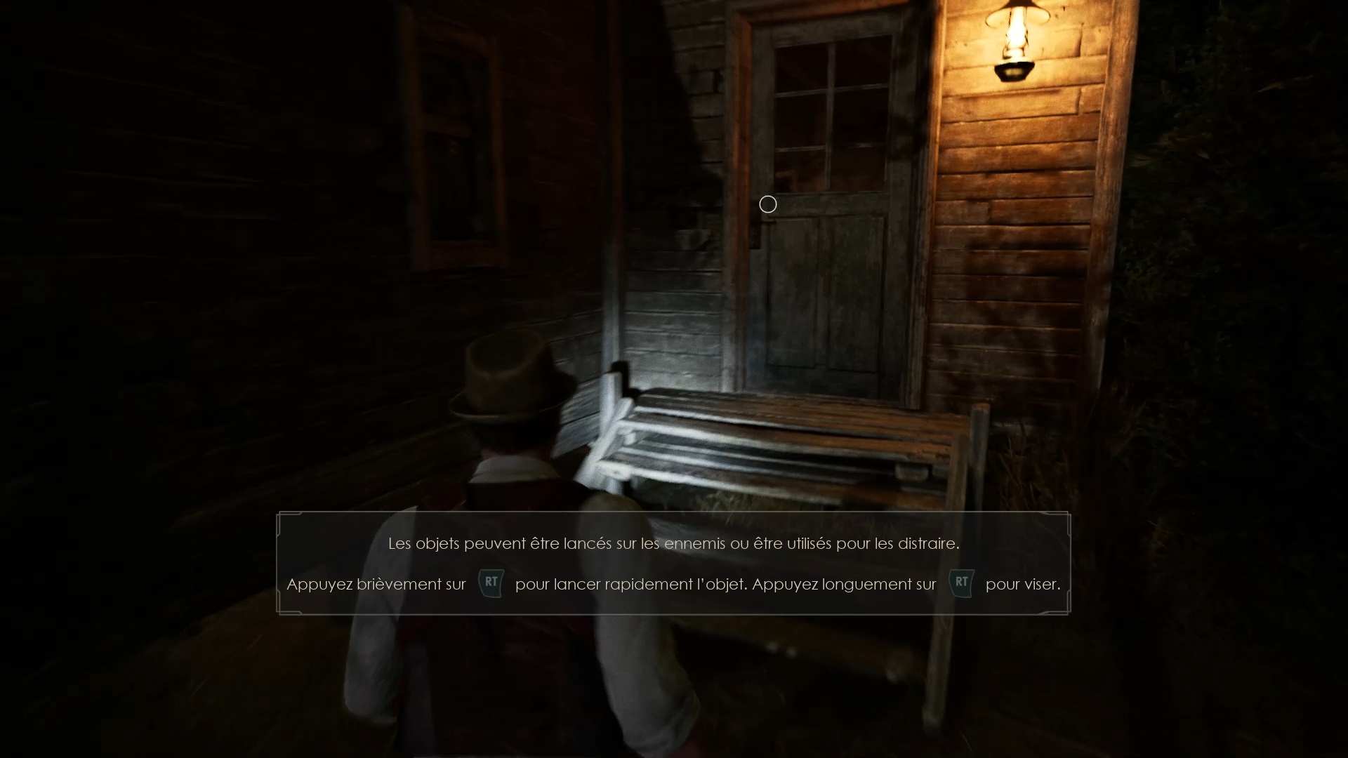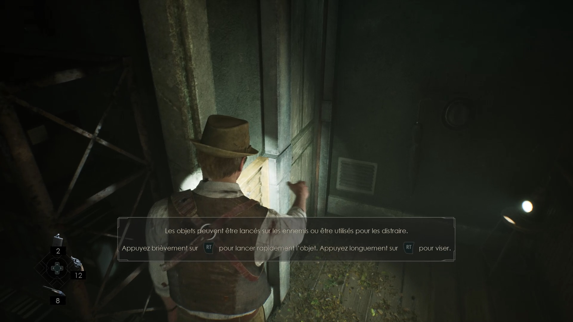 Au début de votre aventure, vous avez le choix de votre personnage, et nous avons opté pour Edward Carnby. En progressant dans la grange, vous remarquerez une lumière dans une étable. Interagissez avec elle pour récupérer une lampe de poche et une clé. Avancez ensuite dans l’obscurité et éclairez le chemin avec votre nouvelle lampe. Utilisez la clé pour ouvrir le portail, puis continuez à travers la cour pour accéder à une porte menant au jardin.
