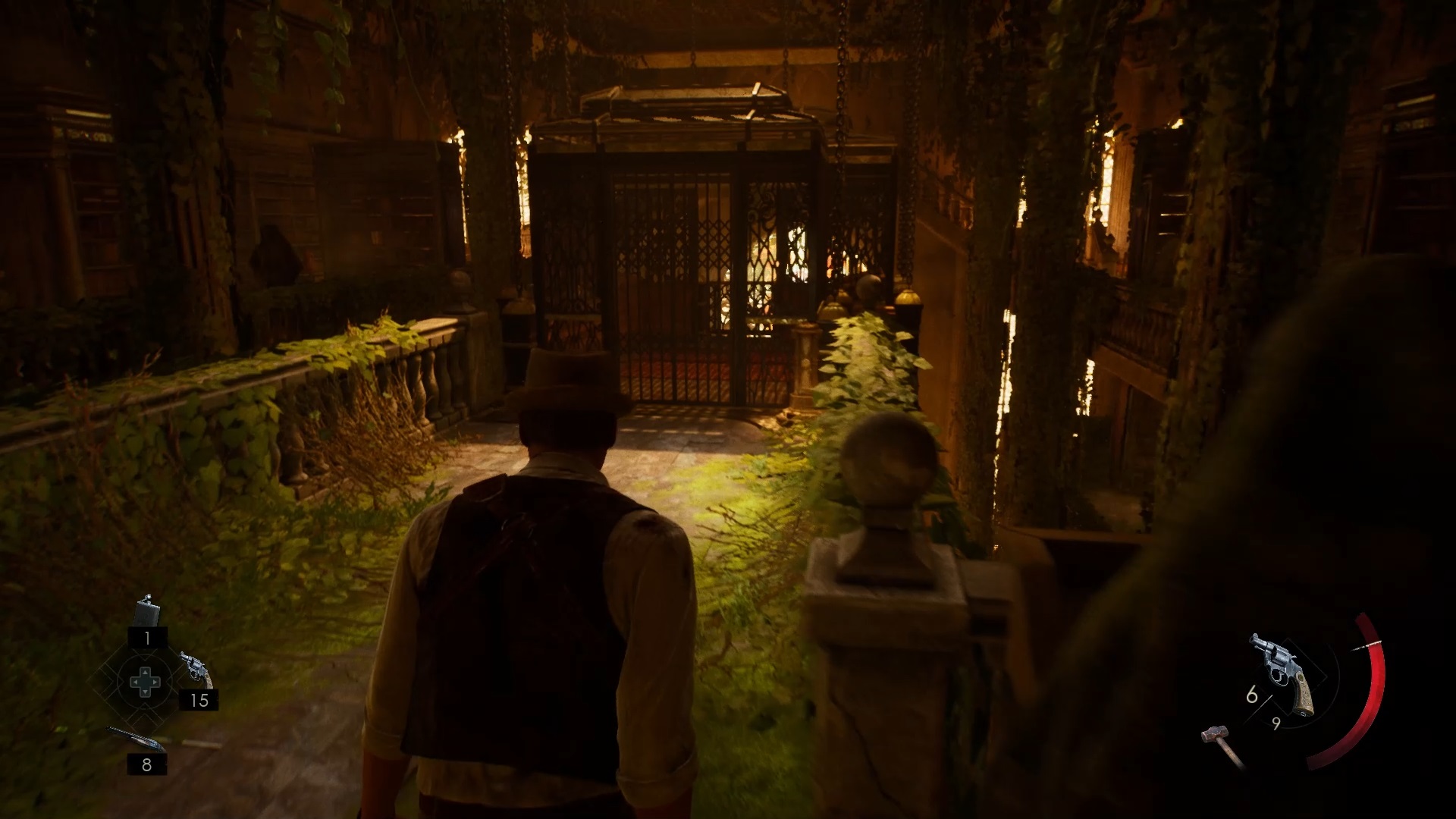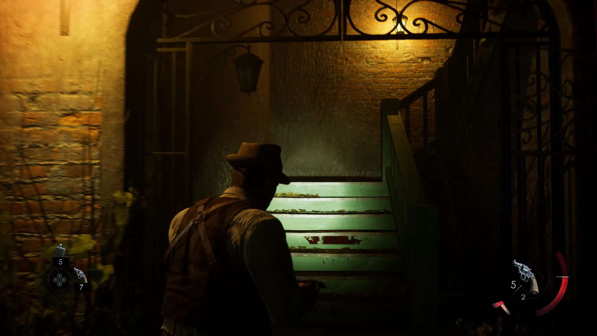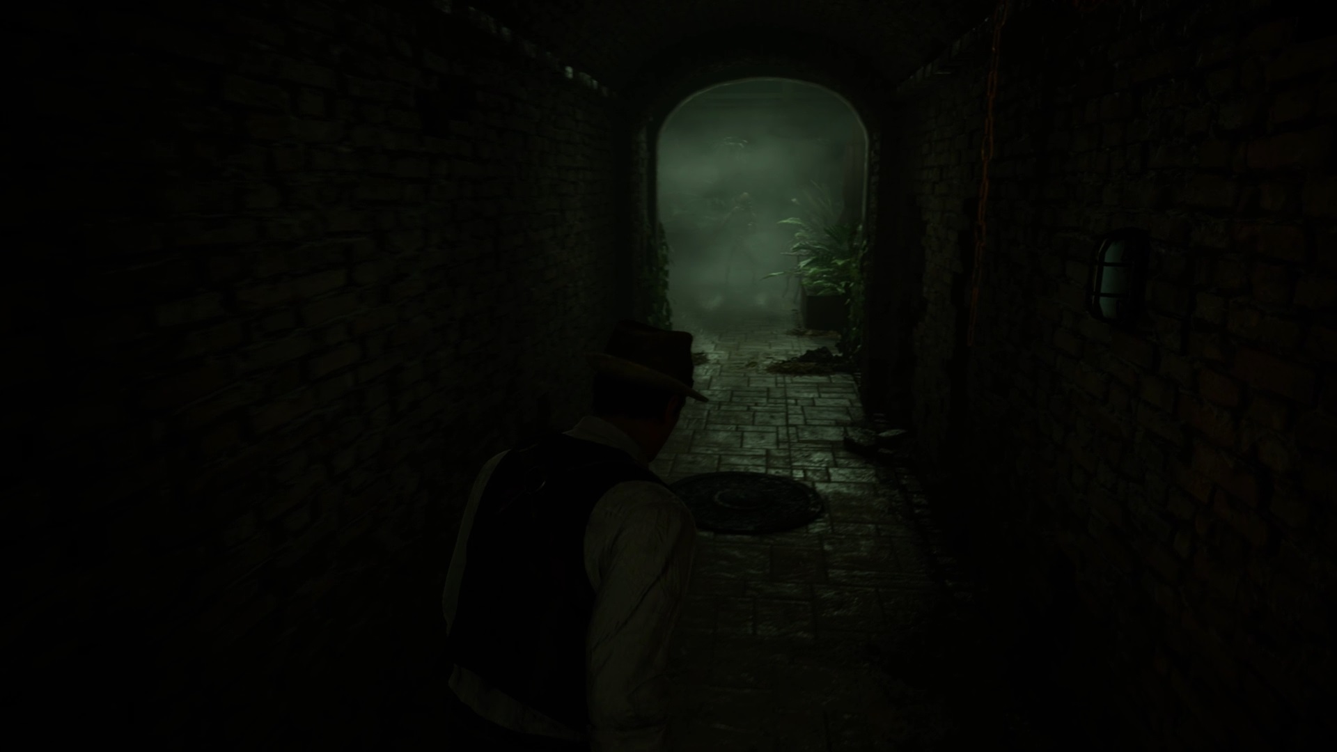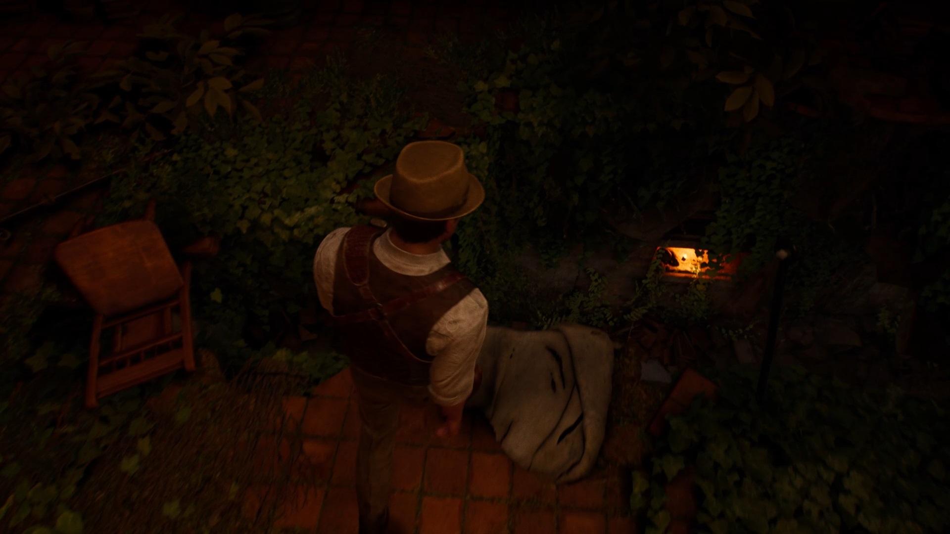 Au début de votre aventure, vous avez le choix de votre personnage, et nous avons opté pour Edward Carnby. En progressant dans la grange, vous remarquerez une lumière dans une étable. Interagissez avec elle pour récupérer une lampe de poche et une clé. Avancez ensuite dans l’obscurité et éclairez le chemin avec votre nouvelle lampe. Utilisez la clé pour ouvrir le portail, puis continuez à travers la cour pour accéder à une porte menant au jardin.