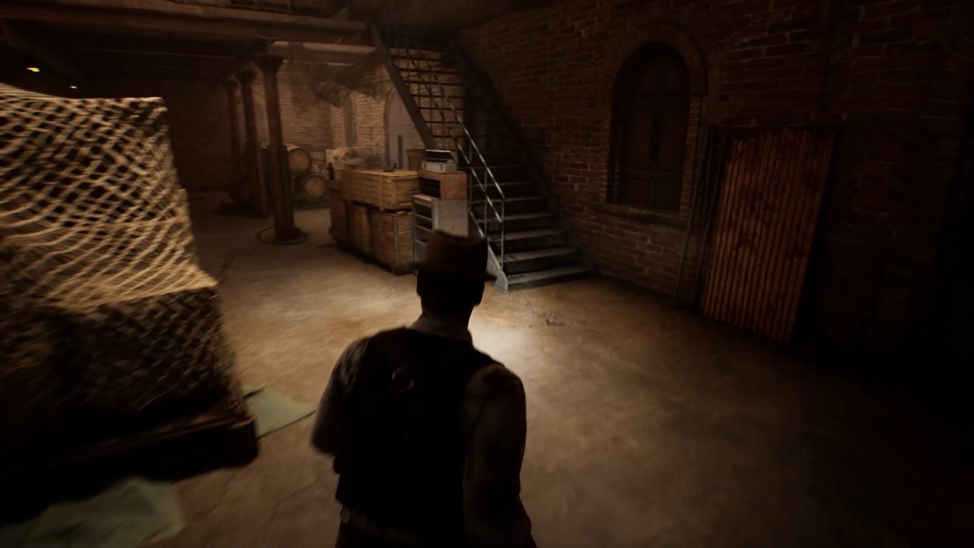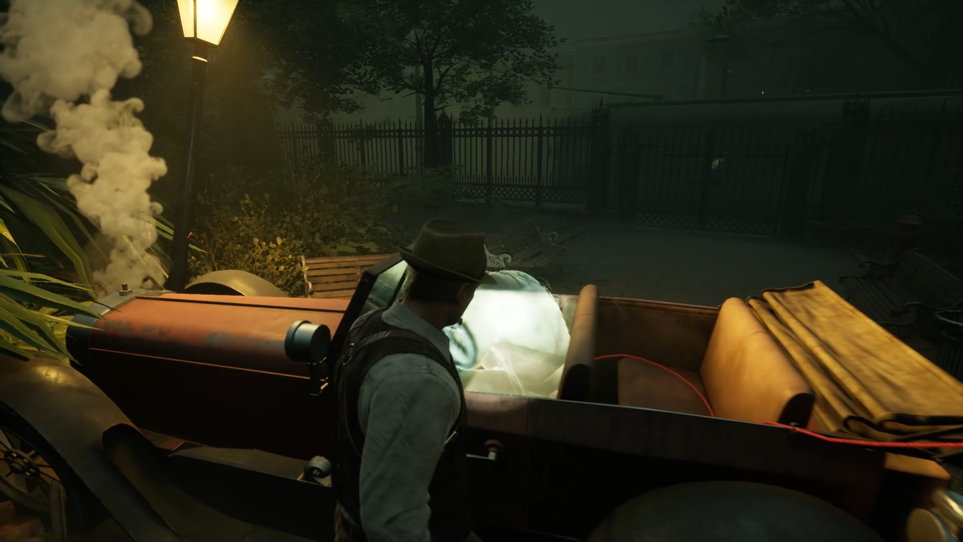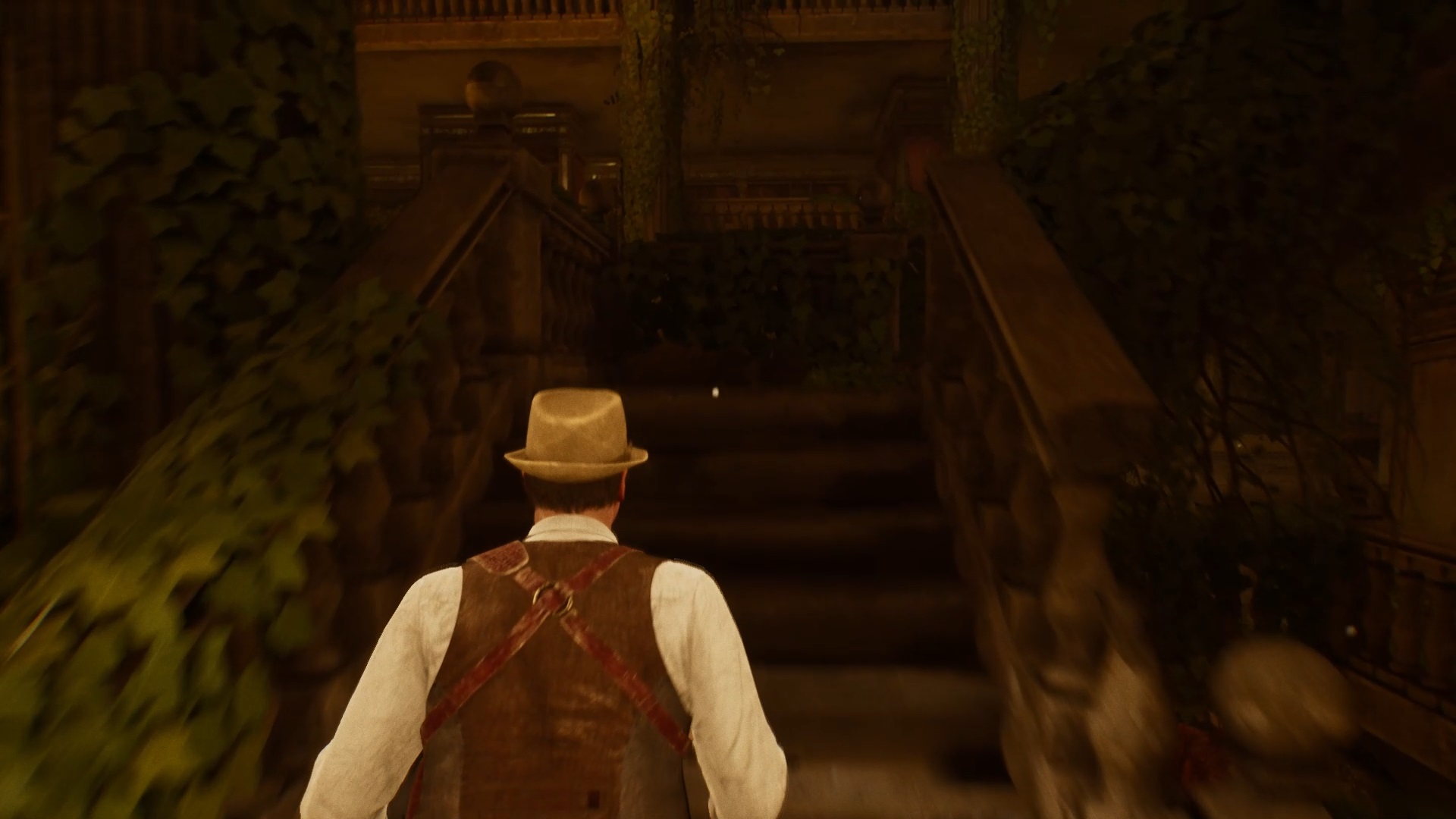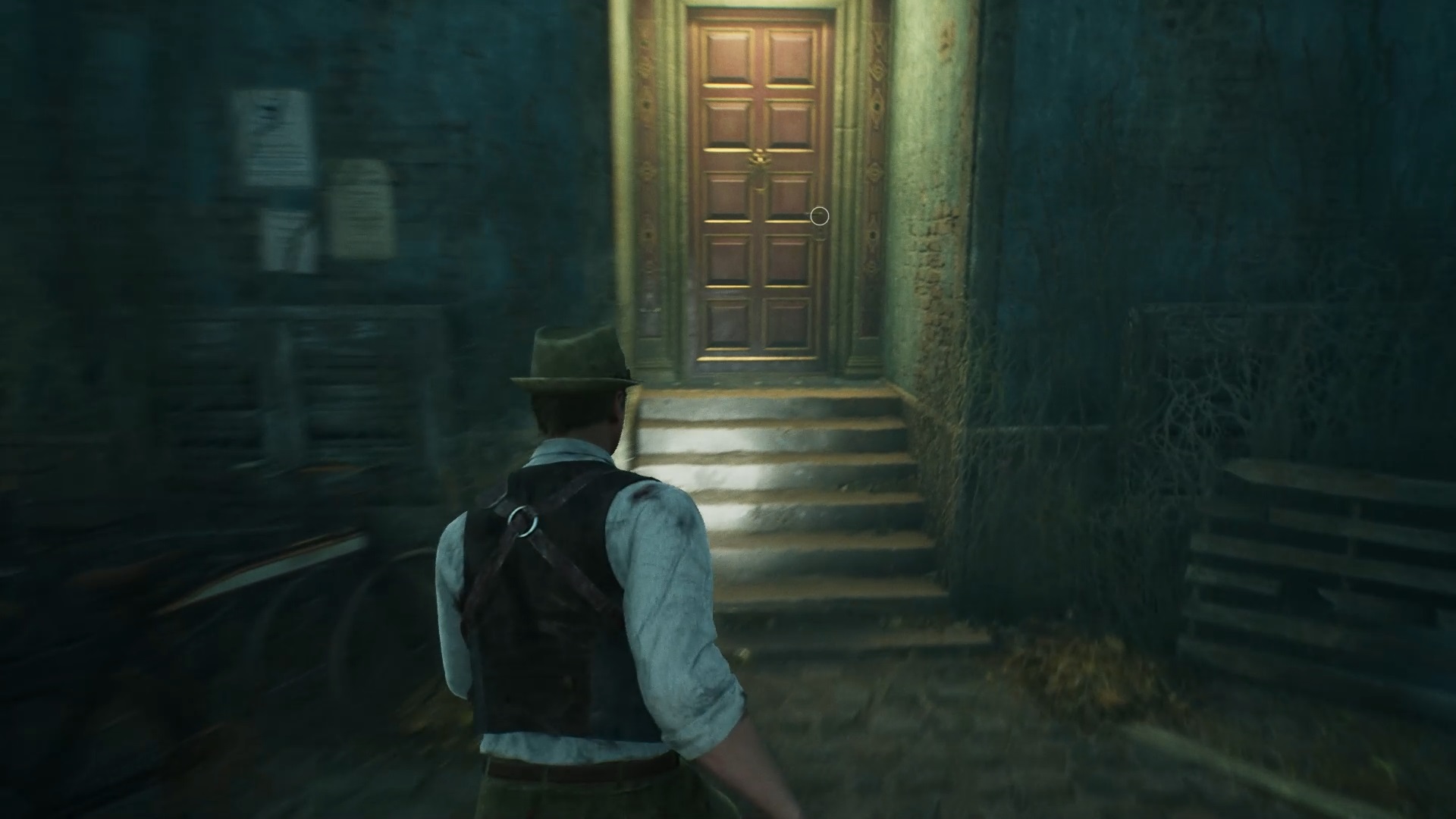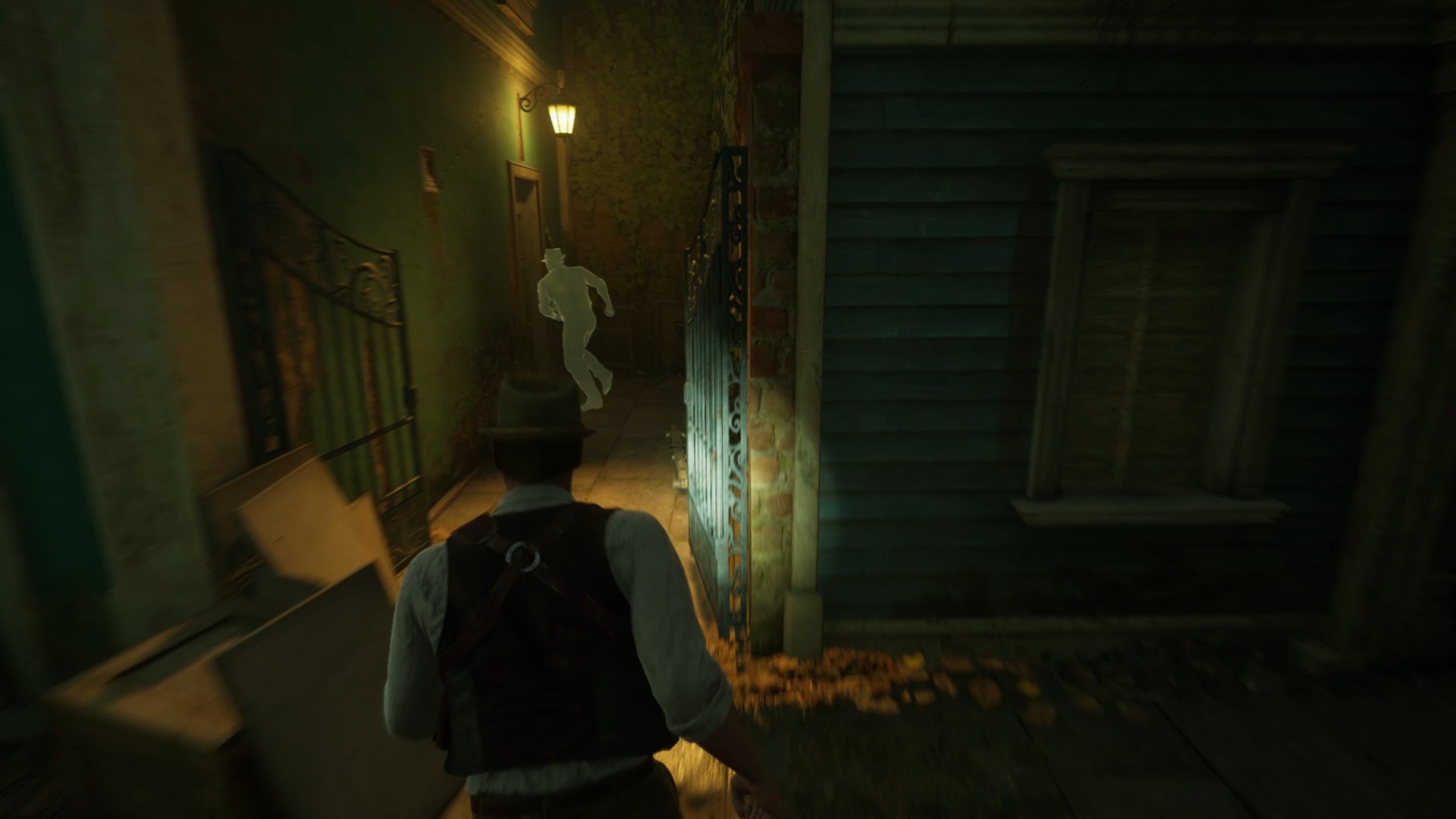 Au début de votre aventure, vous avez le choix de votre personnage, et nous avons opté pour Edward Carnby. En progressant dans la grange, vous remarquerez une lumière dans une étable. Interagissez avec elle pour récupérer une lampe de poche et une clé. Avancez ensuite dans l’obscurité et éclairez le chemin avec votre nouvelle lampe. Utilisez la clé pour ouvrir le portail, puis continuez à travers la cour pour accéder à une porte menant au jardin.