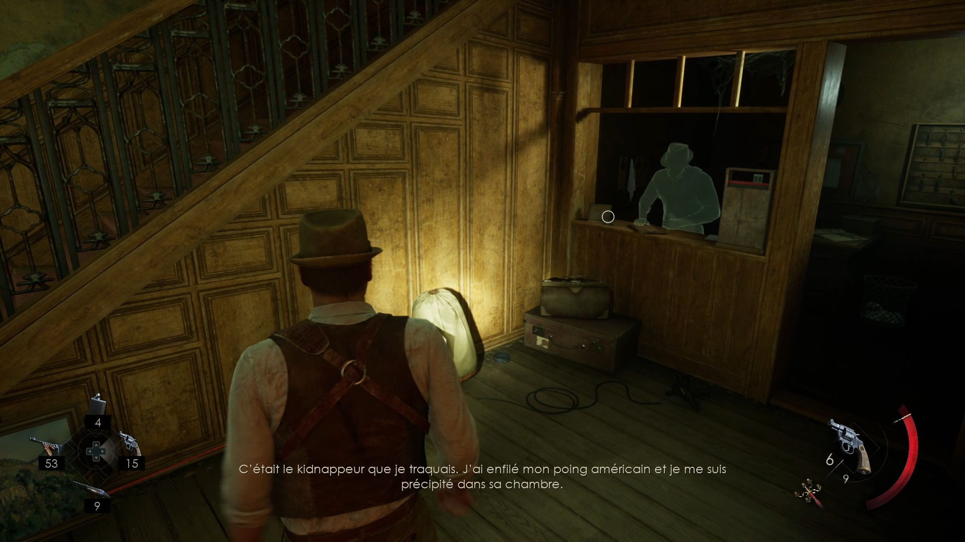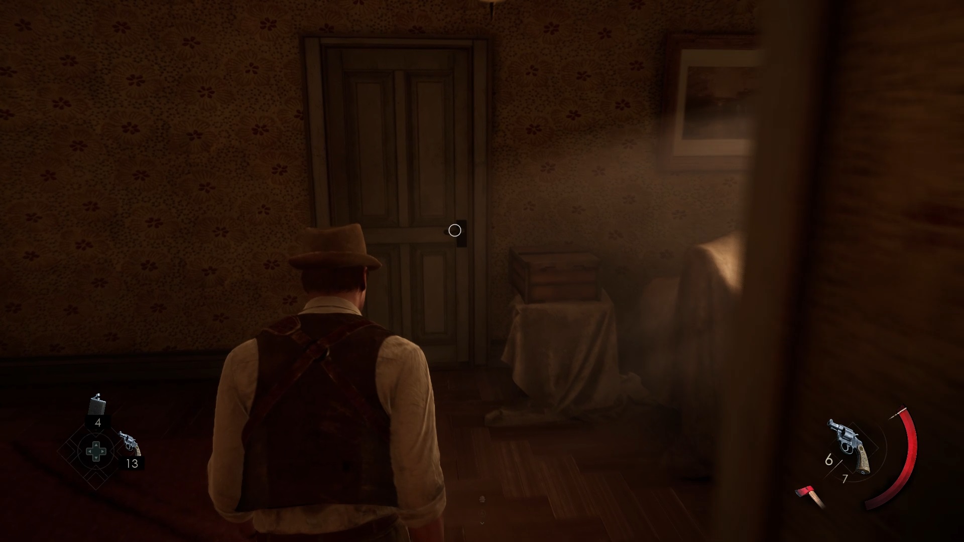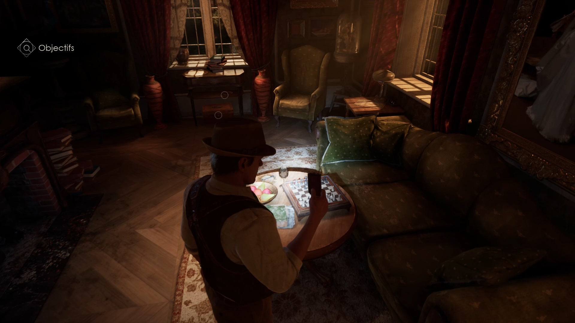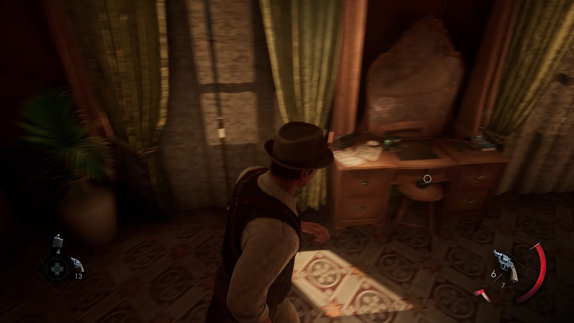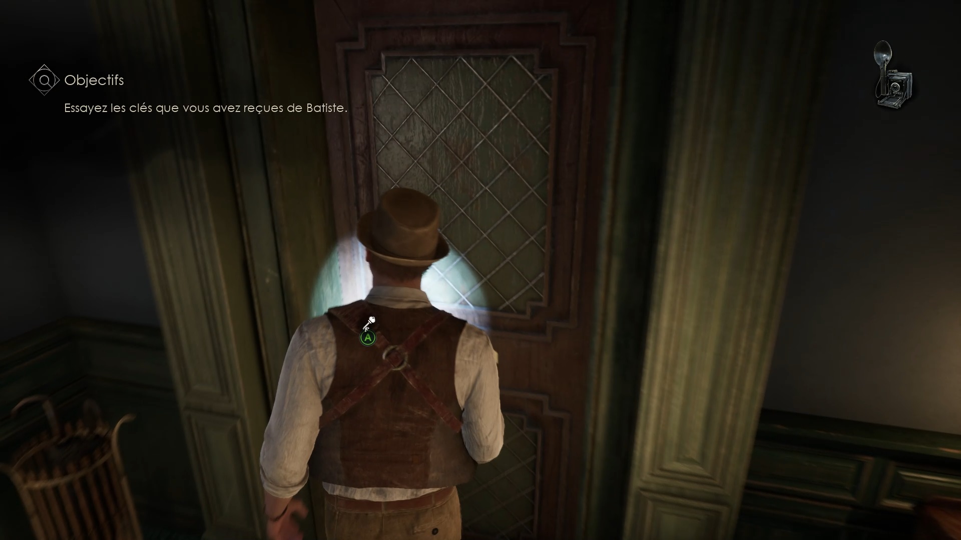 Enfoncez-vous dans le bayou pour faire une mystérieuse rencontre. De retour au manoir, fouillez la valise dans le petit parloir pour obtenir un couteau et une clé. Utilisez la clé sur la porte à proximité pour dégager l’accès au salon et entrez. Récupérez une autre clé sur la table au centre.