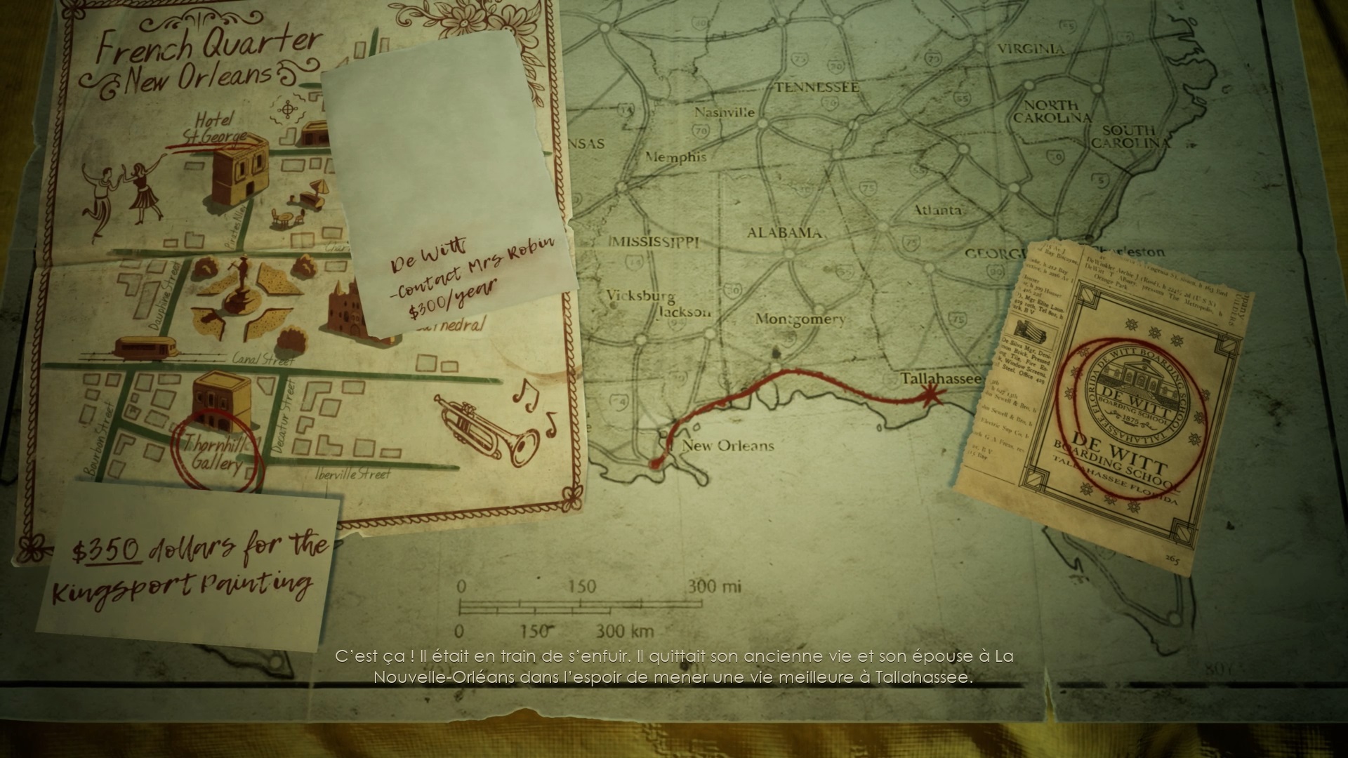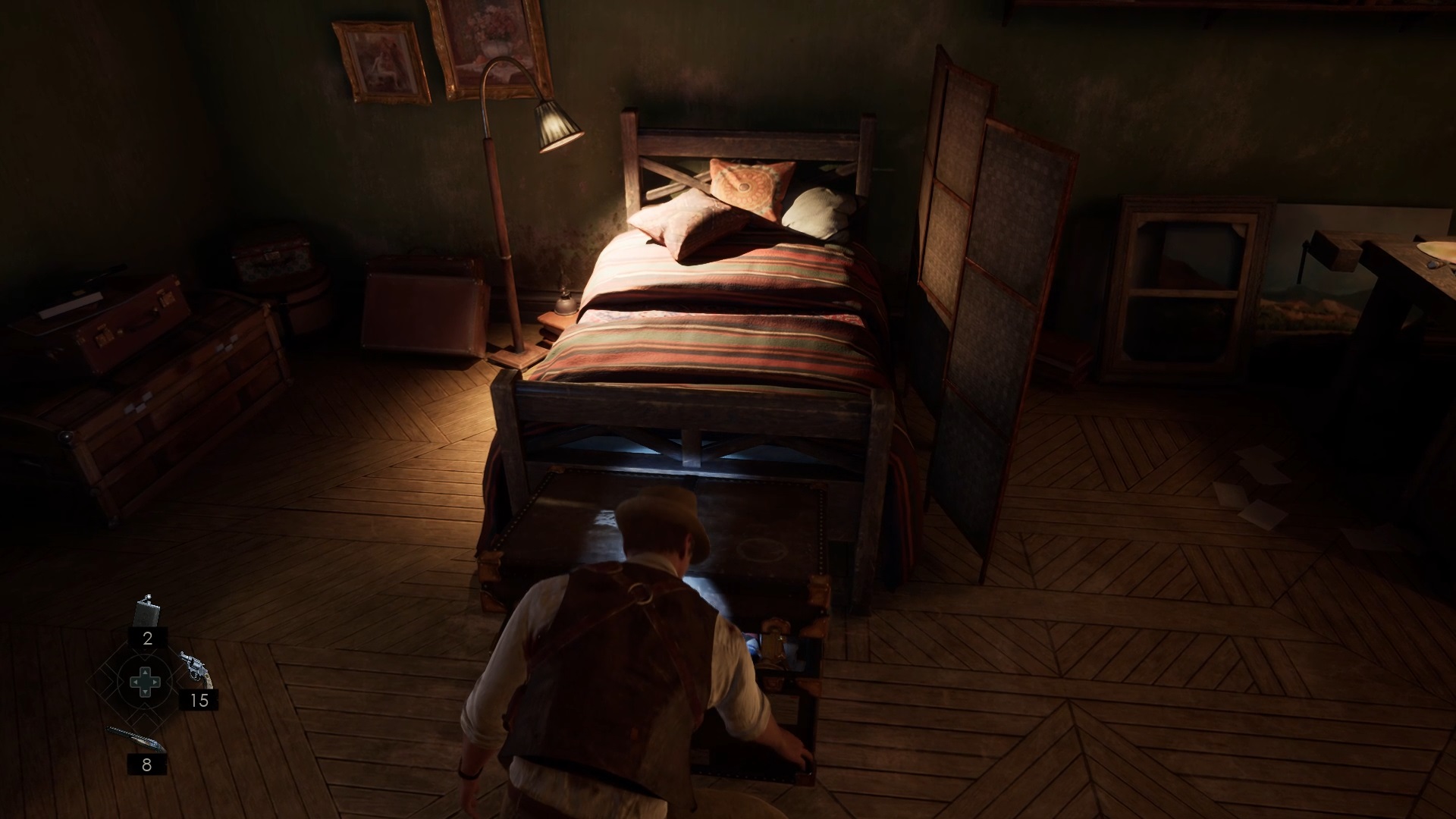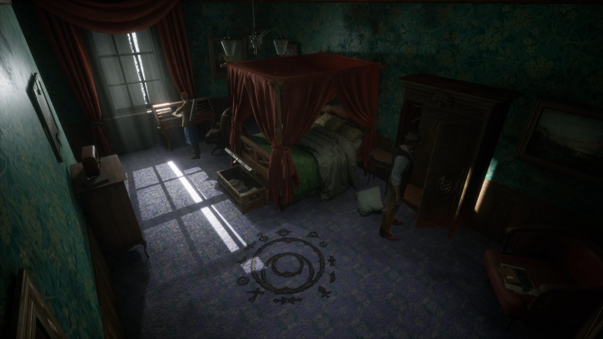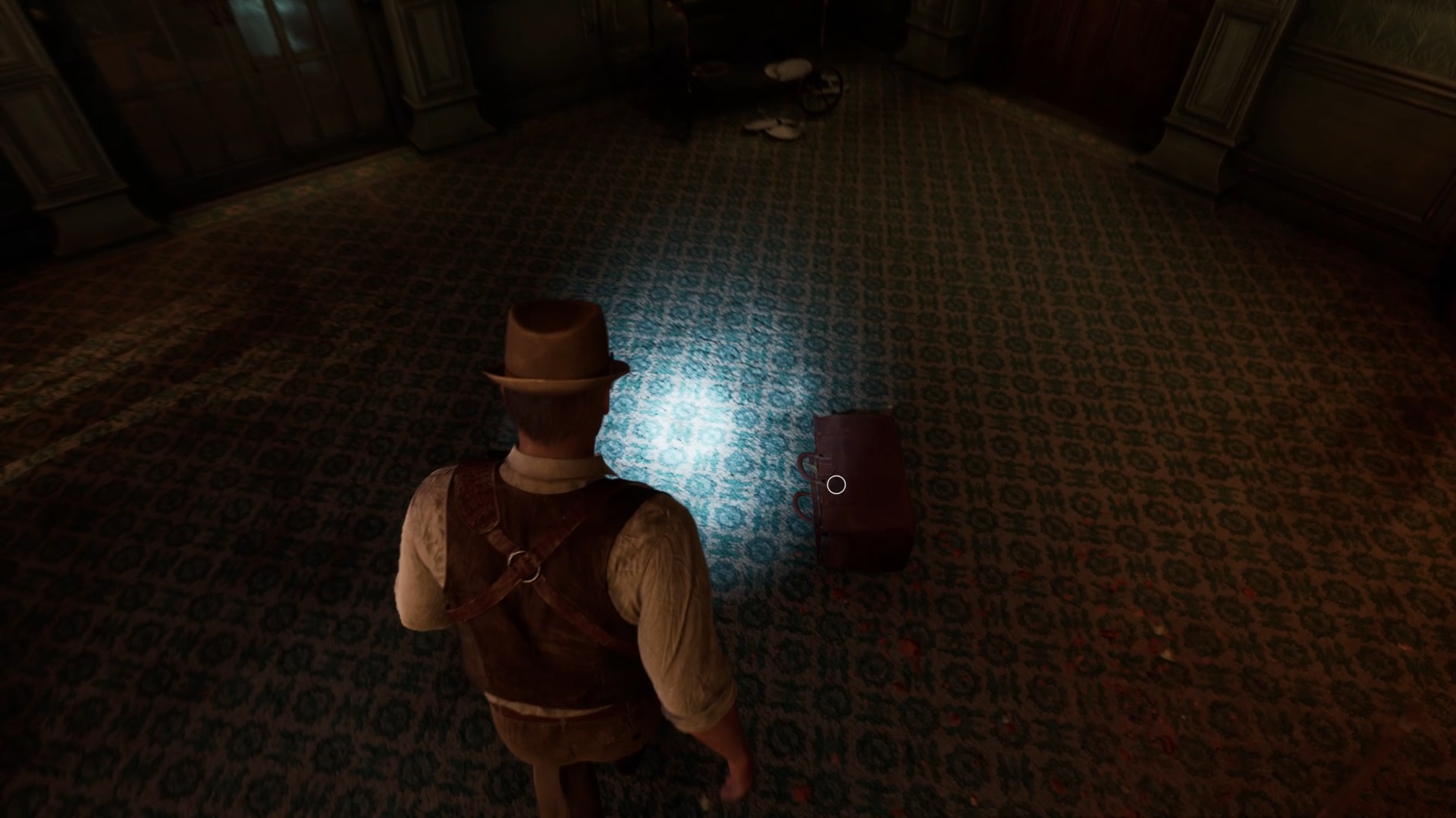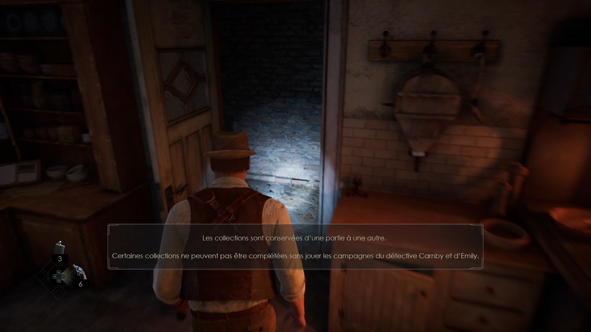 Enfoncez-vous dans le bayou pour faire une mystérieuse rencontre. De retour au manoir, fouillez la valise dans le petit parloir pour obtenir un couteau et une clé. Utilisez la clé sur la porte à proximité pour dégager l’accès au salon et entrez. Récupérez une autre clé sur la table au centre.