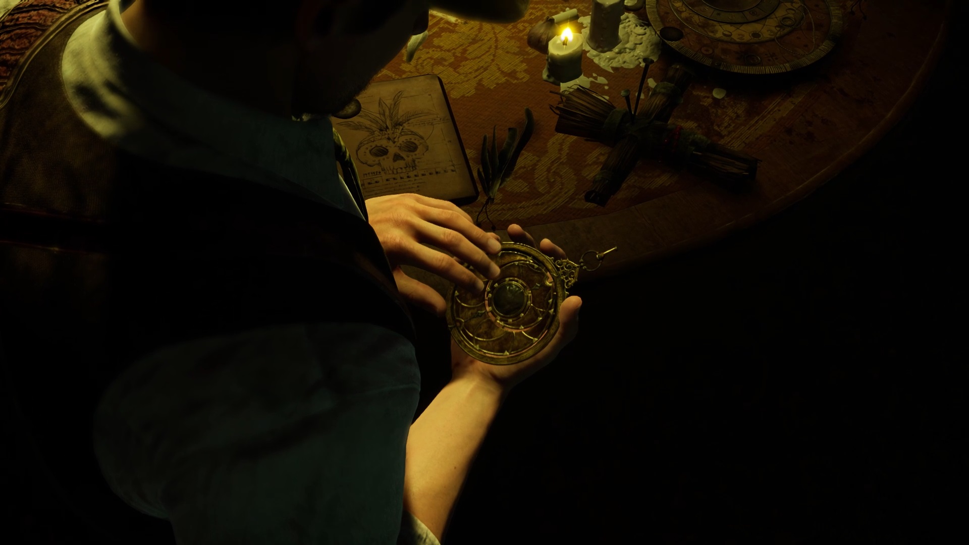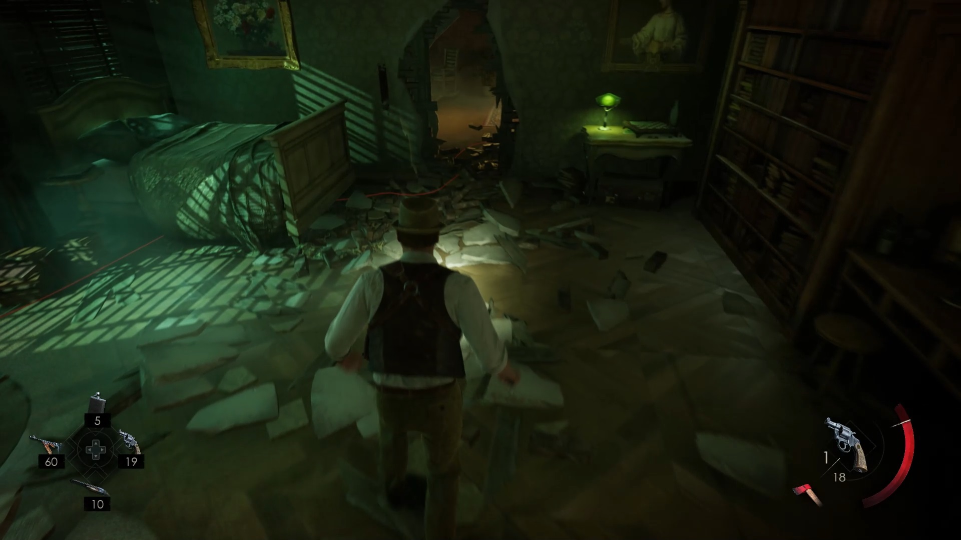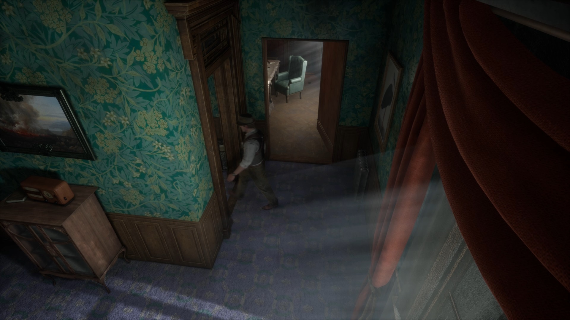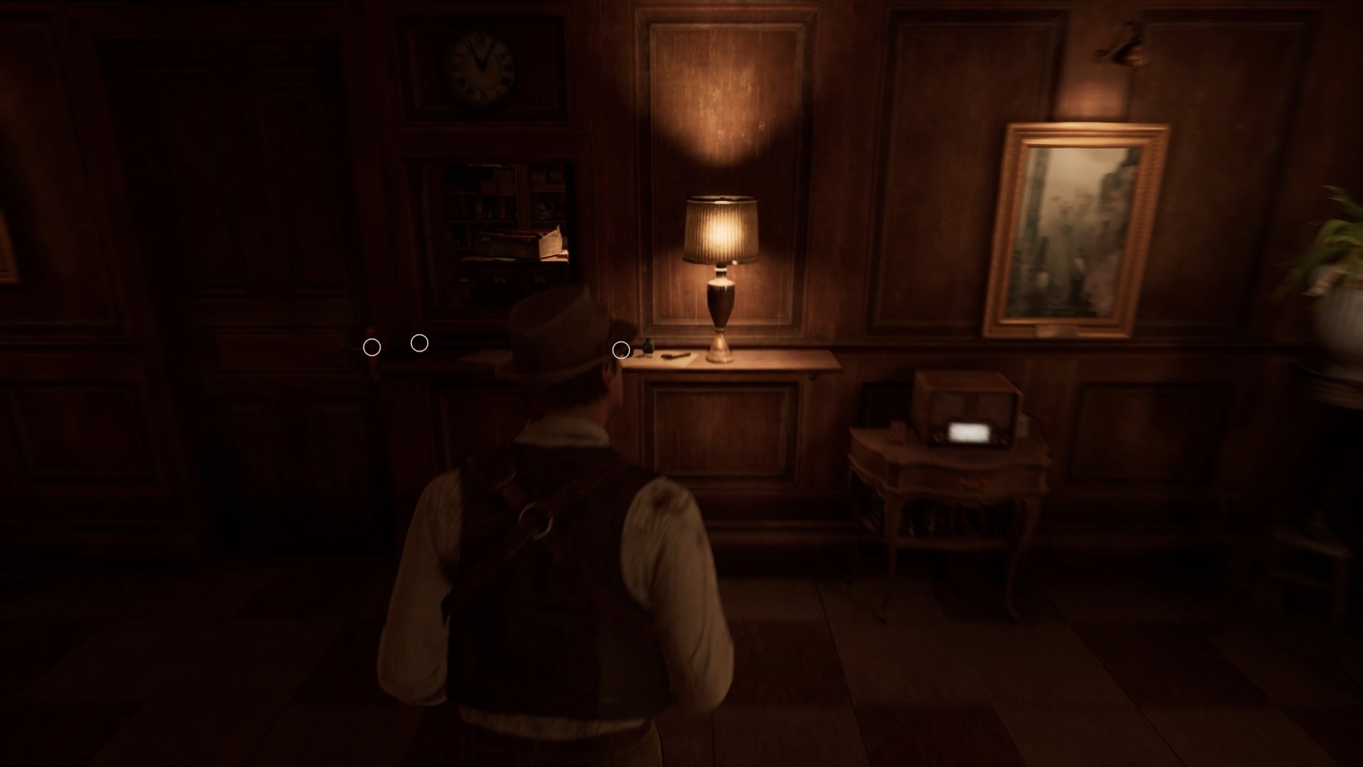 Enfoncez-vous dans le bayou pour faire une mystérieuse rencontre. De retour au manoir, fouillez la valise dans le petit parloir pour obtenir un couteau et une clé. Utilisez la clé sur la porte à proximité pour dégager l’accès au salon et entrez. Récupérez une autre clé sur la table au centre.
