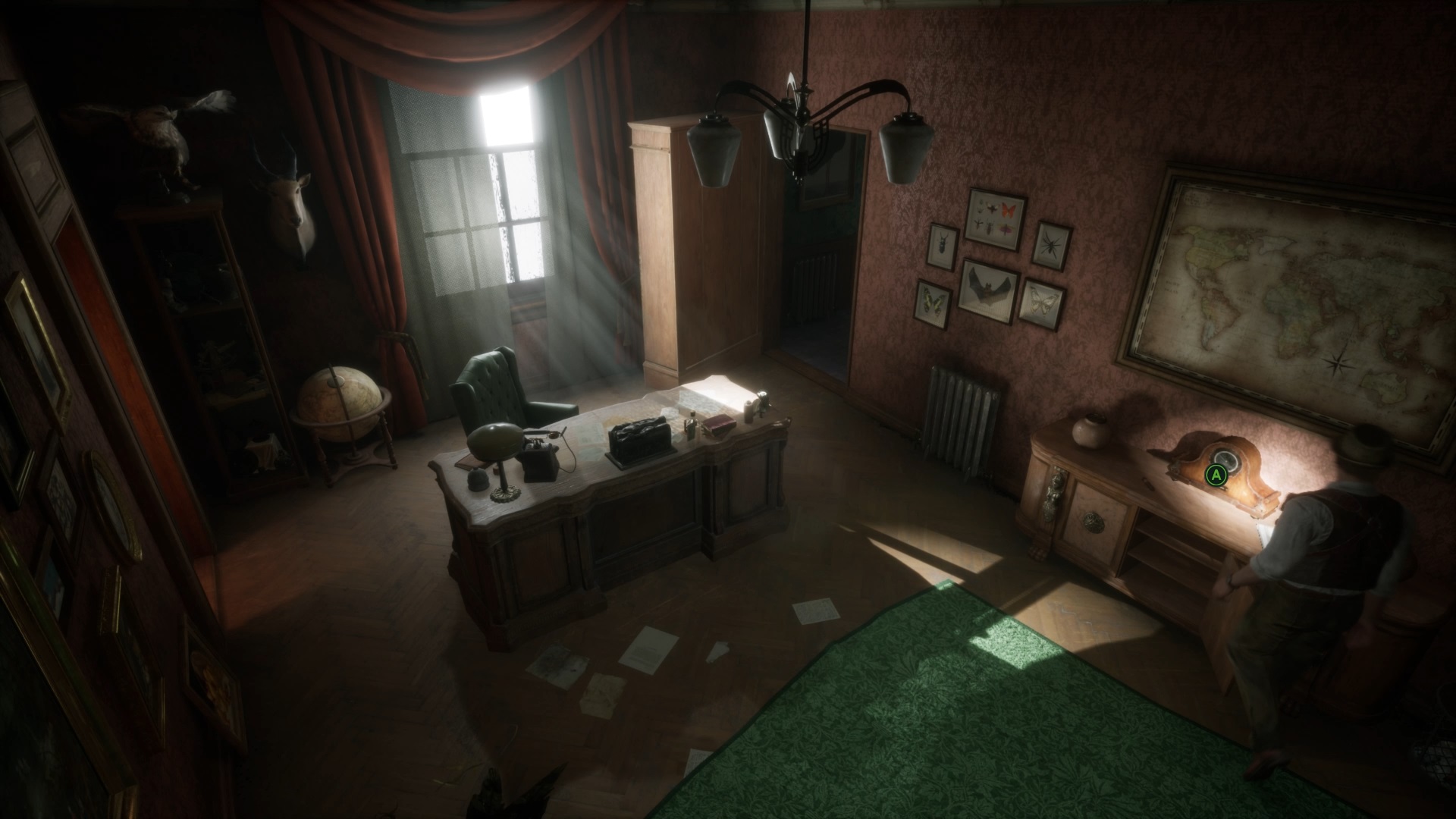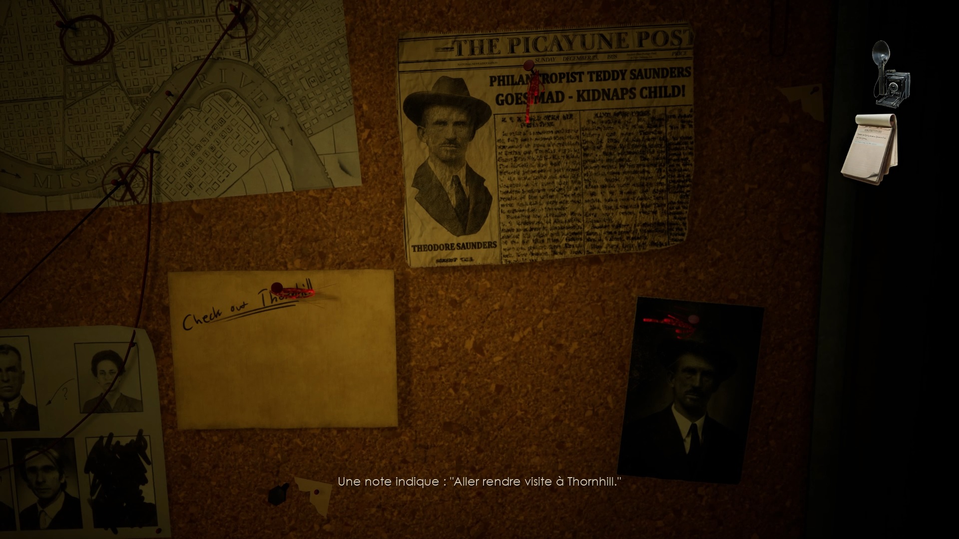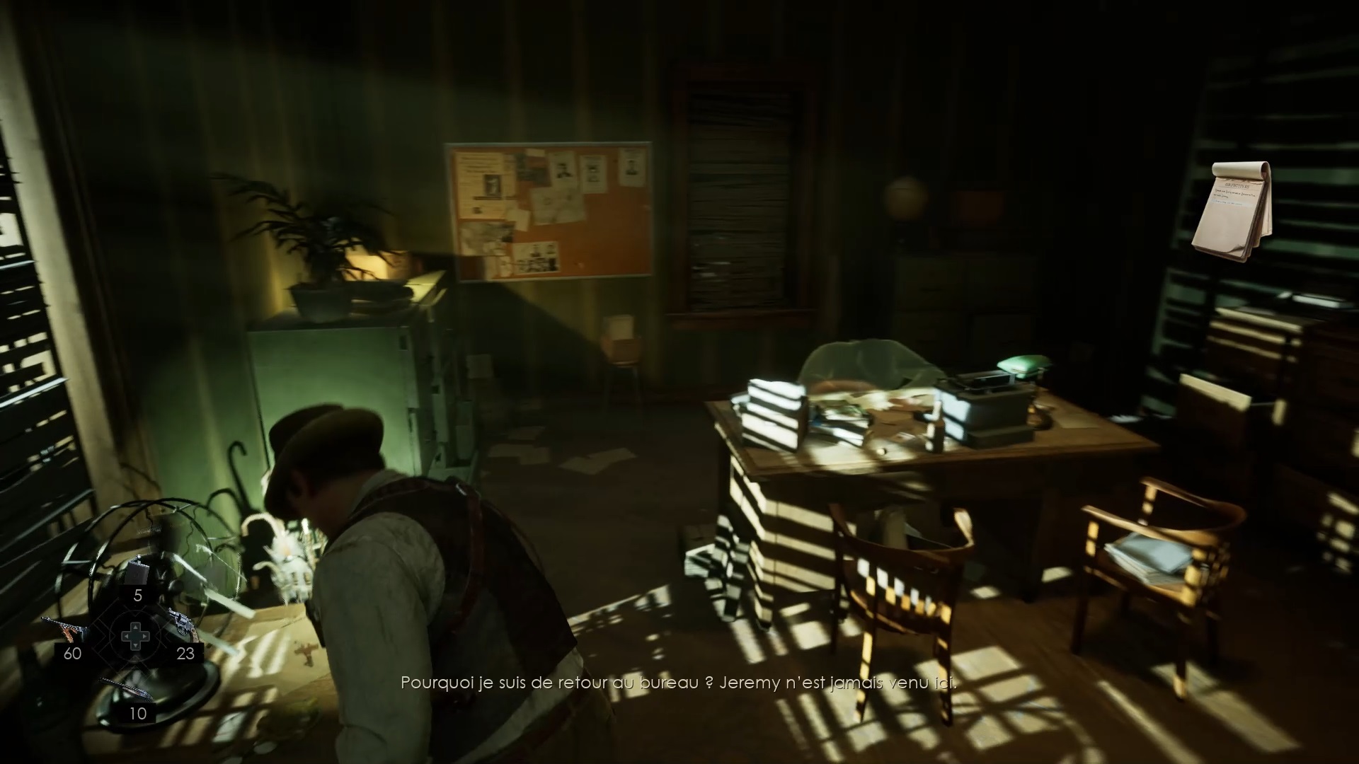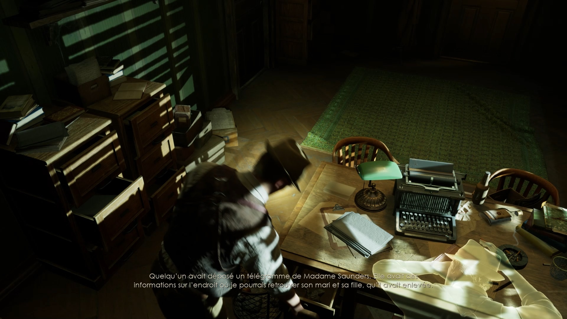 Vous voyagerez vers un nouveau souvenir. Fouillez la pièce en interagissant près du ventilateur et du bureau. Utilisez la clé sur le tiroir du bureau pour trouver une photo et une coupure de presse. Écoutez le souvenir de Carnby sur le bureau et déposez le télégramme, la coupure de presse et la photo contre le tableau d’enquête.
