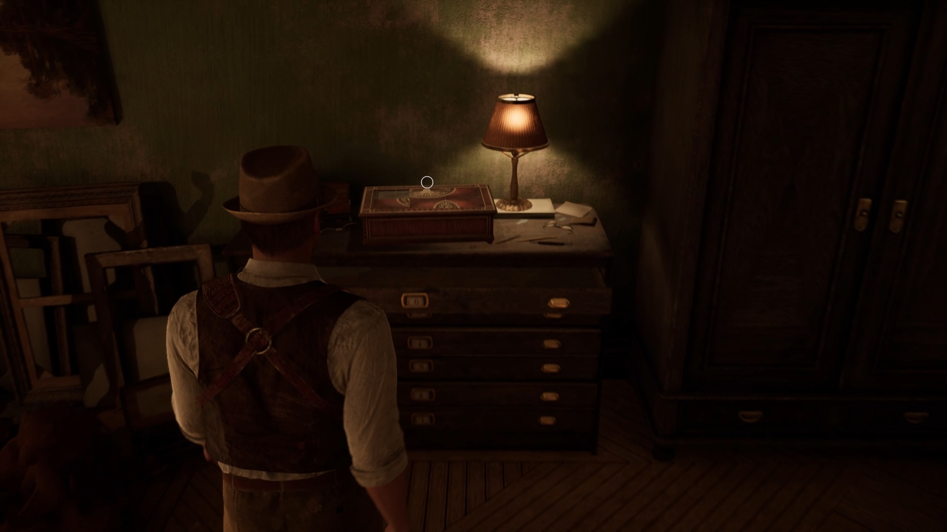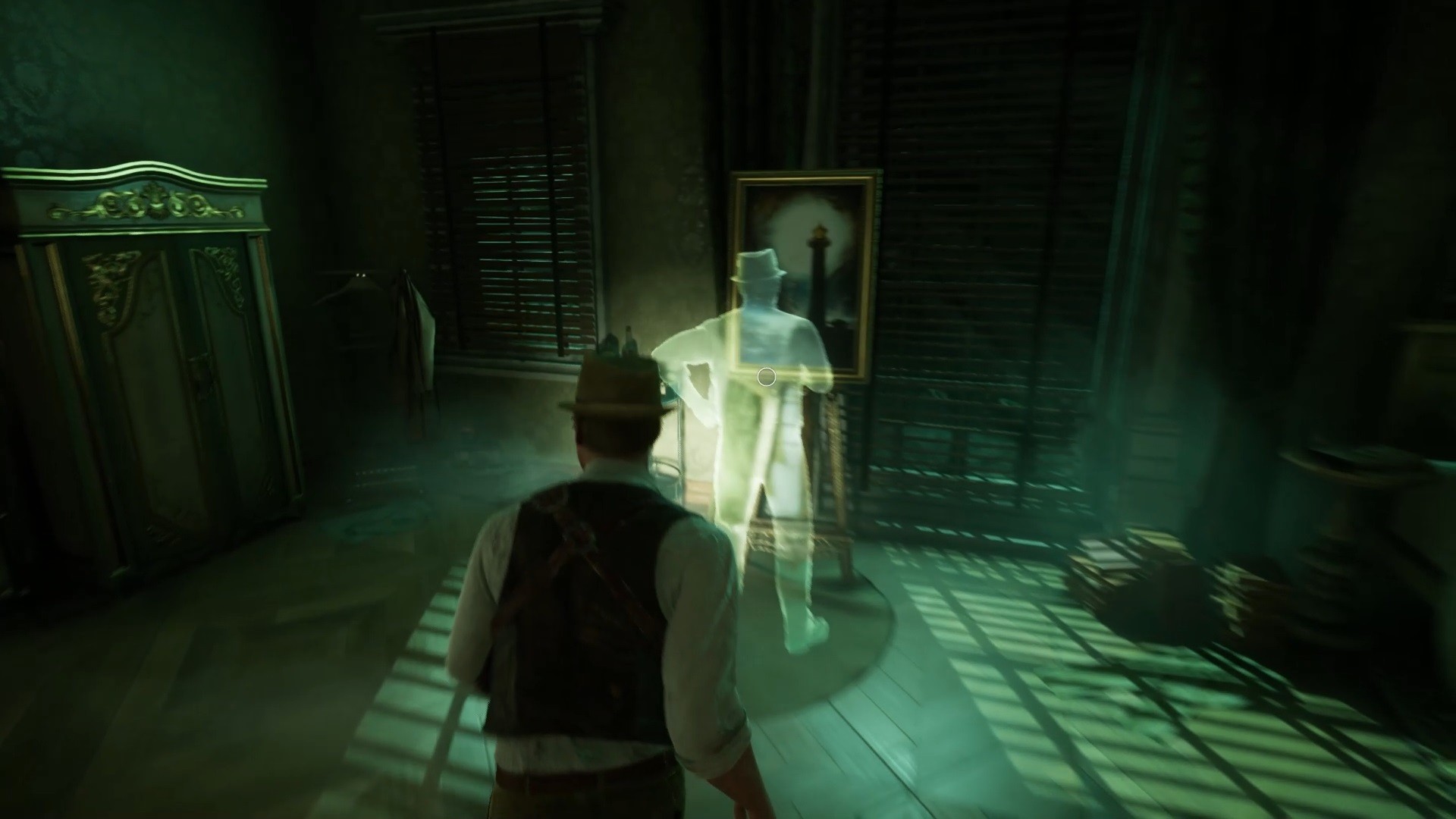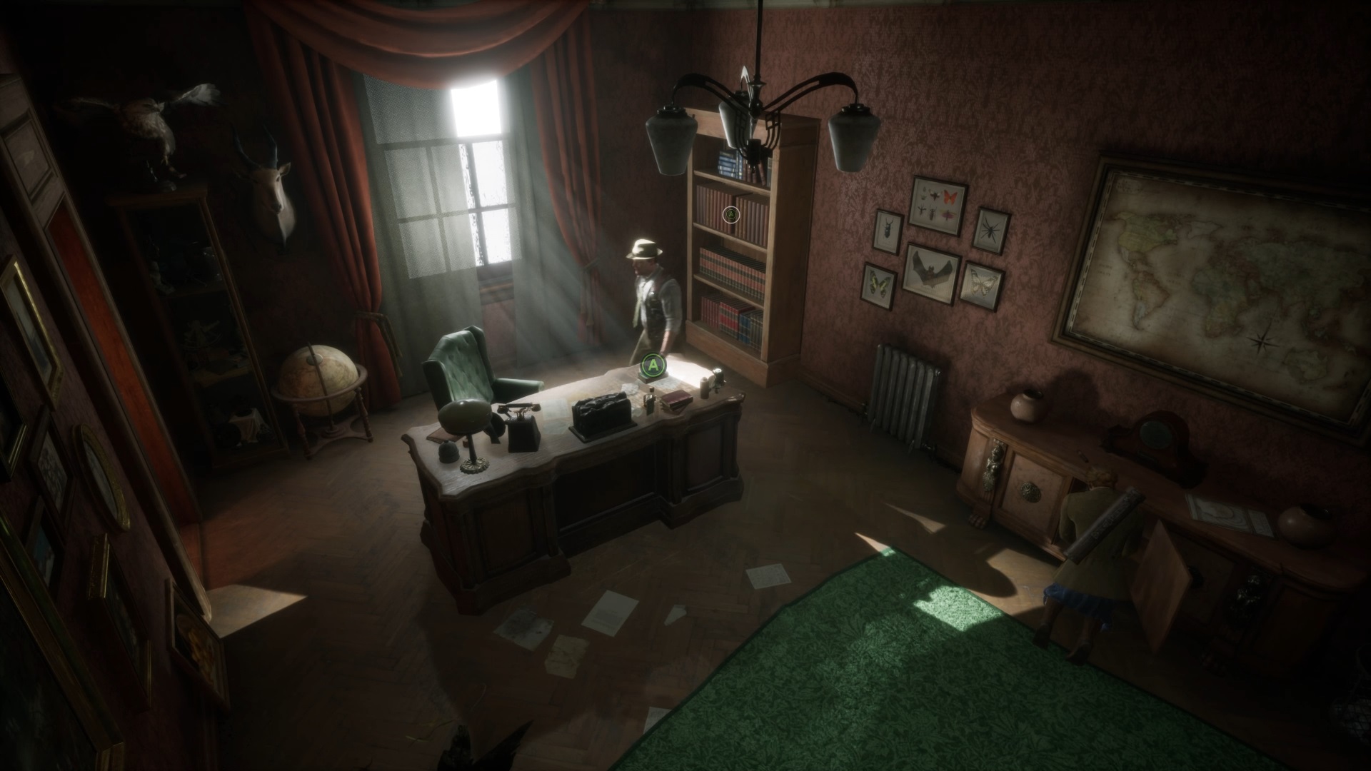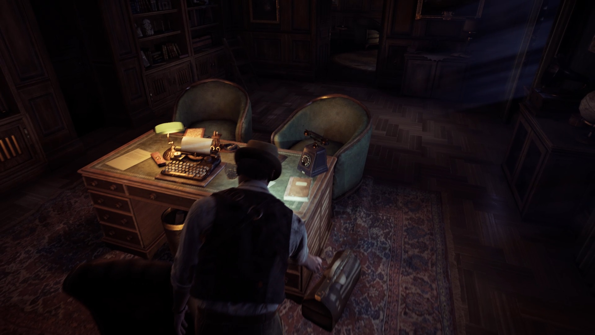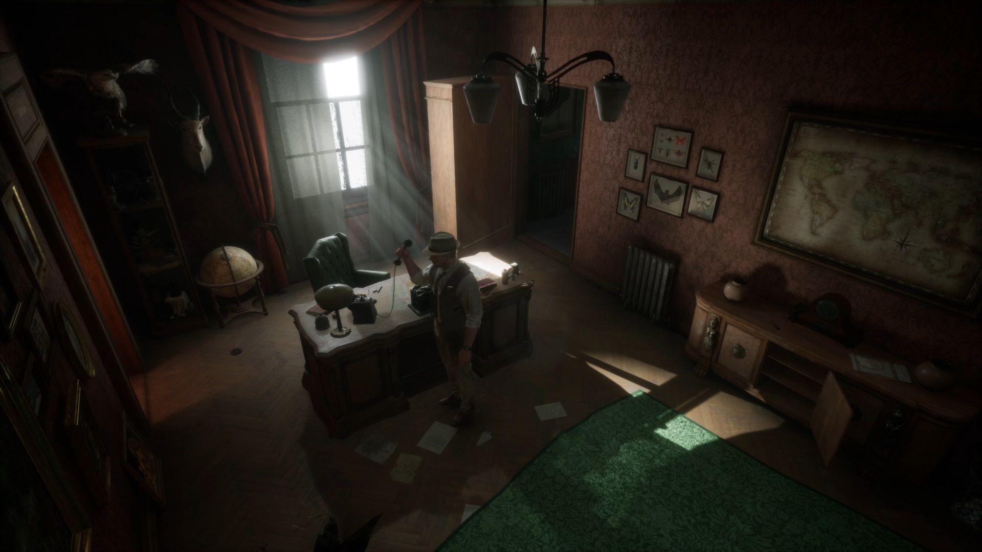 Vous voyagerez vers un nouveau souvenir. Fouillez la pièce en interagissant près du ventilateur et du bureau. Utilisez la clé sur le tiroir du bureau pour trouver une photo et une coupure de presse. Écoutez le souvenir de Carnby sur le bureau et déposez le télégramme, la coupure de presse et la photo contre le tableau d’enquête.