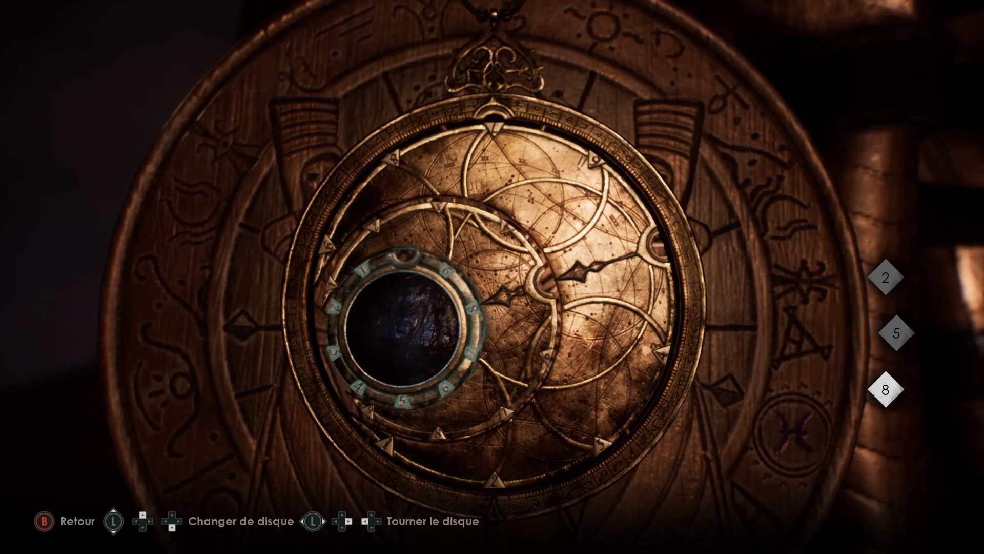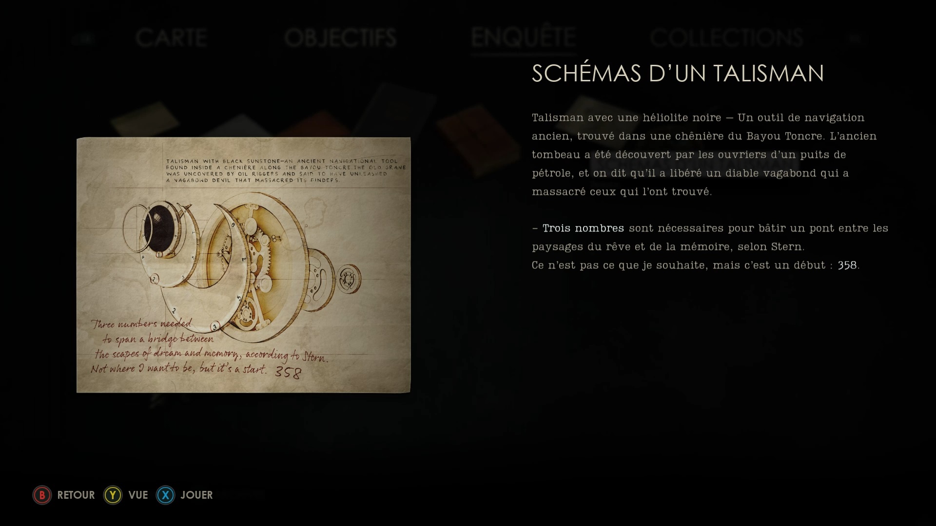 Une fois dans la cour, éliminez les menaces puis montez à l’étage. Entrez dans la chambre au fond et récupérez le talisman sur la table. Examinez le document dans votre inventaire pour trouver un code dans le schéma du talisman. Placez ensuite le talisman sur le dispositif de la table et utilisez le code 358 pour voyager.