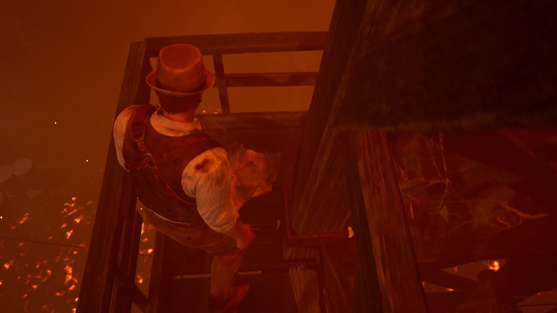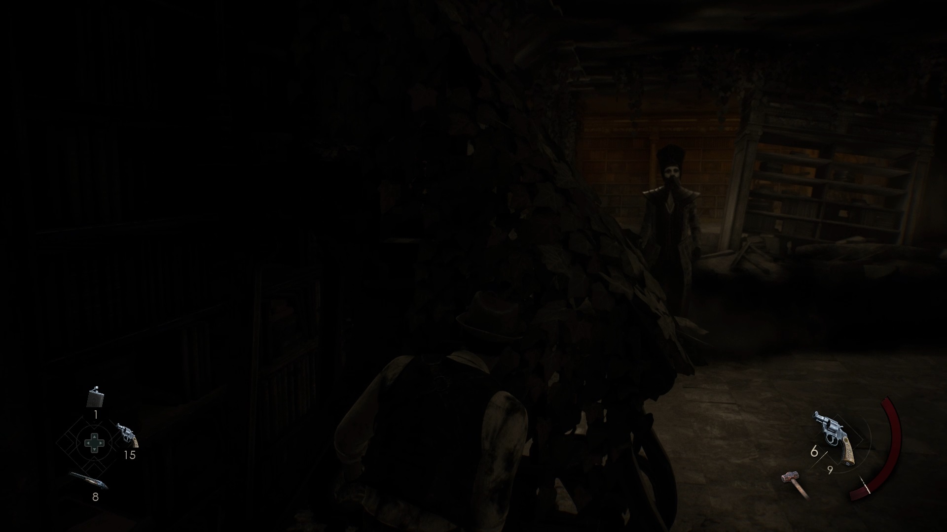 L’homme mystérieux apparaît soudainement. Vous devez simplement dévier la caméra de son regard pour ne pas sombrer. Descendez au rez-de-chaussée pour vous défaire plus facilement de l’homme mystérieux. Remontez au premier étage pour utiliser la clé sur un socle. Montez l’échelle pour utiliser à nouveau la clé sur un socle au fond. Montez la nouvelle échelle pour rejoindre la cage d’ascenseur et sortir grâce à la clé.
