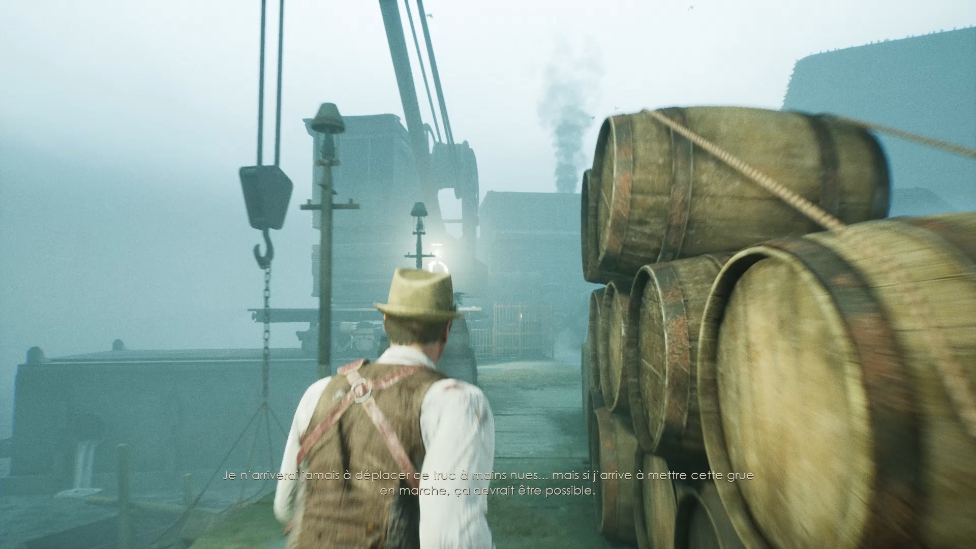 Rejoignez la grue près de l’eau pour trouver un panneau de commande. Utilisez la clé pour ouvrir un passage dans les égouts. Enfoncez-vous dans les égouts pour atteindre l’entrepôt en haut d’une échelle.
