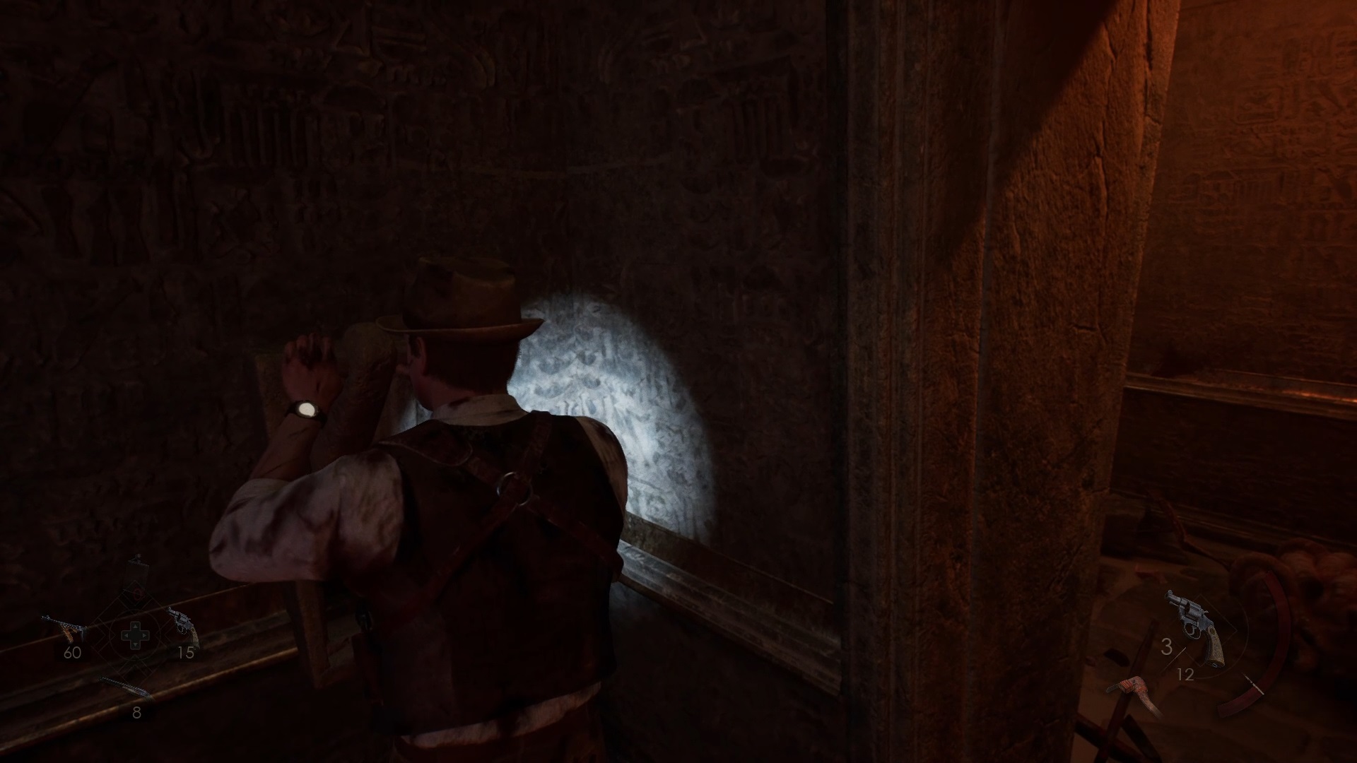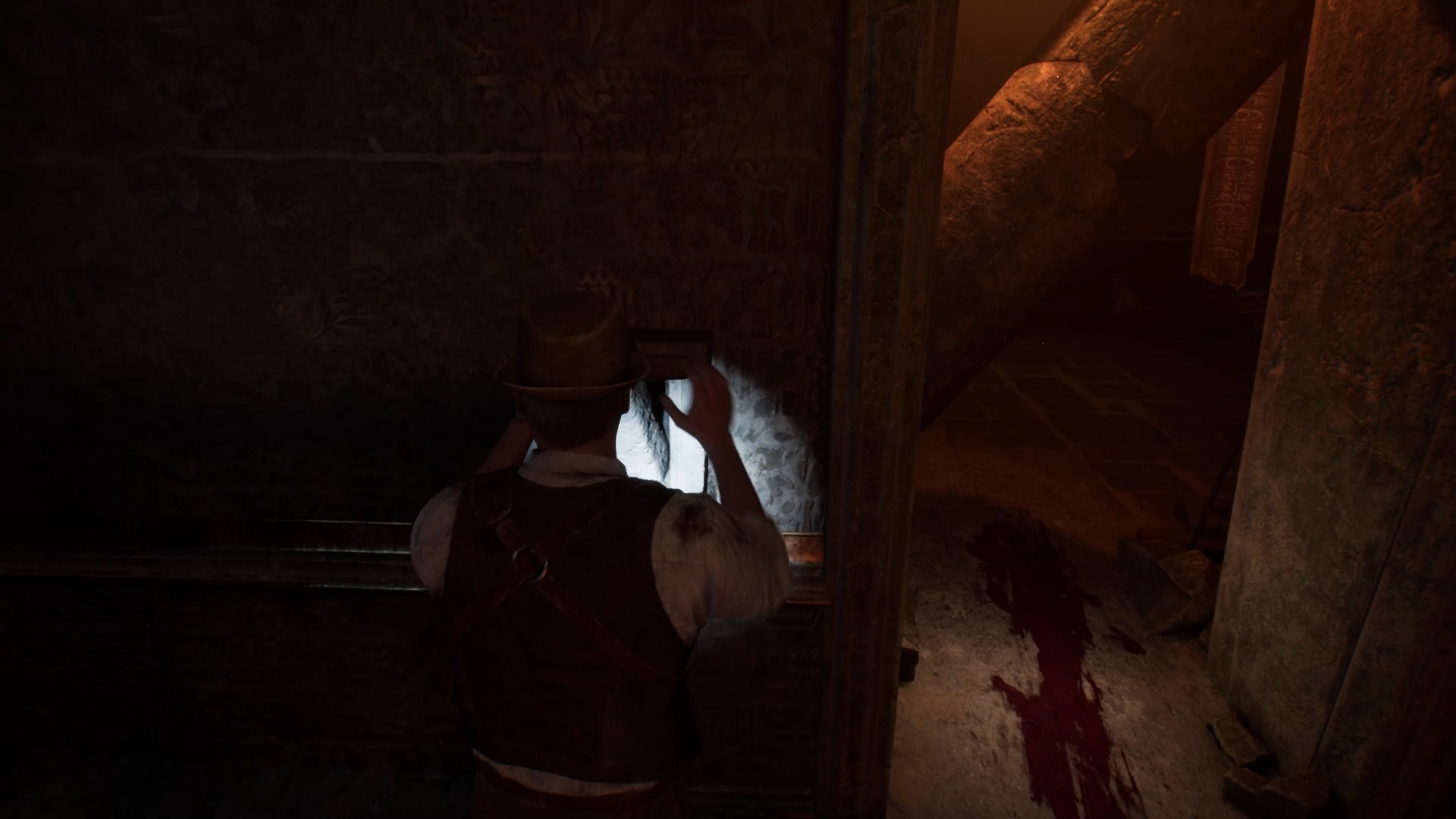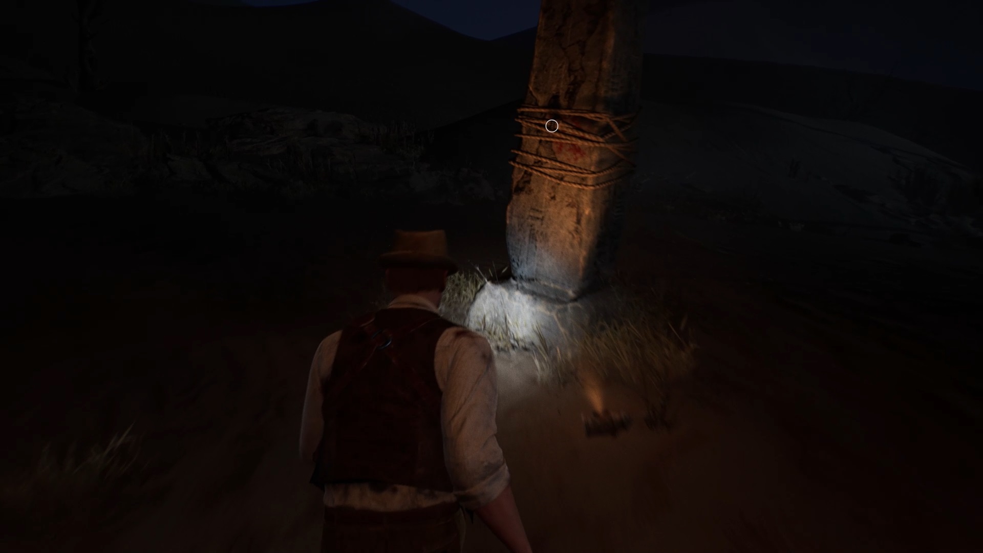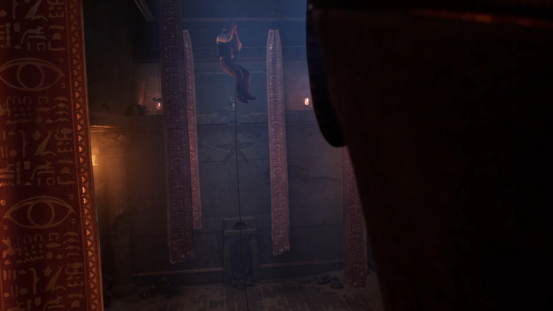 Explorez le désert pour trouver une corde près d’un coffre au campement. Utilisez la corde avec le pilier pour descendre en rappel dans un temple. Tirez sur le levier en bas de la statue pour activer un mécanisme.