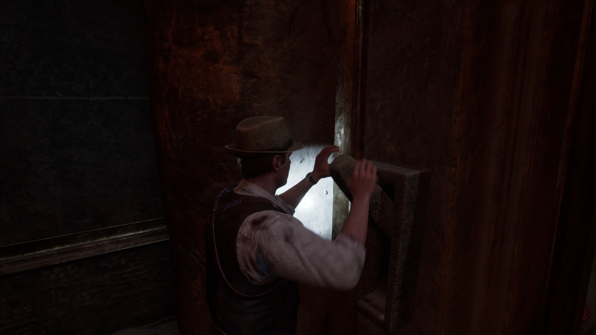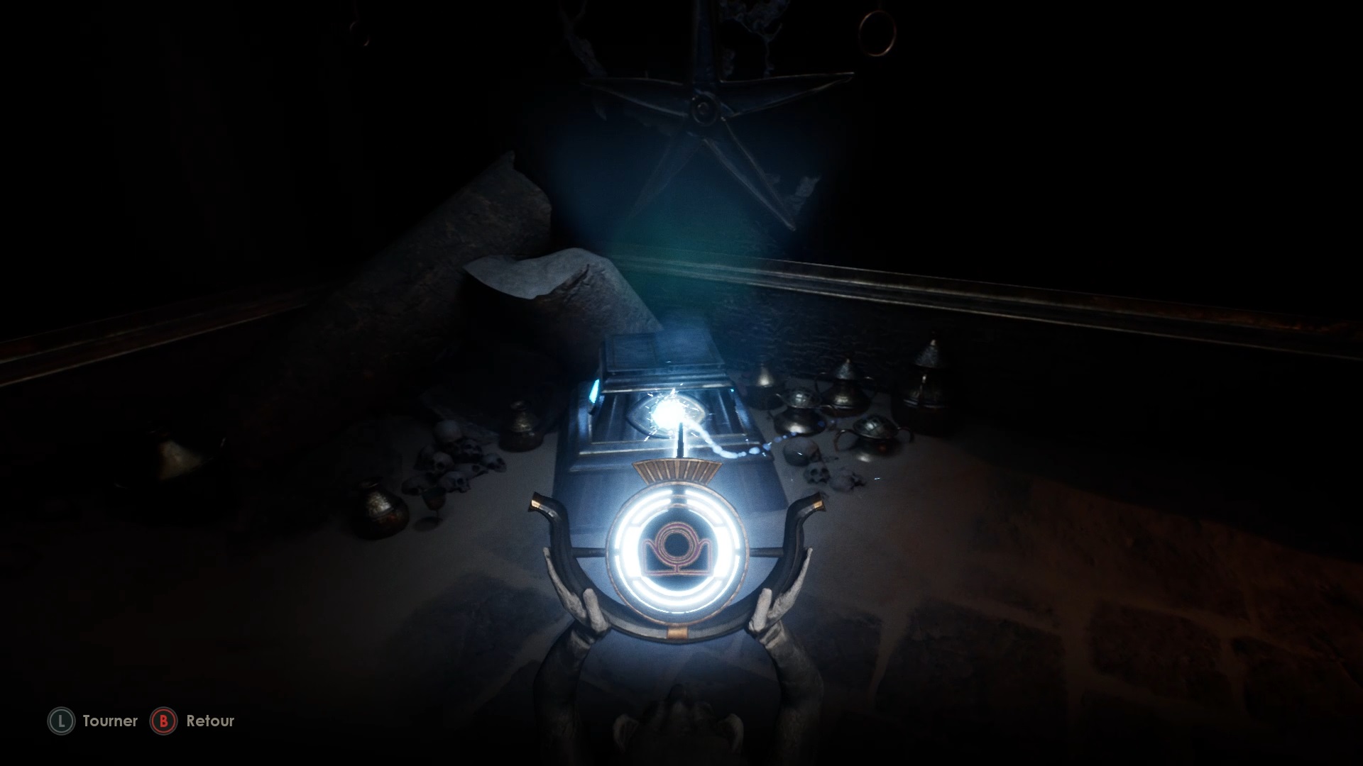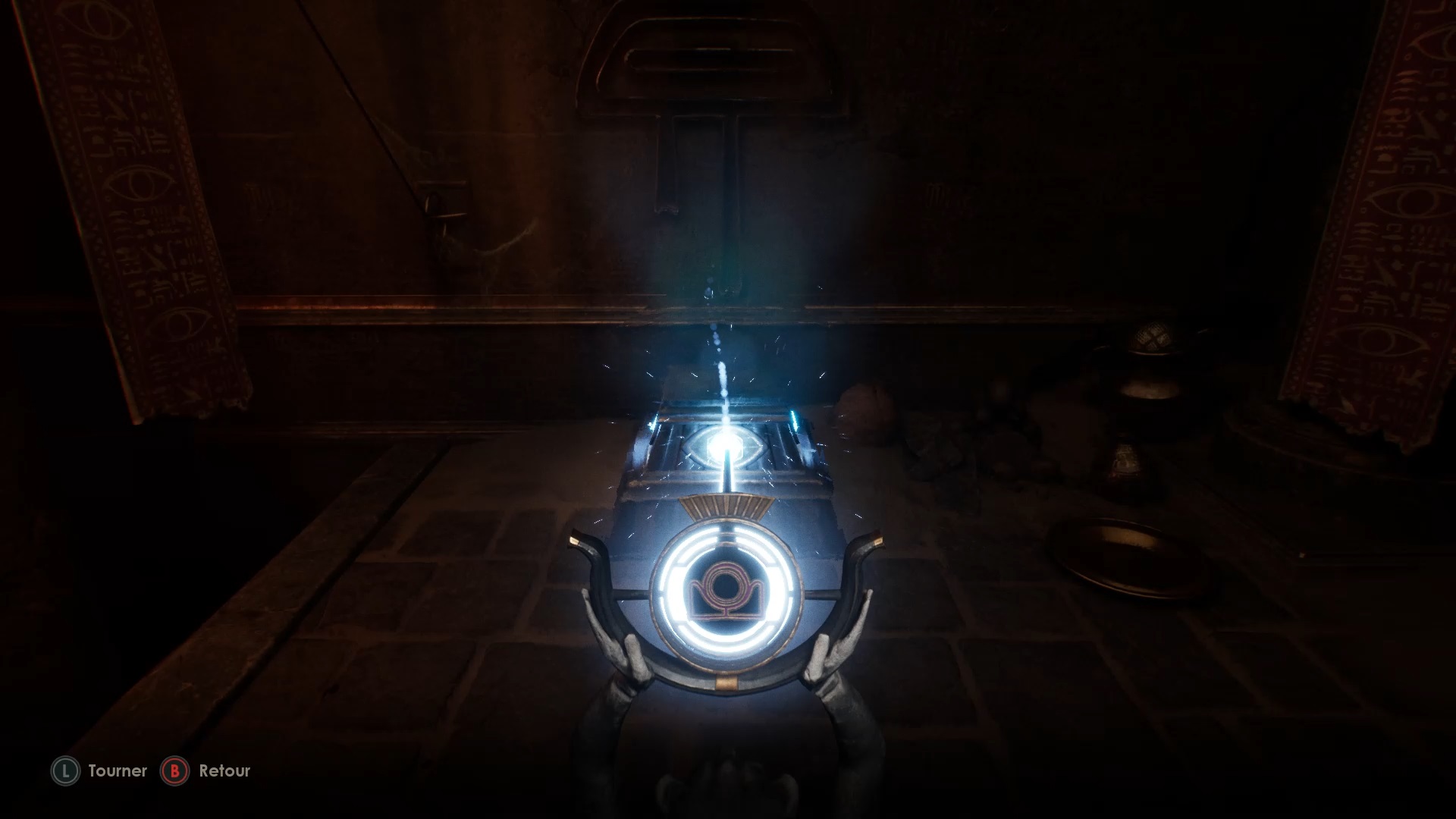 Sortez ensuite par la porte pour atteindre les hauteurs. Utilisez l’une des statues allumées du balcon pour illuminer l’œil d’une seconde porte. Rejoignez la porte ouverte. Dégagez le chemin à l’intérieur avec une arme pour rejoindre une salle avec une statue. Activez le levier contre le mur pour faire jaillir la lumière. Déplacez la statue vers le coffre en face pour l’ouvrir et obtenir son contenu.