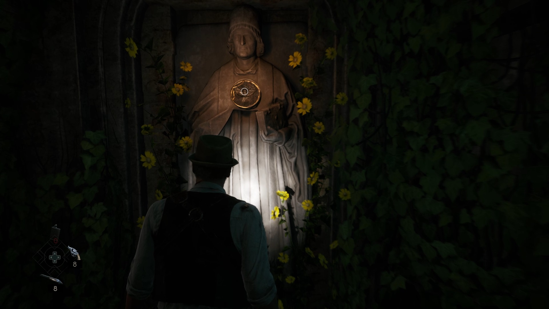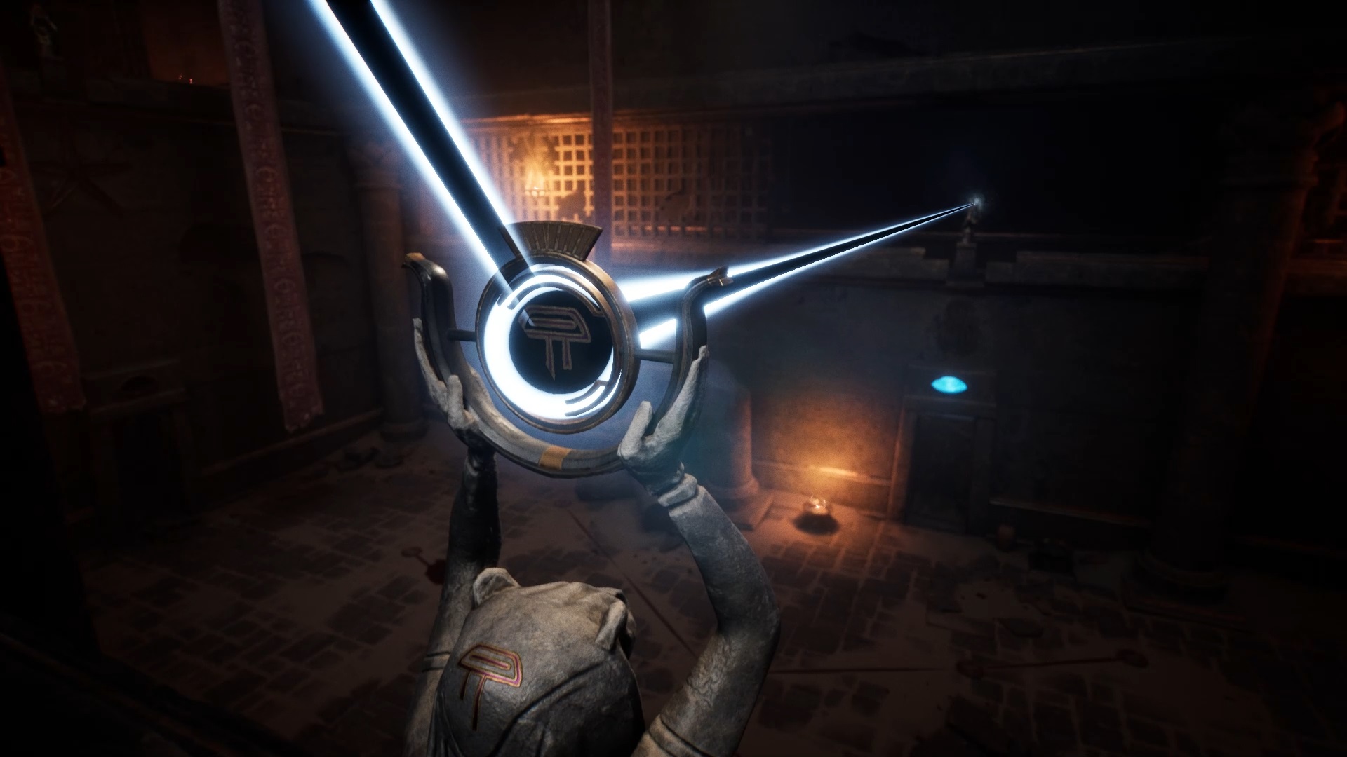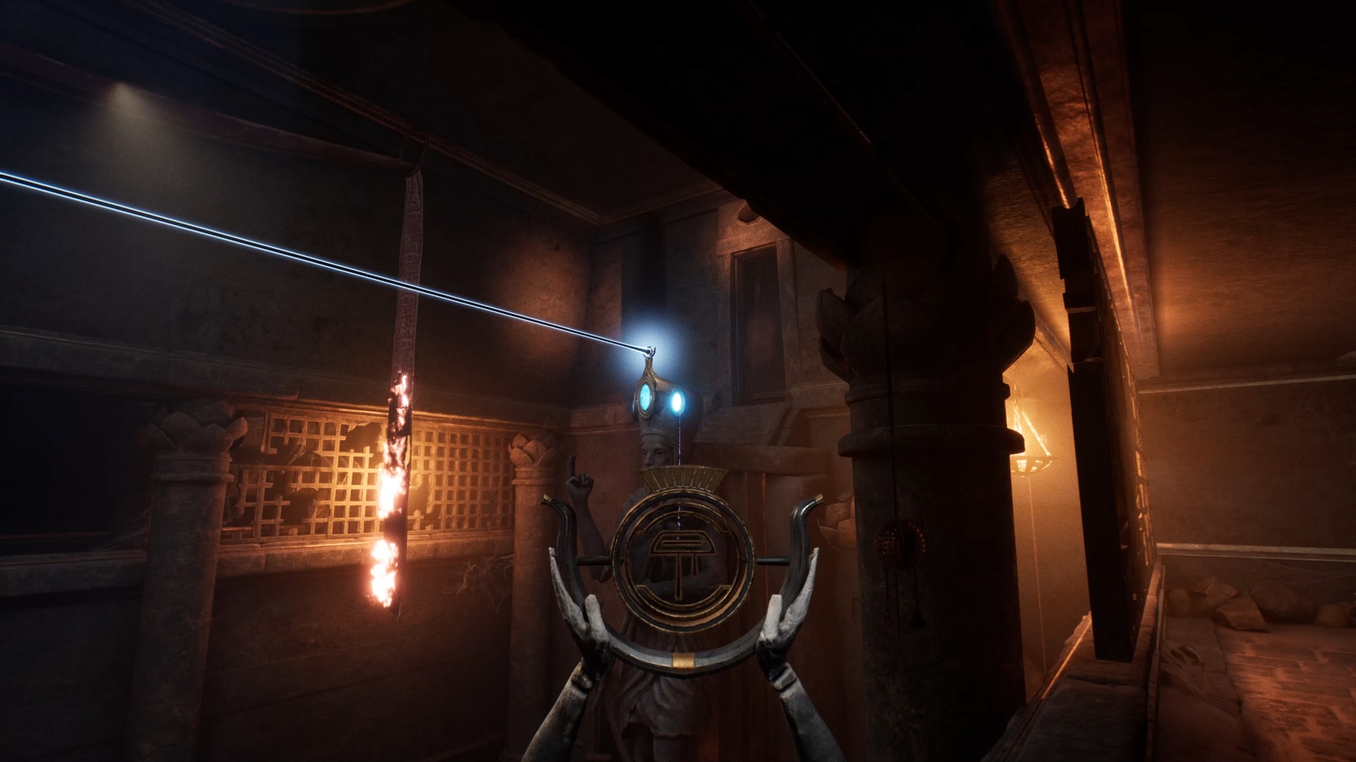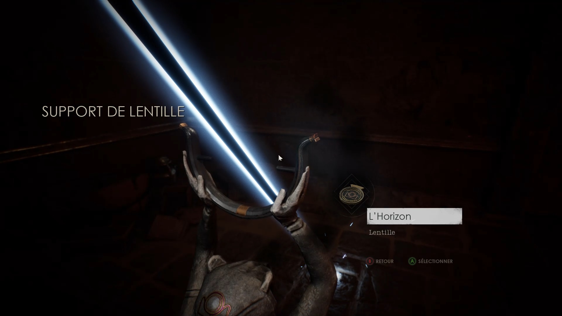 Éliminez les menaces et dégagez à l’aide d’une arme les barricades. Entrez dans la pièce dégagée pour tirer un levier et faire jaillir une lumière. Utilisez la statue pour viser l’orifice en forme d’œil en face. Ensuite, sortez dans le couloir pour passer dans la pièce suivante et déverrouiller un coffre avec une statue. Récupérez la nouvelle lentille dans le coffre.