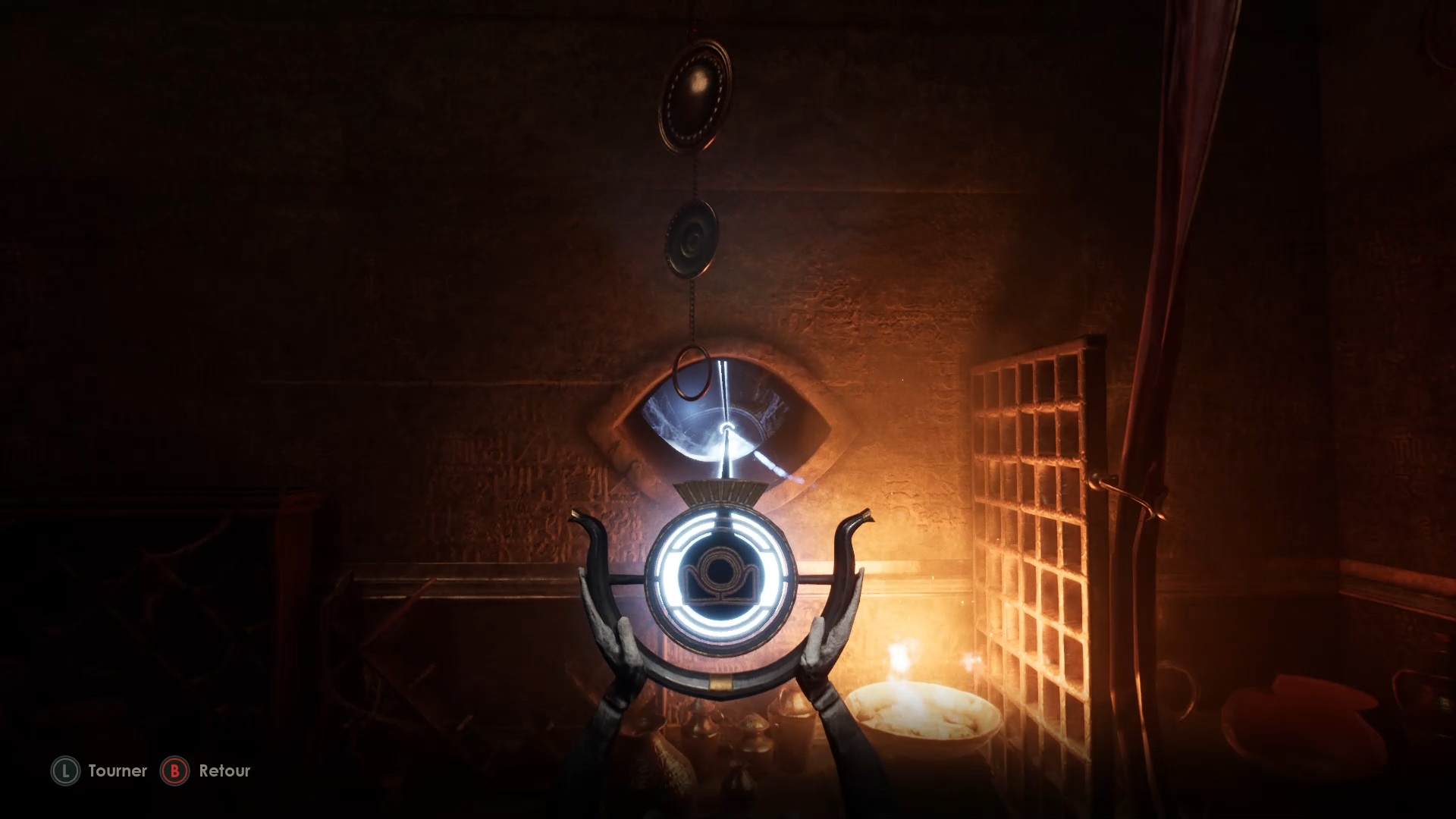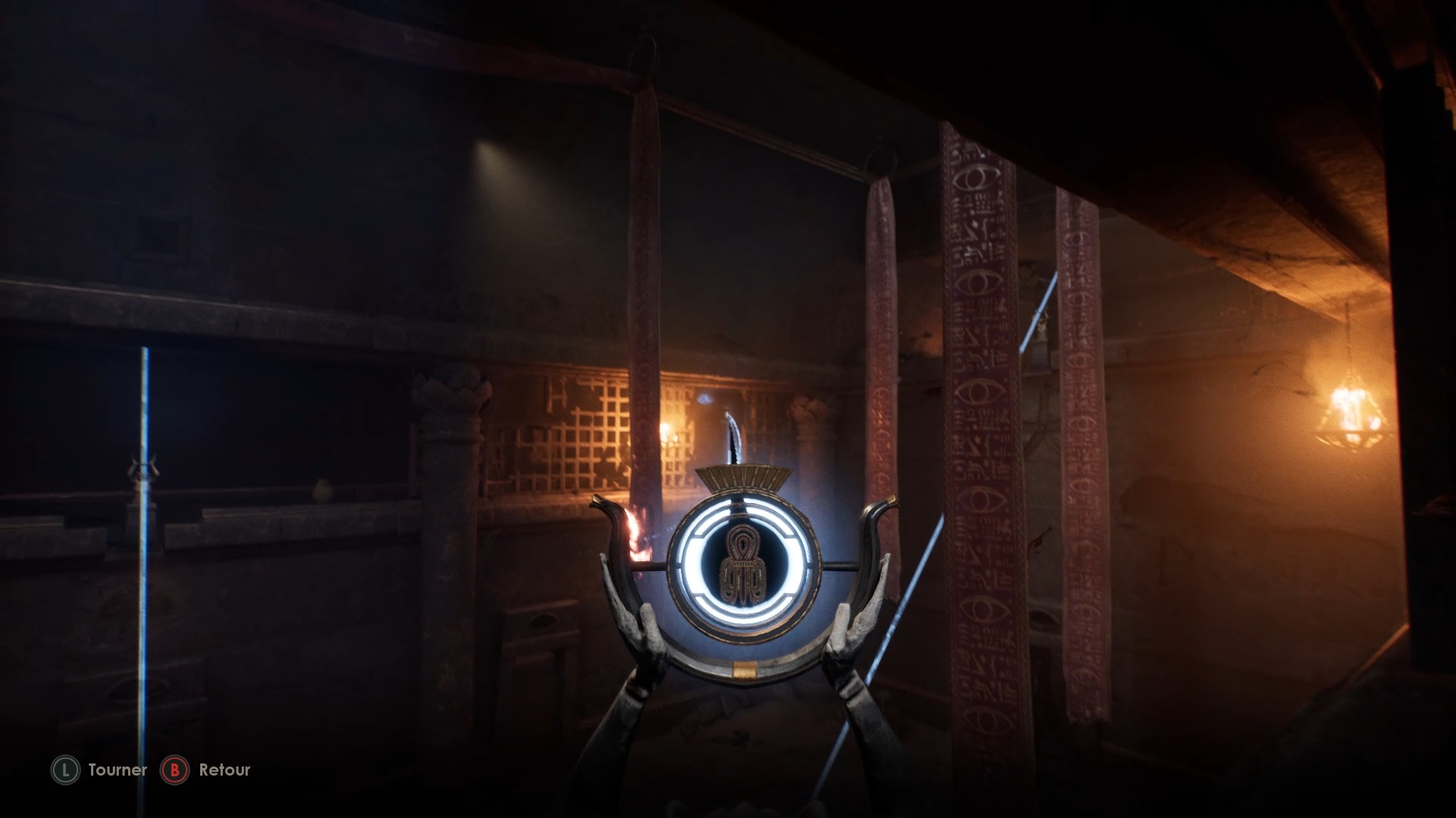 Occupez-vous des menaces et entrez dans l’ouverture à gauche de la statue. Faufilez-vous derrière un pilier pour trouver une lentille horizon dans un coffre. Actionnez un levier contre le mur de la pièce et utilisez la lentille avec la statue. Dirigez ensuite la lentille vers l’œil de la porte.