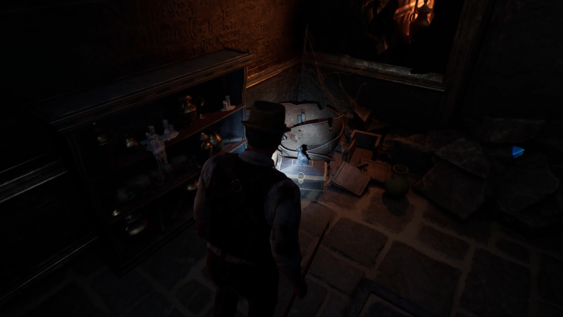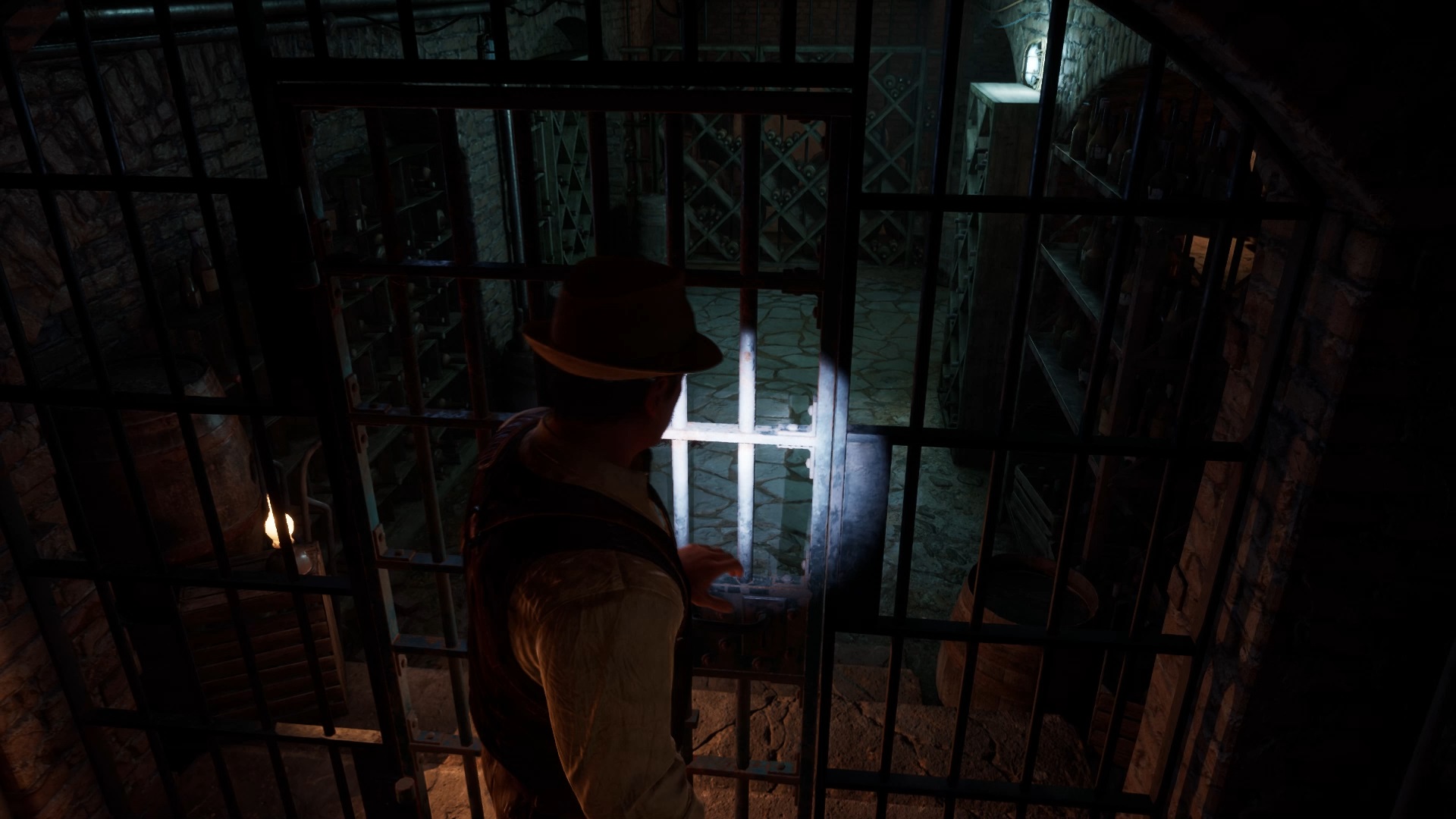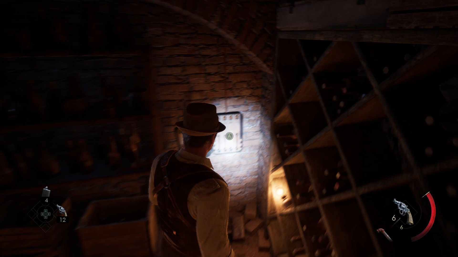 Dirigez-vous ensuite vers l’escalier du personnel pour descendre vers le sous-sol. Passez la grille et utilisez la clé de la cave pour déverrouiller le portail. Examinez le meuble contre le mur pour trouver un interrupteur. Placez l’interrupteur dans la boîte à fusibles au fond de la cave.