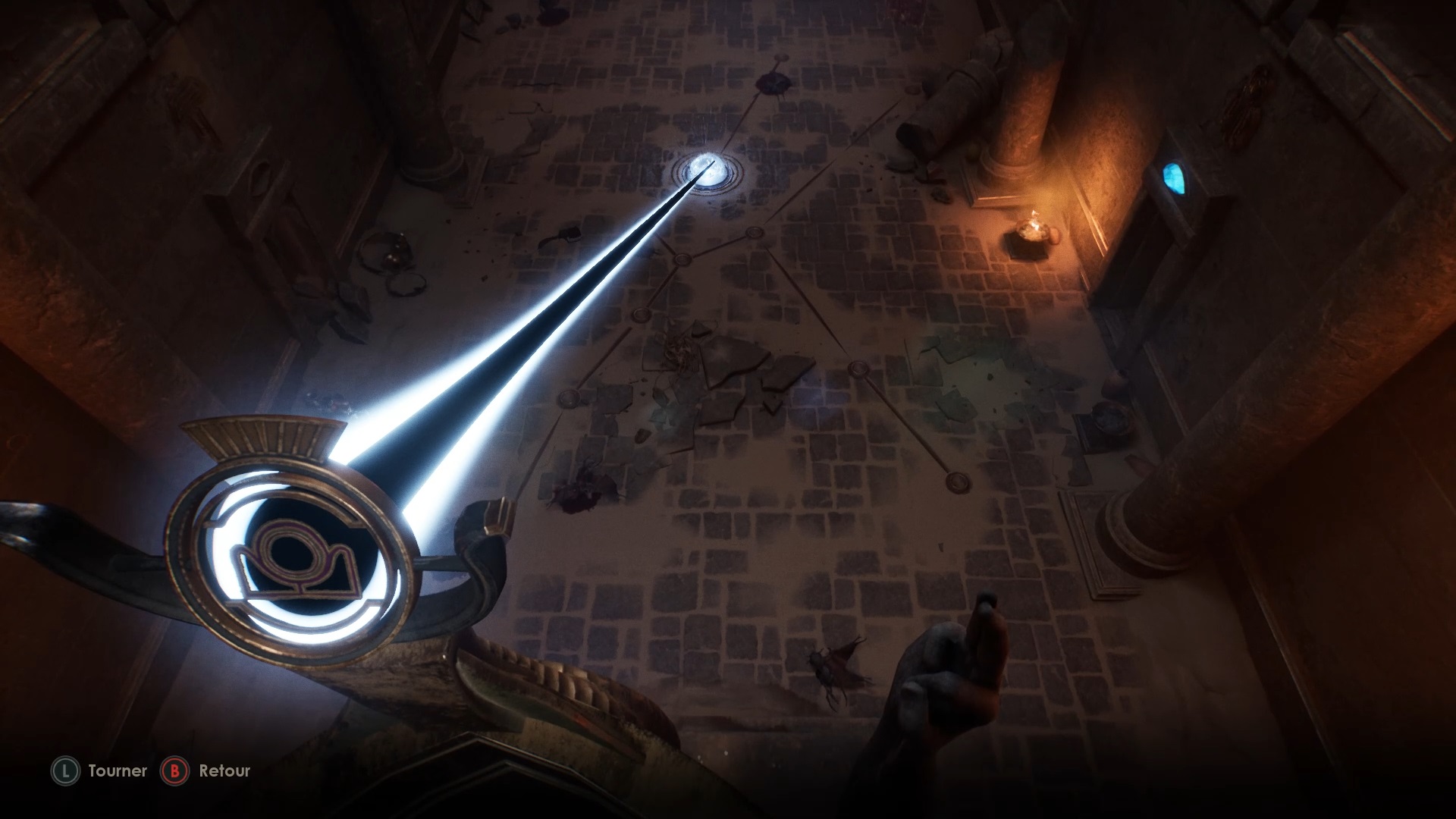 Revenez ensuite à la statue précédente du balcon pour viser un joyau de la statue. Utilisez ensuite la nouvelle lentille avec la statue en face de la statue. Ouvrez un nouveau passage en bas à droite de la salle et descendez pour aller à l’intérieur.