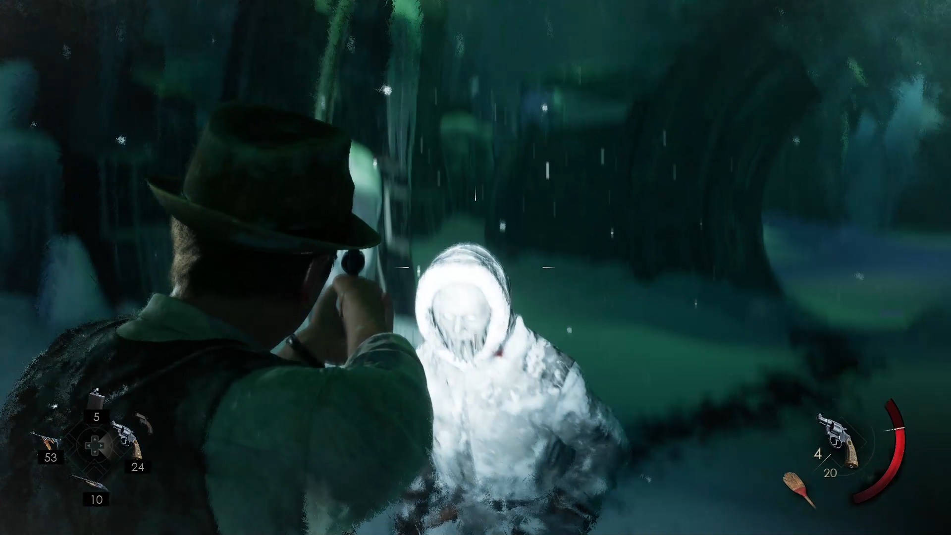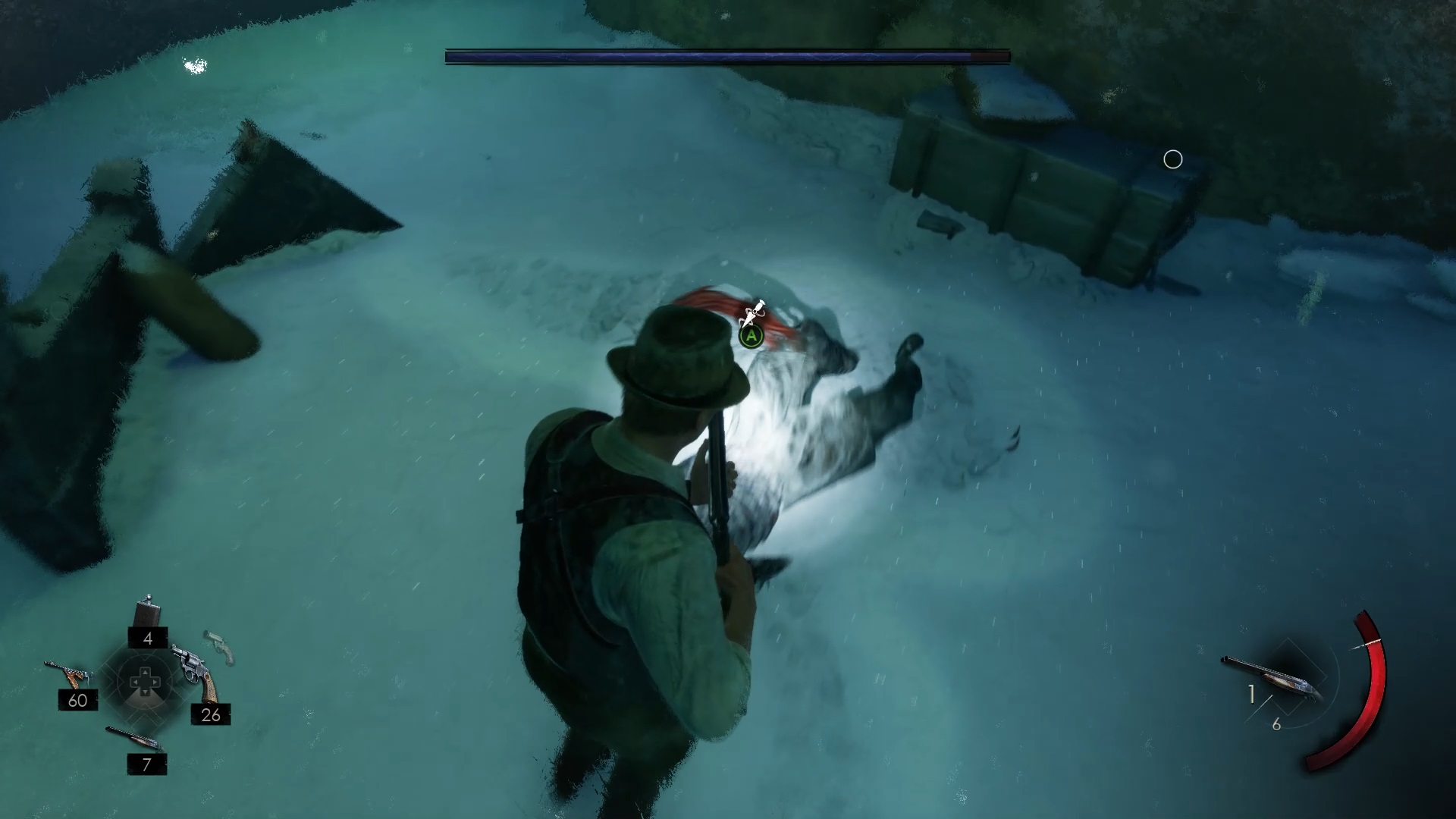 Dans le souvenir, récupérez le lance-fusée. Aventurez-vous dans le blizzard en suivant les drapeaux. Vous pouvez utiliser le lance-fusée si besoin pour avancer. Une fois arrivé à un étrange dispositif, éliminez Jacob. Alignez le dispositif comme indiqué sur l’image ci-dessus pour déclencher un second combat. Éliminez Jacob en utilisant les munitions alentour et votre poignard une fois qu’il est au sol.