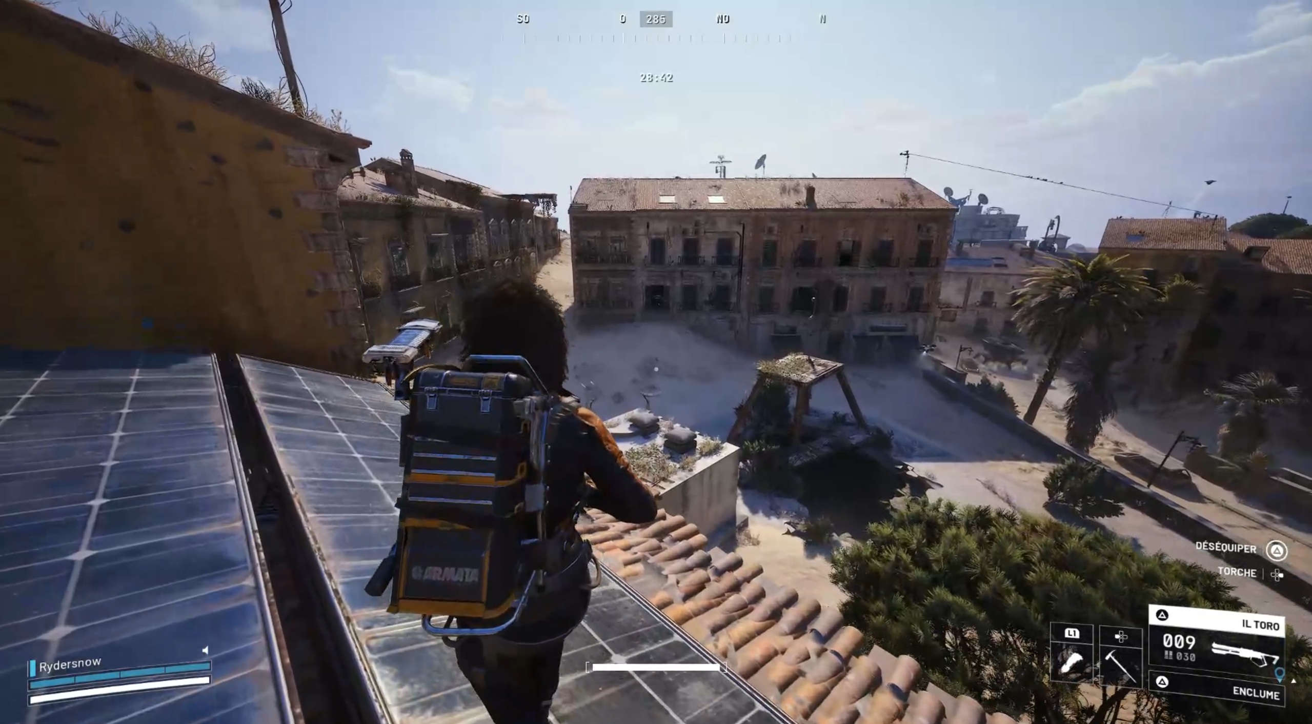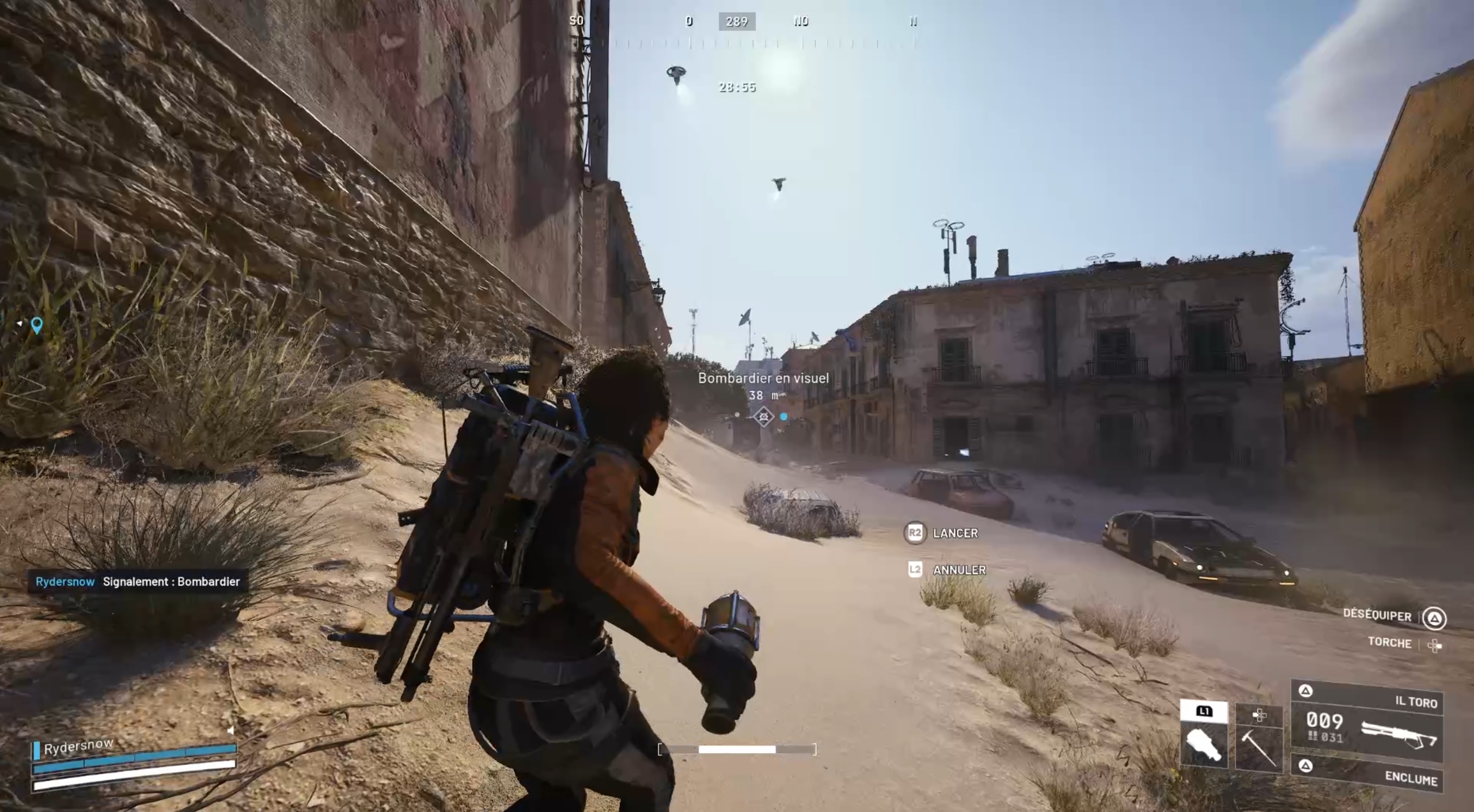 Nous voilà enfin prêts. Prenez la direction de la Ville enfouie, plus précisément vers le parc Morano ou Plaza Roma. Recherchez le dans le parc ou vers le parking. Vous ne mettrez pas longtemps à identifier votre cible : le bombardier se déplace toujours entouré d’observateurs, visibles dans le ciel, et il est difficile de le manquer en raison du bruit qu’il produit en marchant. Une fois en visuel, équipez-vous des brûleuses et lancez-les en rafale. Le bombardier devrait rapidement succomber. Si ce n’est pas le cas, achevez-le à l’aide de votre arme lourde et de grenades pour terminer le combat. Fouillez ensuite le bombardier afin de récupérer la cellule qu’il transporte, puis repartez en toute sécurité vers Speranza pour valider la quête.