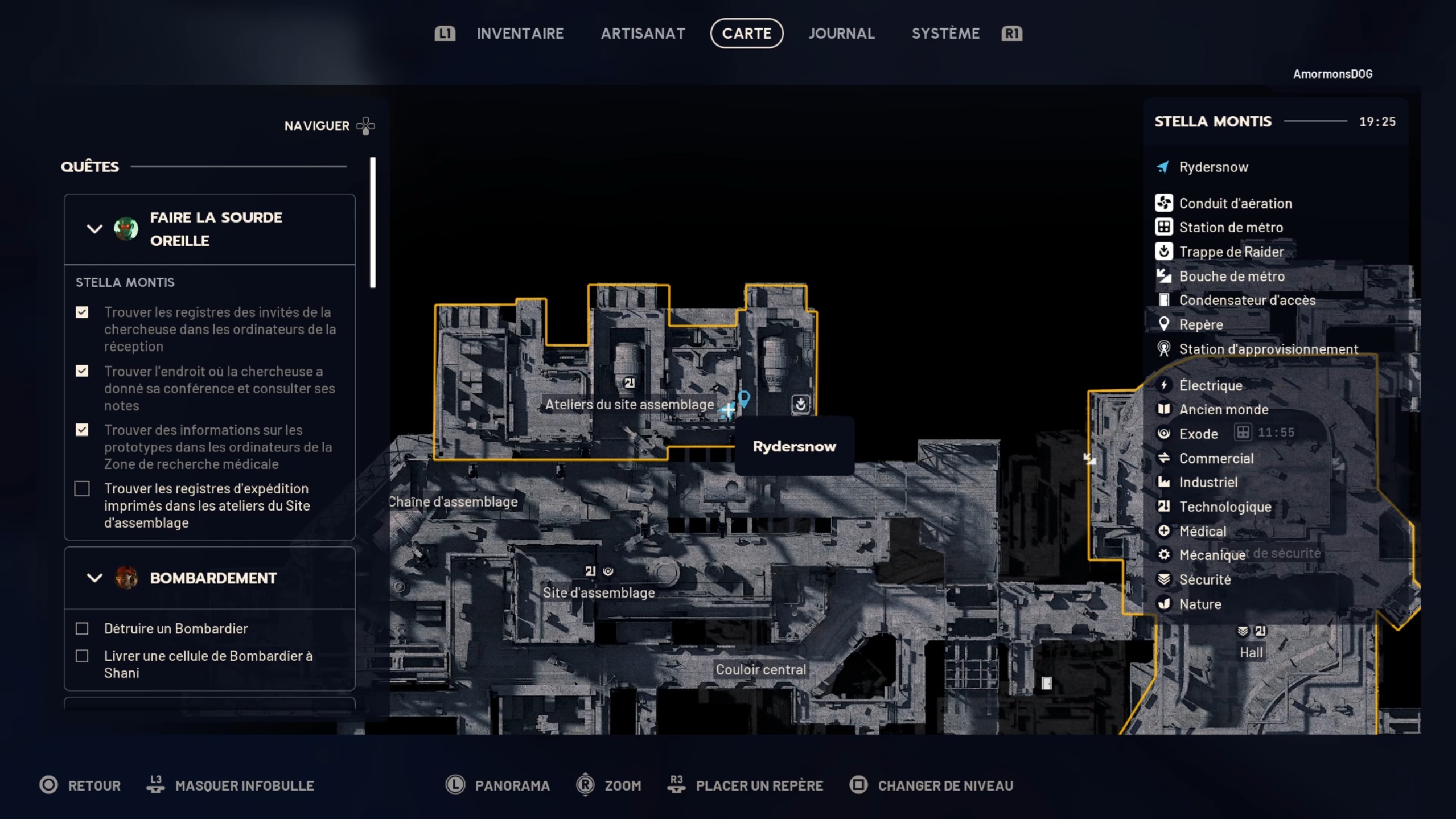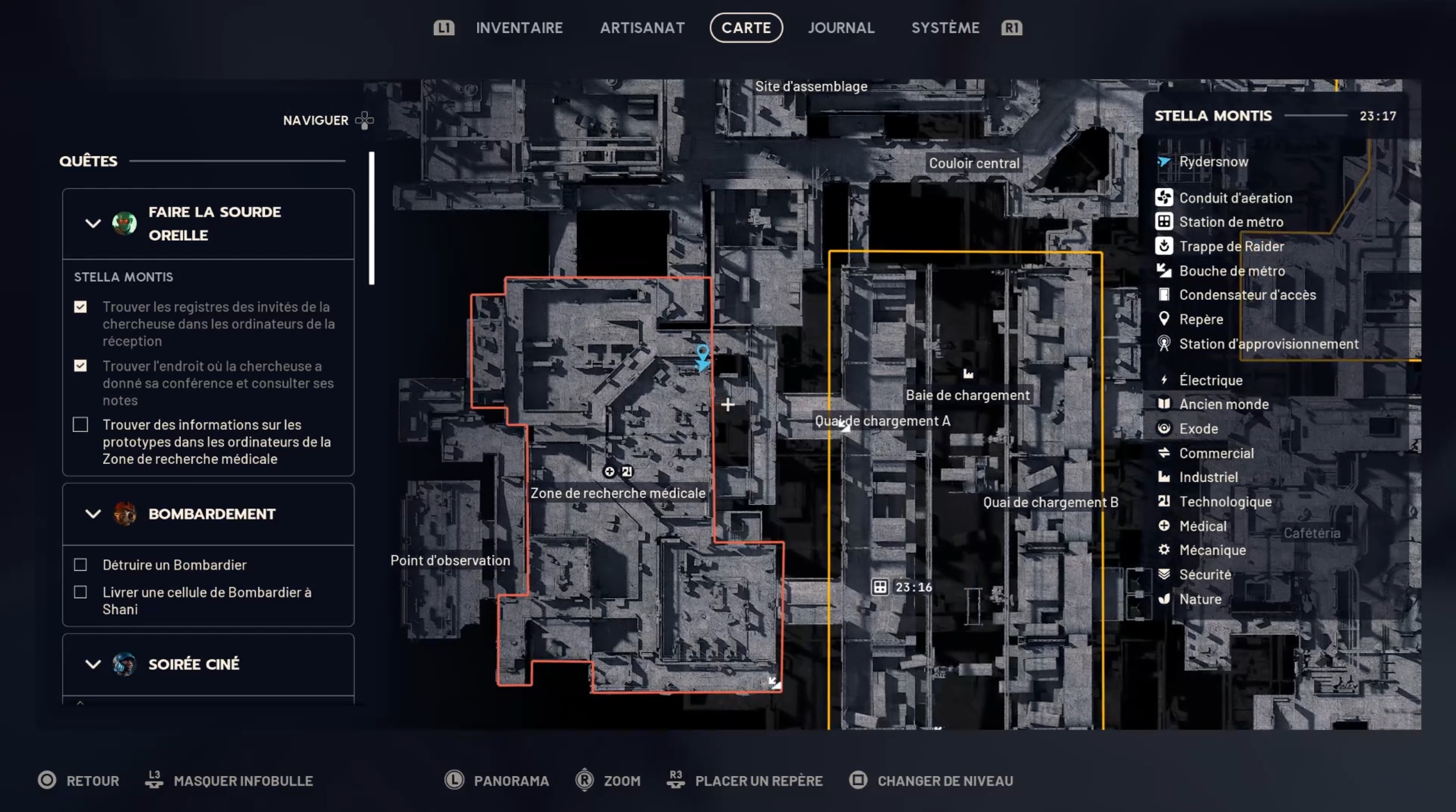 Pour terminer la mission, rendez-vous dans la zone du site d’assemblage. Près de la trappe des Raiders, vous repérerez un escalier plongé dans la pénombre. Empruntez-le pour rejoindre une passerelle. Examinez ensuite l’étagère afin de fouiller les documents et récupérer les registres. Attention : actuellement sur Stella Montis, si la carte est plongée dans le noir, l’interaction peut ne pas fonctionner. Il est alors nécessaire de redémarrer une nouvelle partie pour pouvoir interagir correctement.