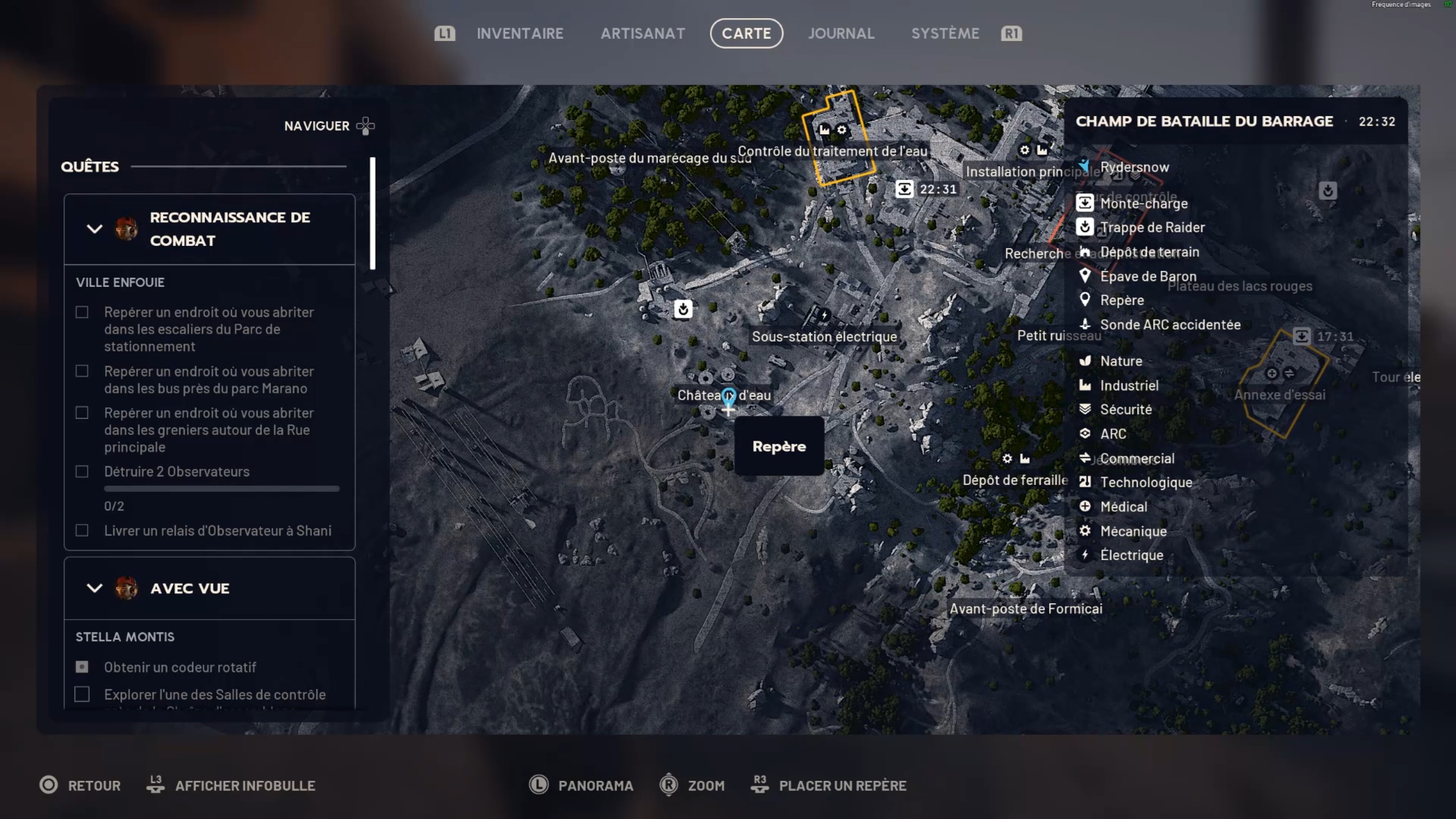 Pour commencer la quête « La Ligue », rendez-vous sur la carte du Champ de bataille du barrage. Dirigez-vous ensuite vers le sud-ouest de la zone afin de rejoindre les châteaux d’eau. Une fois sur place, examinez ceux situés en périphérie pour repérer l’endroit précis où photographier les buts.