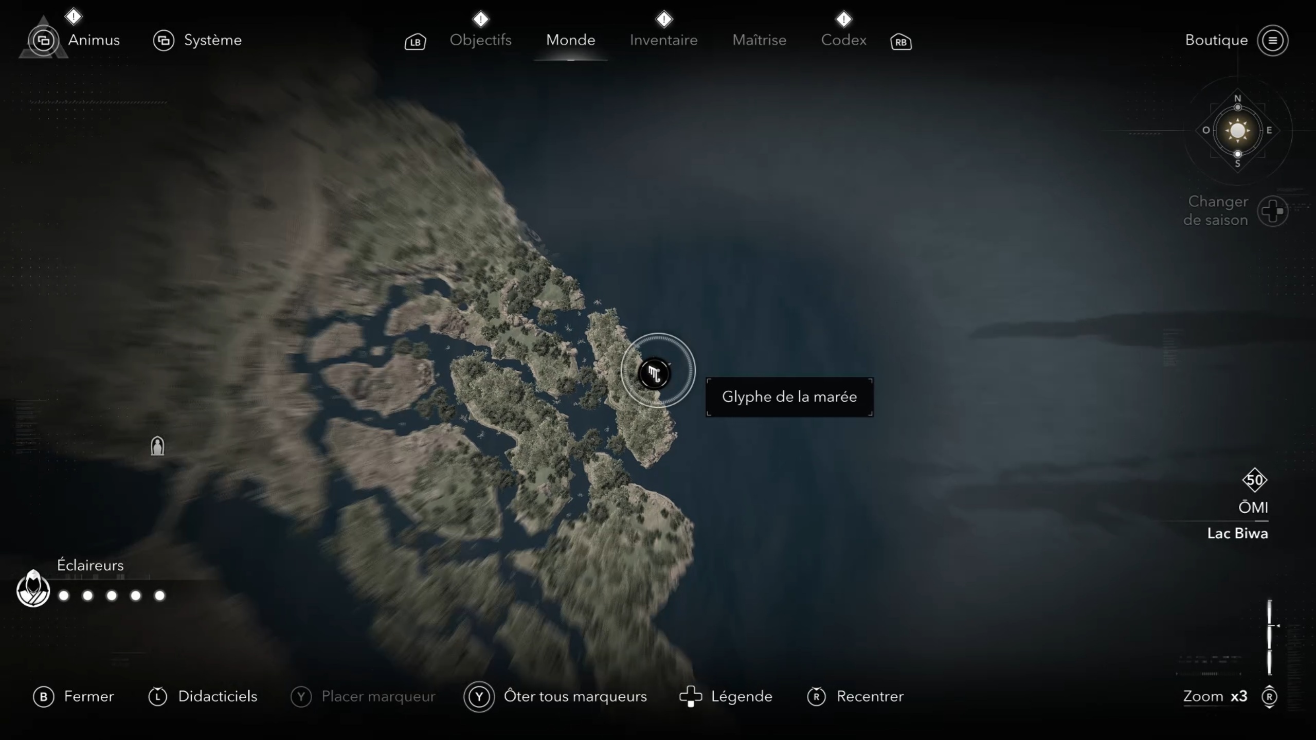 Pour trouver le glyphe de la marée à Omi, rendez-vous au nord-ouest du lac. Vous y trouverez le glyphe au bord de la marée.