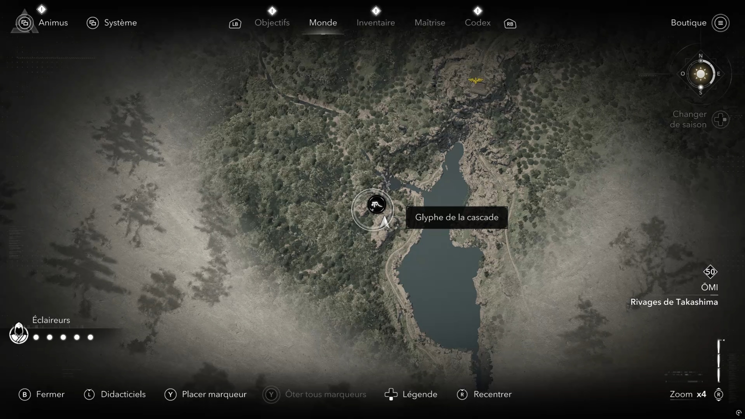 Pour trouver le glyphe de la cascade à Omi, rendez-vous au nord-ouest d’Omi, à l’ouest du rivage de Takashima. Utilisez la butte située à l’ouest pour grimper et atteindre le glyphe, placé en hauteur.