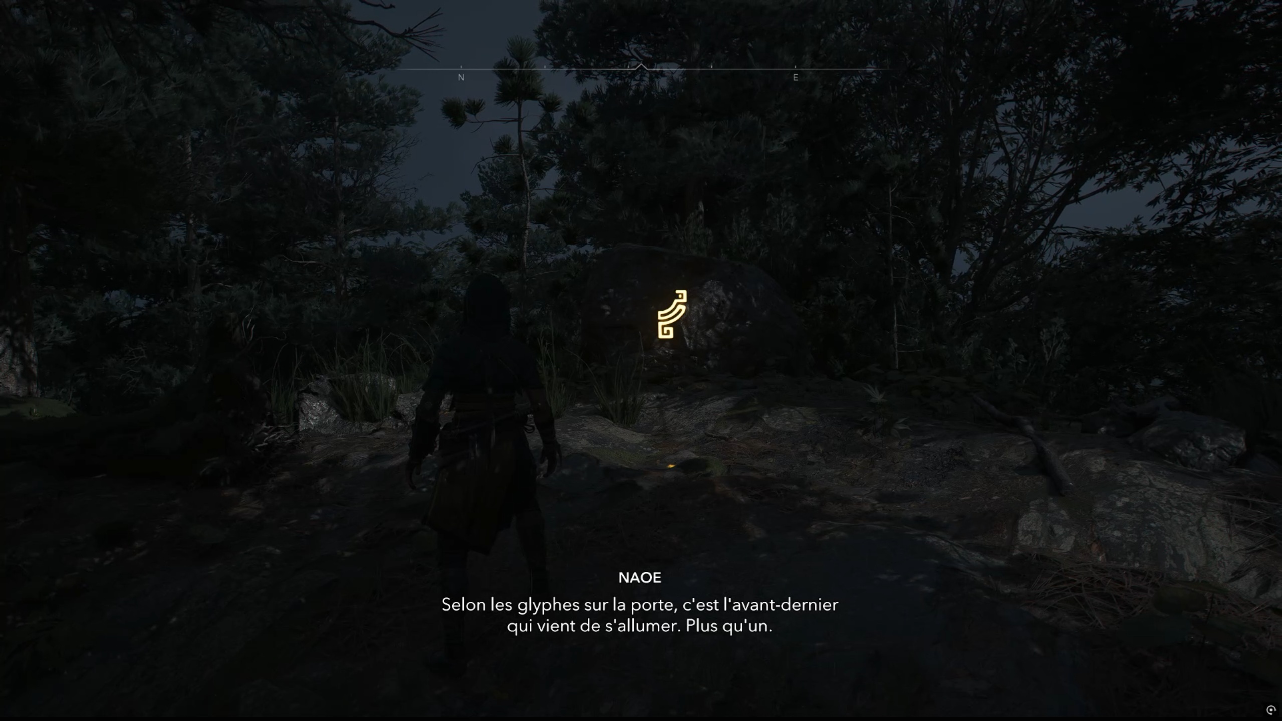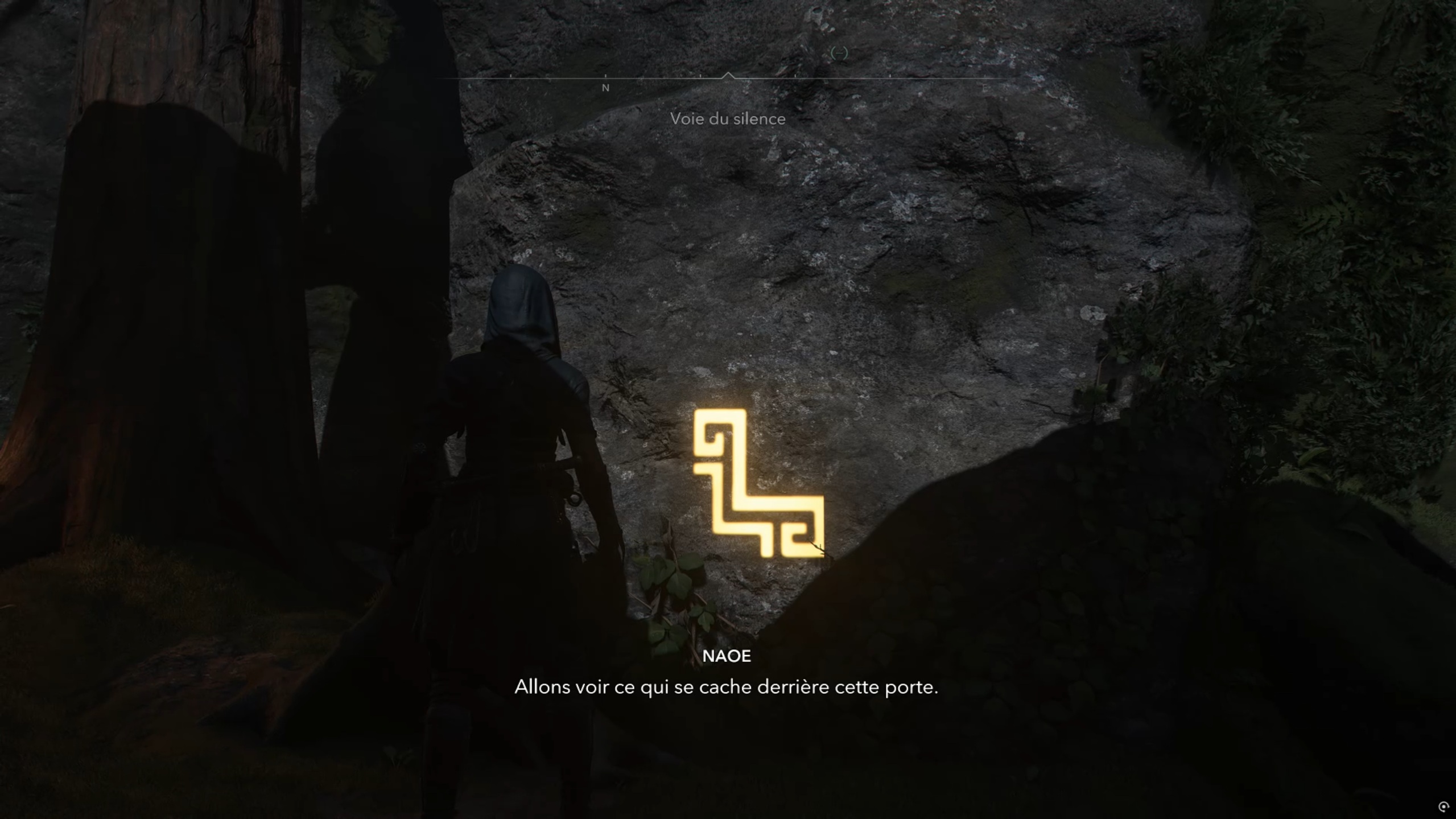 Pour résoudre la première énigme des glyphes, commencez par vous équiper, dans l’inventaire et dans l’onglet des babioles, de la « balise de parchemin d’énigme ». Une fois équipée, la babiole émet un son lorsque vous êtes à proximité d’un glyphe. Lorsque vous êtes très proche, suivez la poussière lumineuse pour le localiser. Le glyphe du caveau de Wakasa se trouve à l’est de la porte ornée de glyphes.
