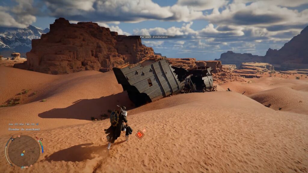 L’armure de plates de la lumière du champ de bataille se situe au nord de « Crimson Desert », au niveau du « Camp des Sables hurlants ». La zone est difficile à explorer à cause de la tempête de sable. Suivez l’emplacement indiqué pour repérer l’entrée d’une grotte dans le camp, où se trouve le coffre contenant l’armure.