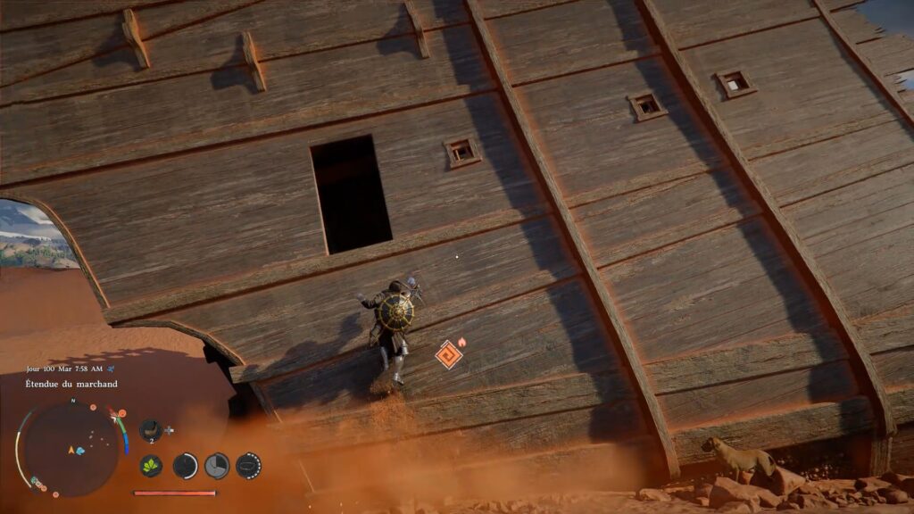 Les bottes de plates de la lumière du champ de bataille se situent dans l’épave du désert, au nord de « Crimson Desert ». Éliminez les ennemis présents, puis grimpez sur l’épave pour entrer par une fenêtre du navire et trouver le coffre contenant les bottes.