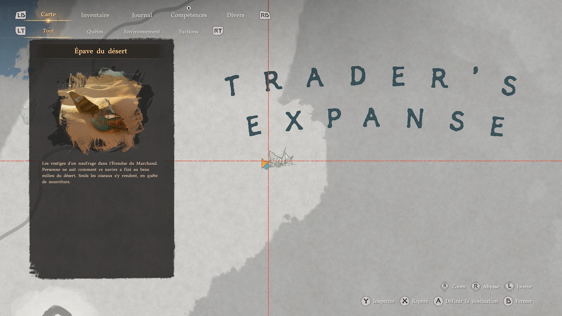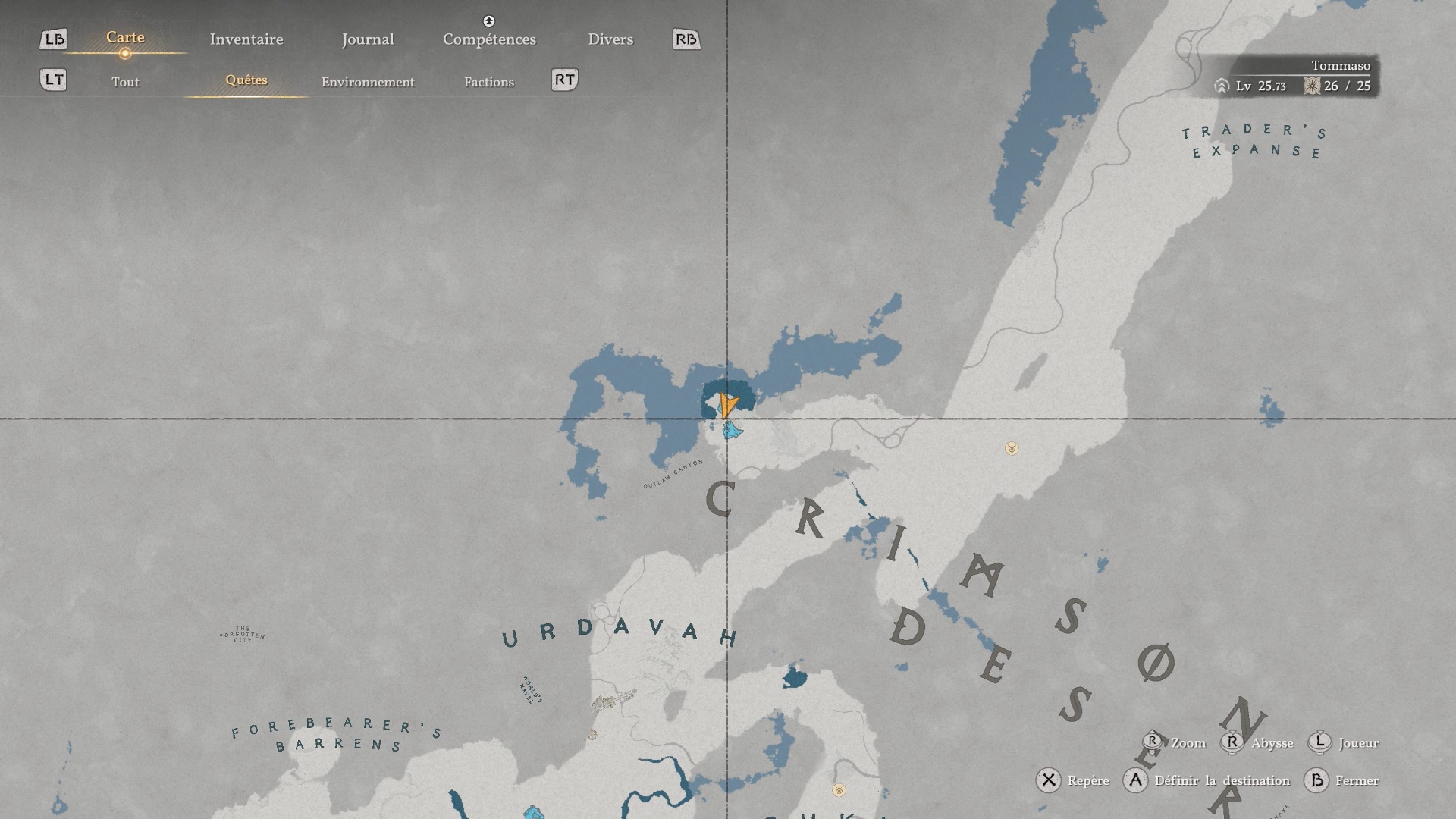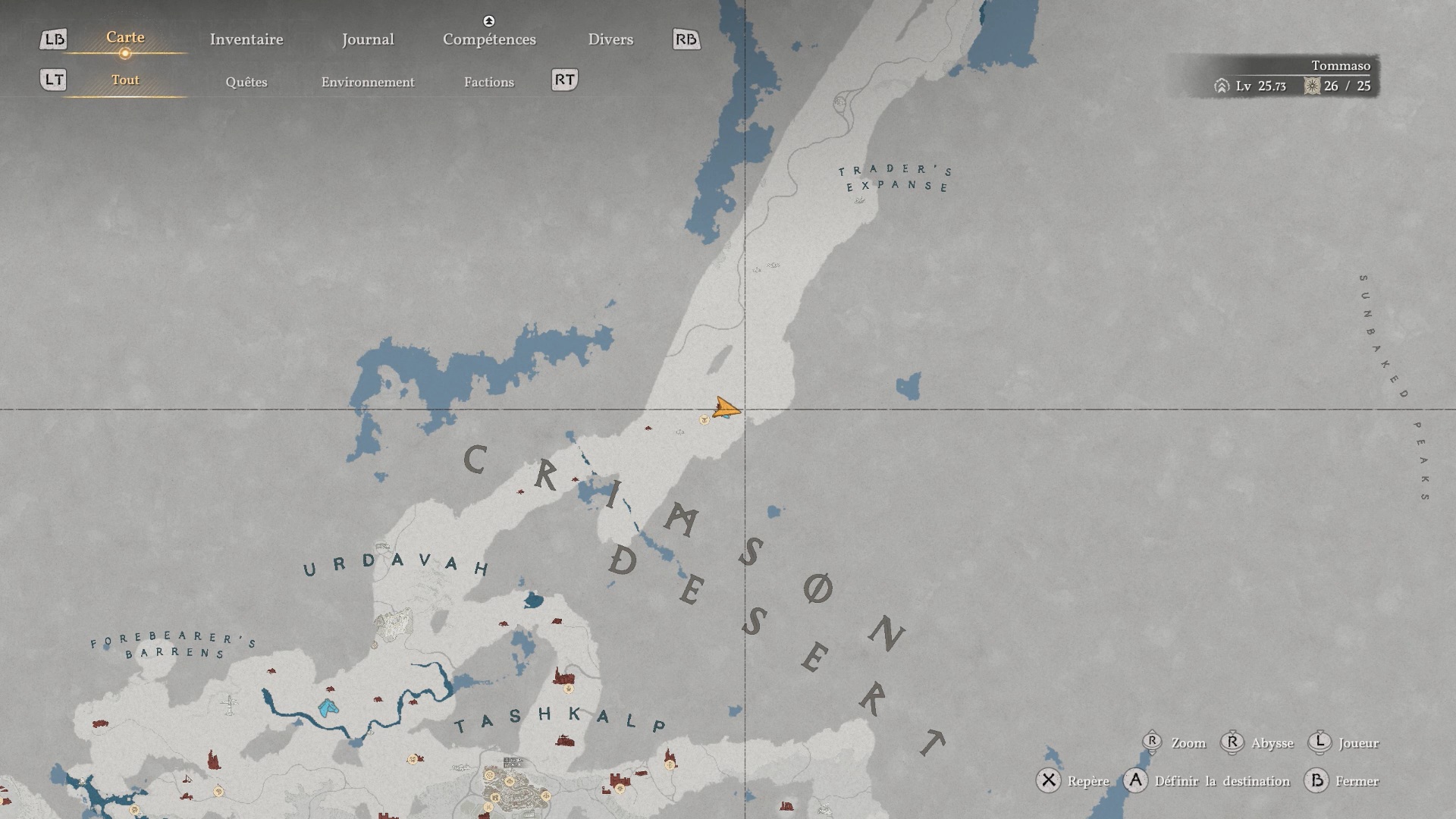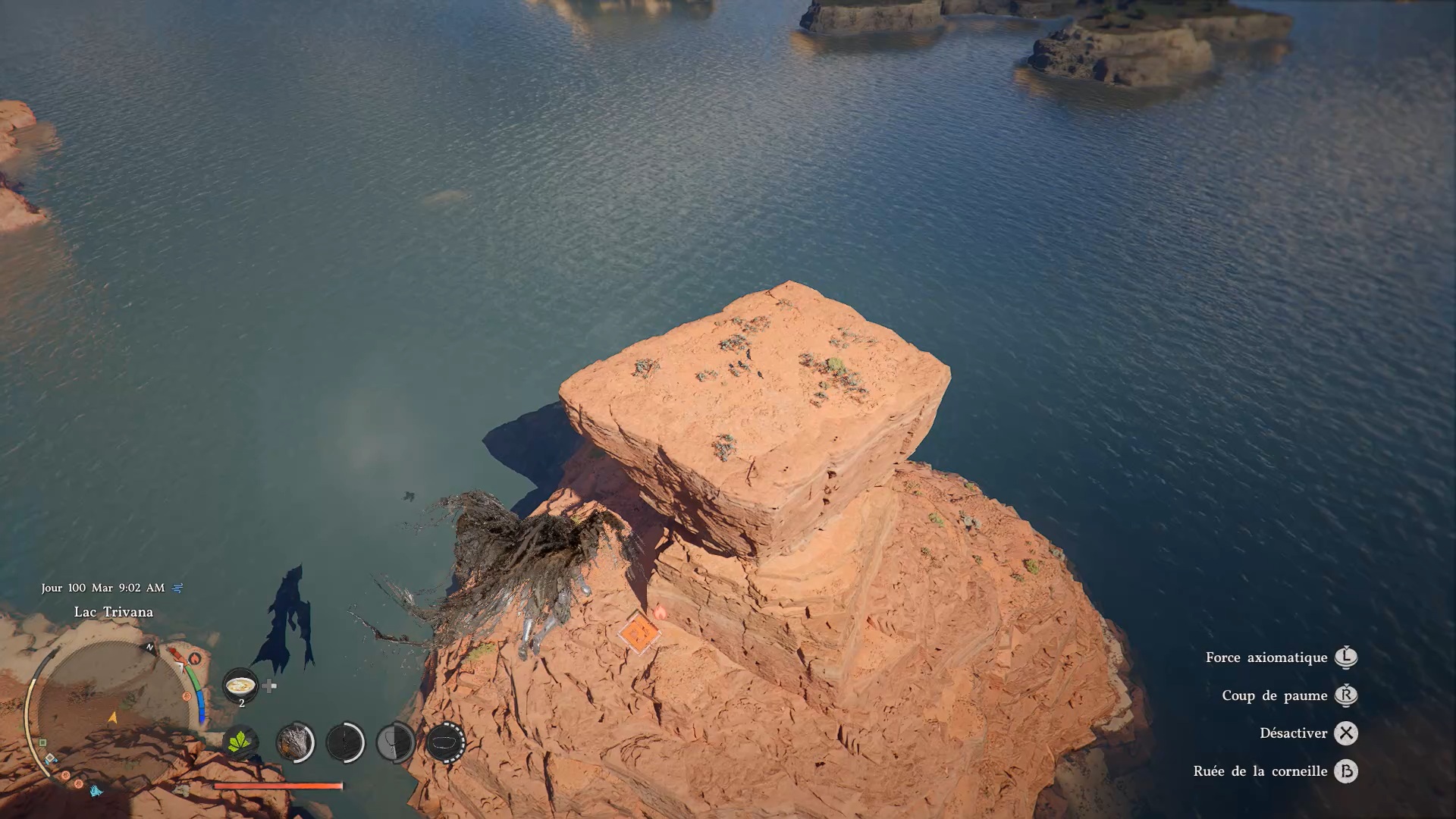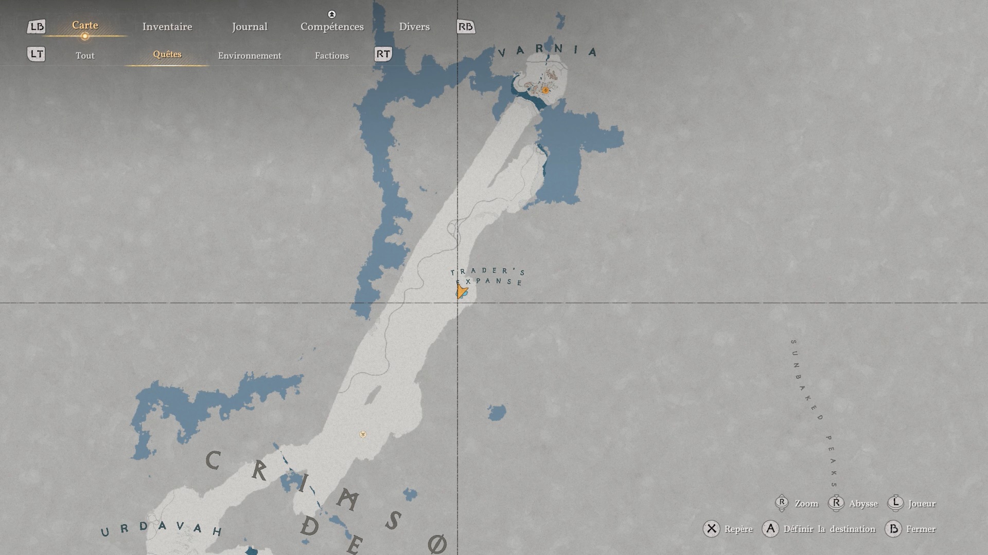 Le heaume de plates de la lumière du champ de bataille se situe au nord-ouest de « Crimson Desert ». L’emplacement exact est au-dessus de la lettre « C » de la région sur la carte. Au point indiqué, vous trouverez une formation rocheuse isolée au milieu du lac Trivana. En son centre se trouve le coffre contenant le heaume.