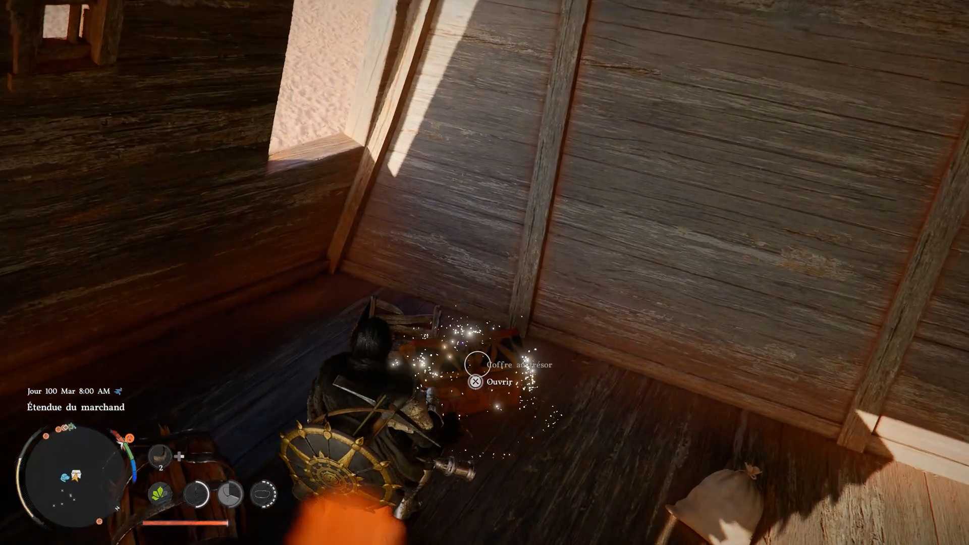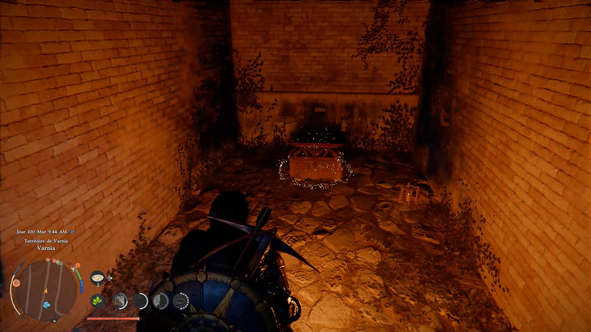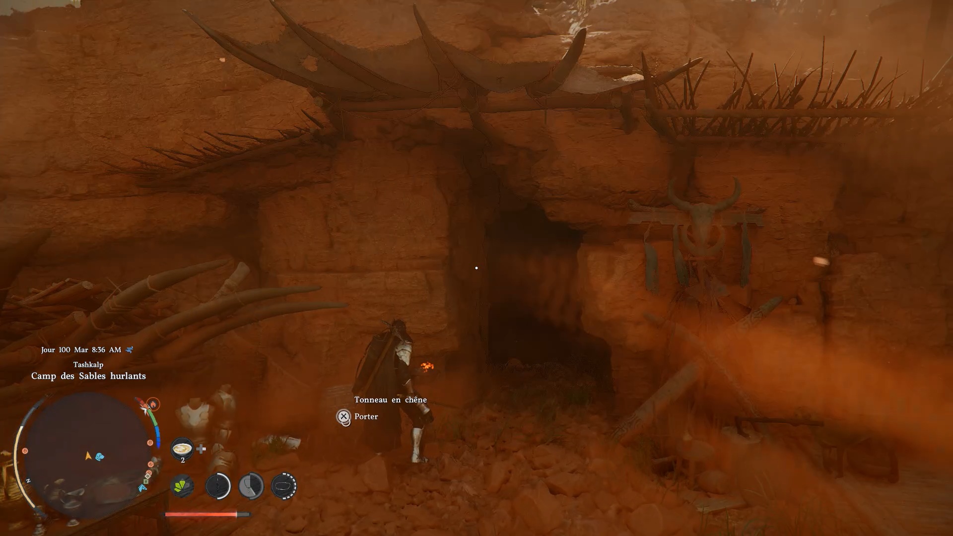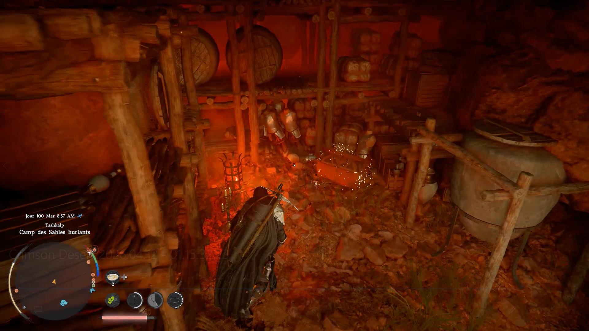 L’armure de plates de la lumière du champ de bataille se situe au nord de « Crimson Desert », au niveau du « Camp des Sables hurlants ». La zone est difficile à explorer à cause de la tempête de sable. Suivez l’emplacement indiqué pour repérer l’entrée d’une grotte dans le camp, où se trouve le coffre contenant l’armure.