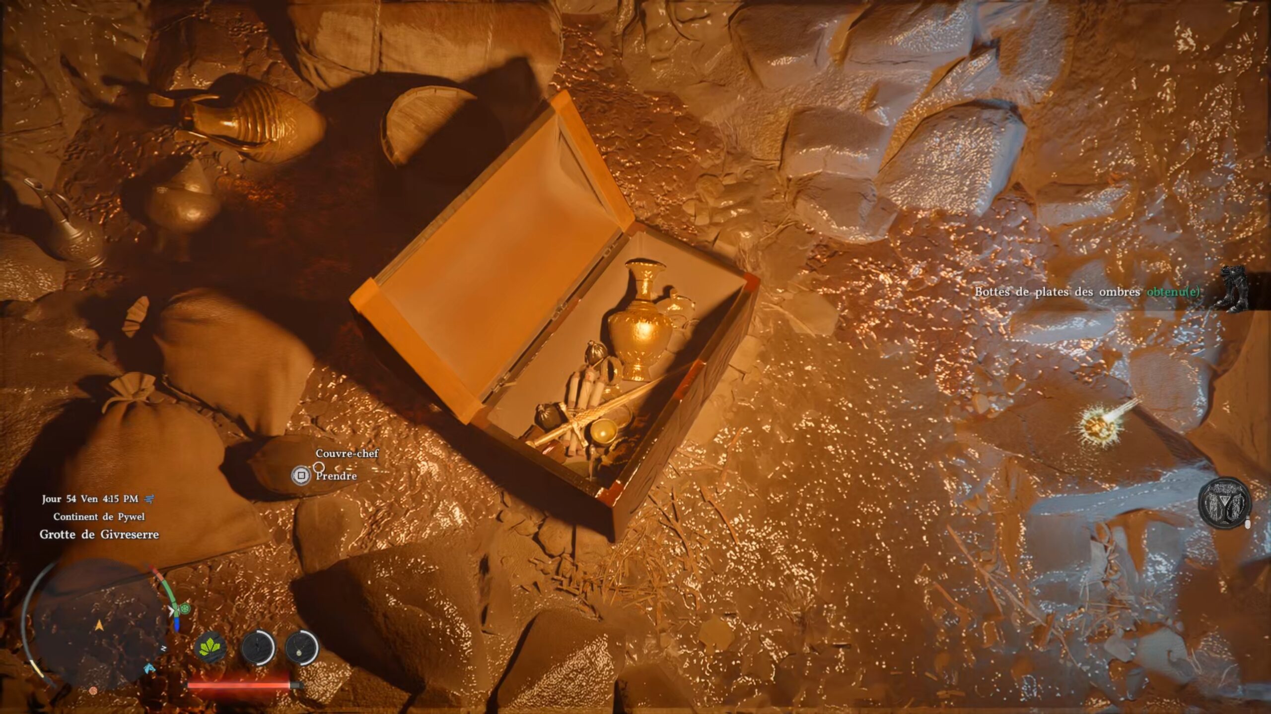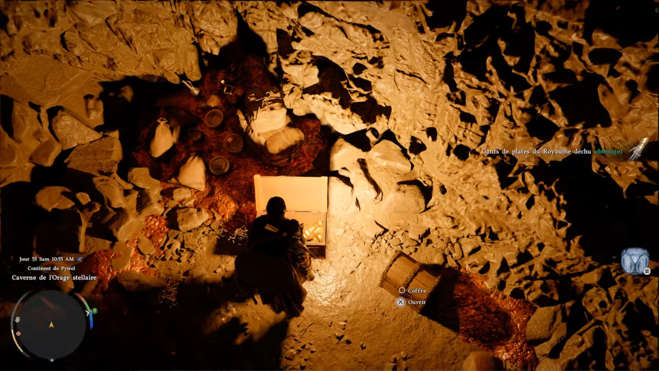 Les gants de plates du Royaume déchu se situent derrière une cascade au sud de la région « Hernand ». L’emplacement se trouve sous la lettre « N » du nom de la région, à l’ouest de la ville de « Hernand ». Une fois devant la cascade, approchez-vous de l’eau et utilisez le coup « Perforation » pour traverser le mur d’eau. Vous accédez alors à une grotte cachée derrière la cascade, où se trouve le coffre contenant ces gants.
